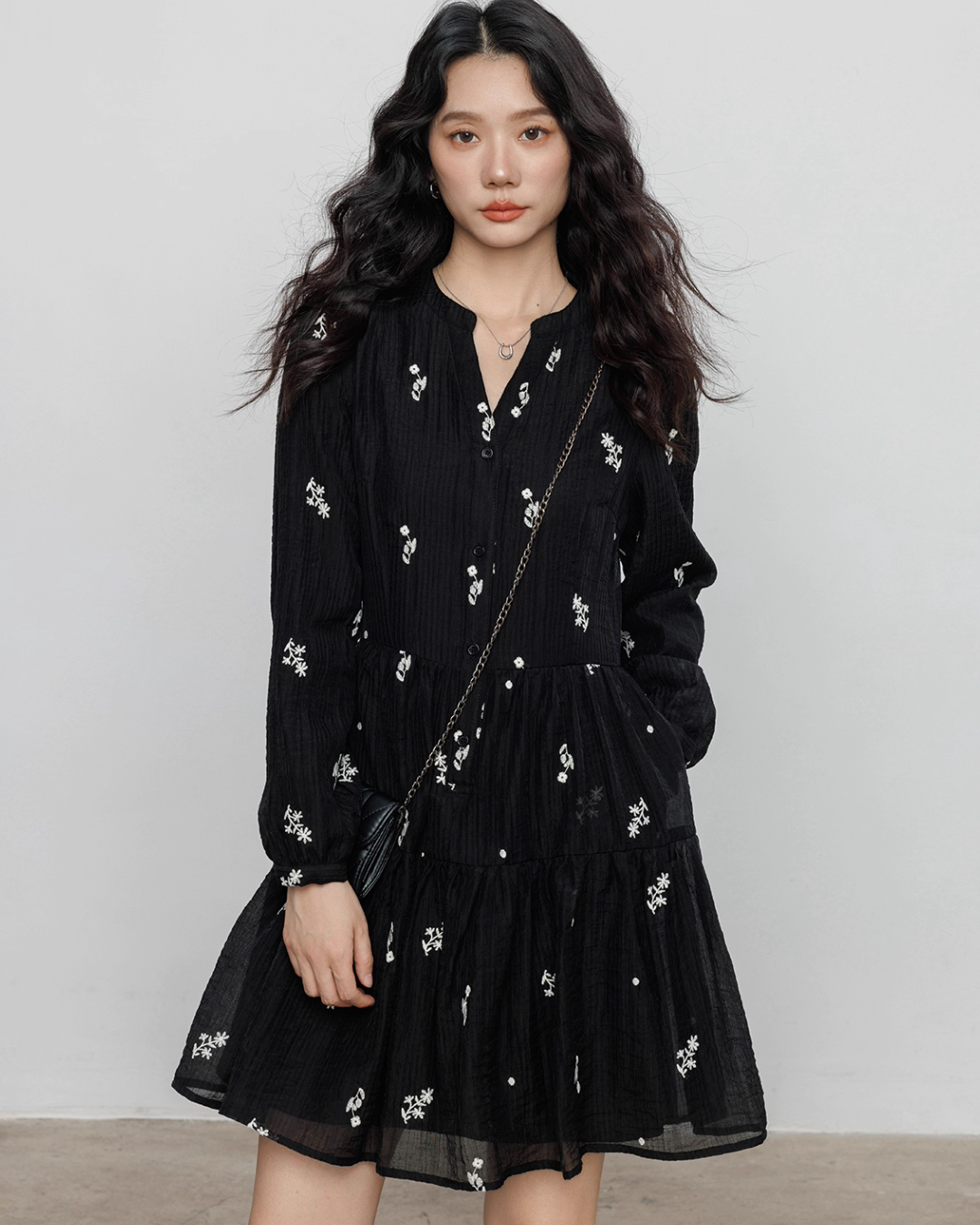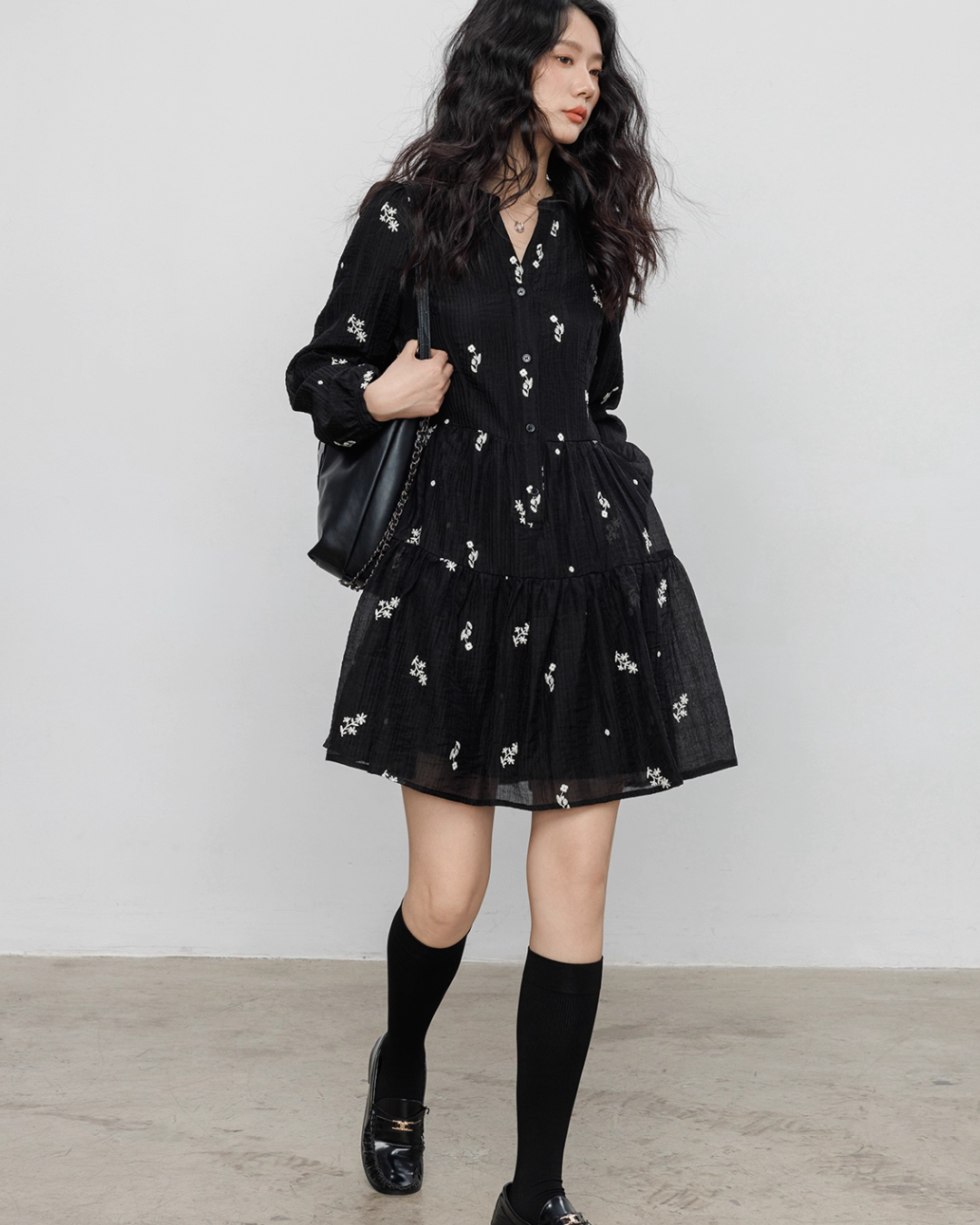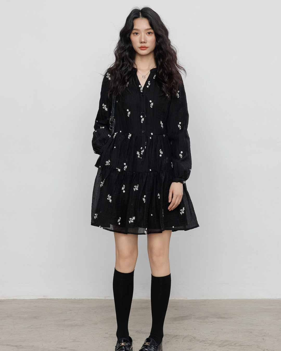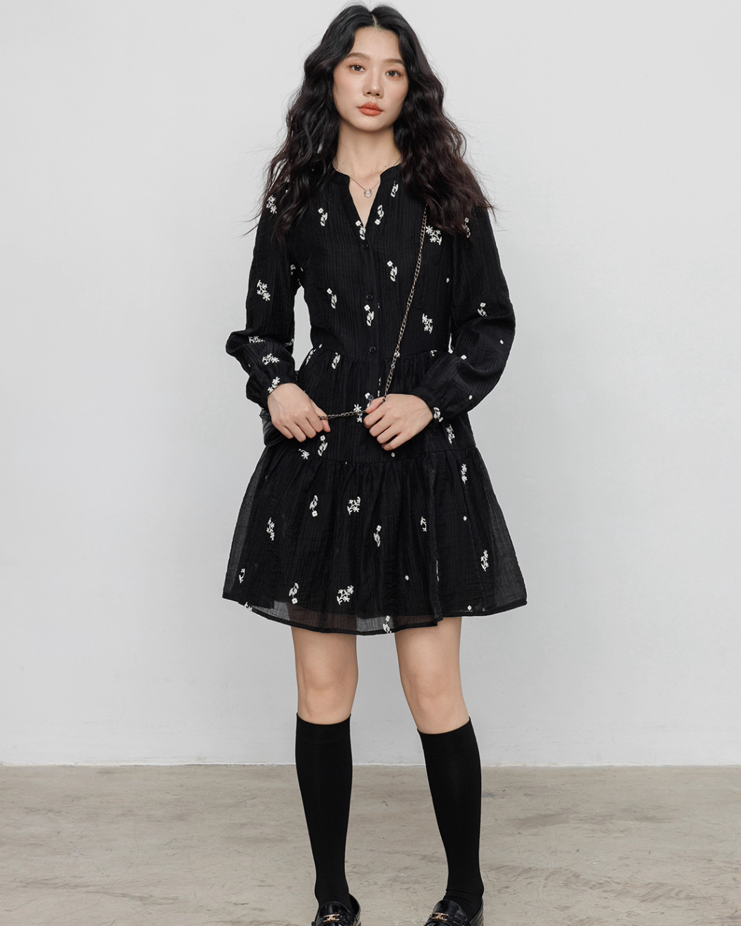 Flare one-piece dress adorned with floral embroidery.