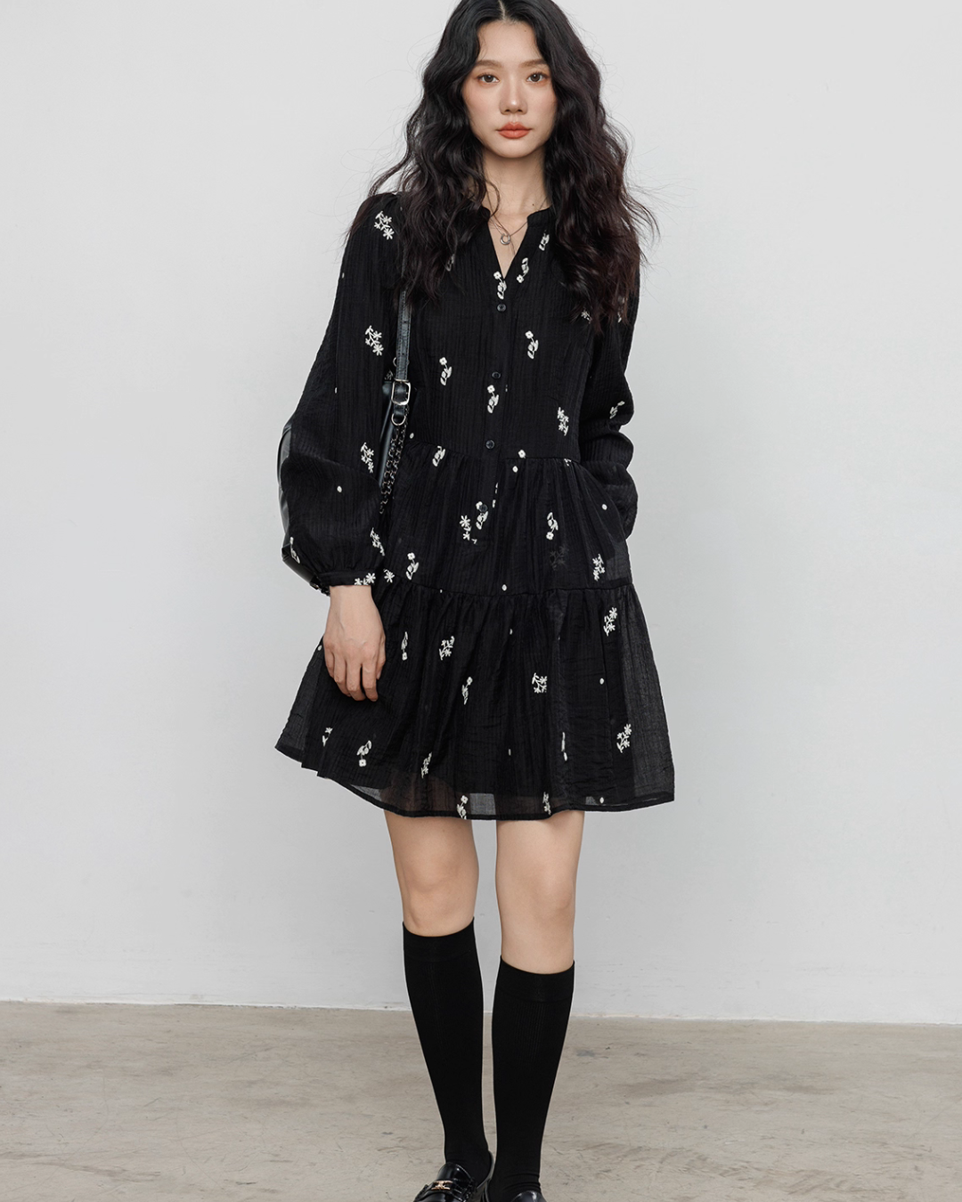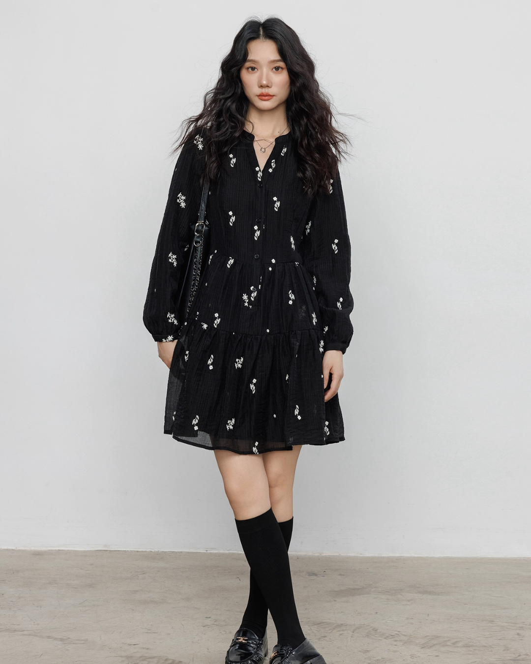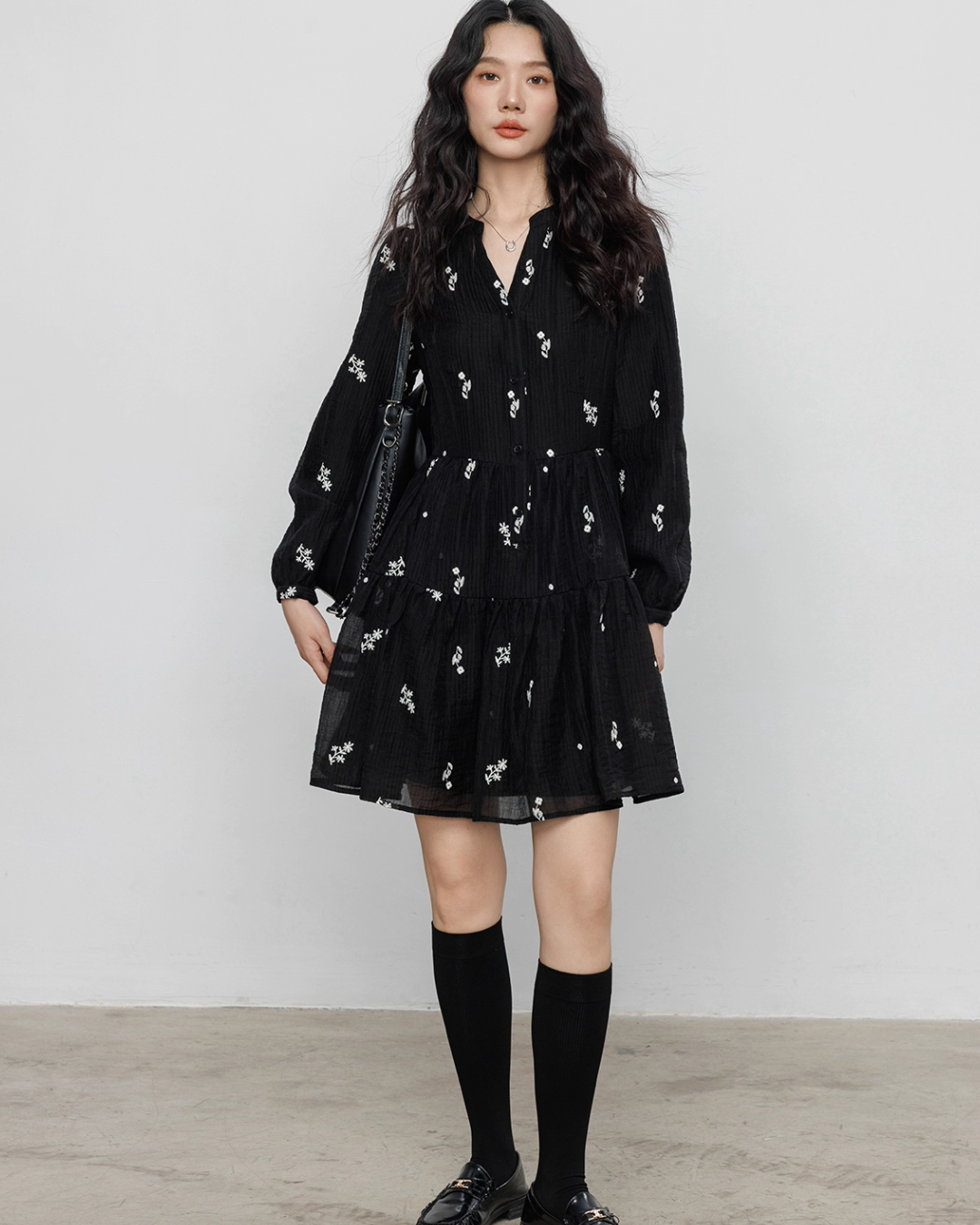 Flare one-piece dress adorned with floral embroidery.