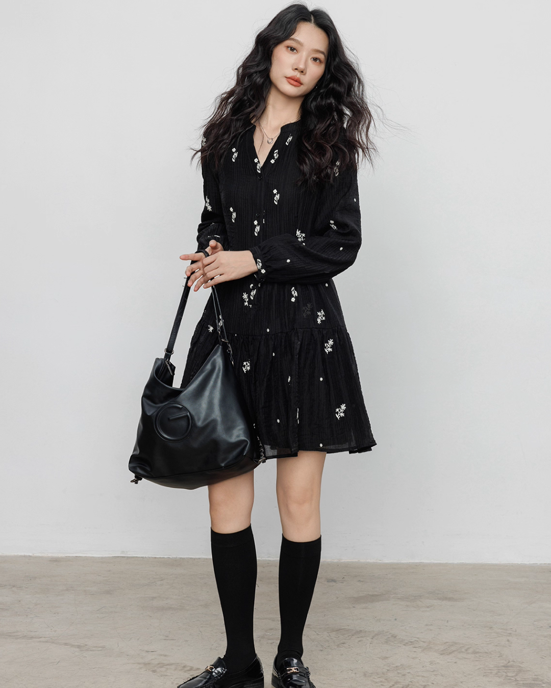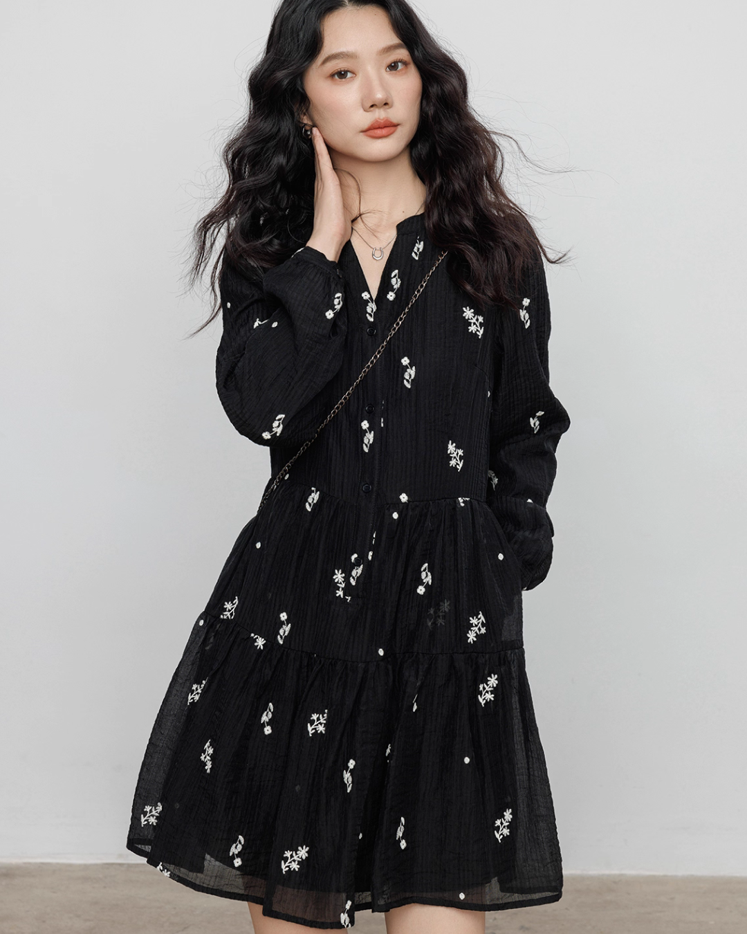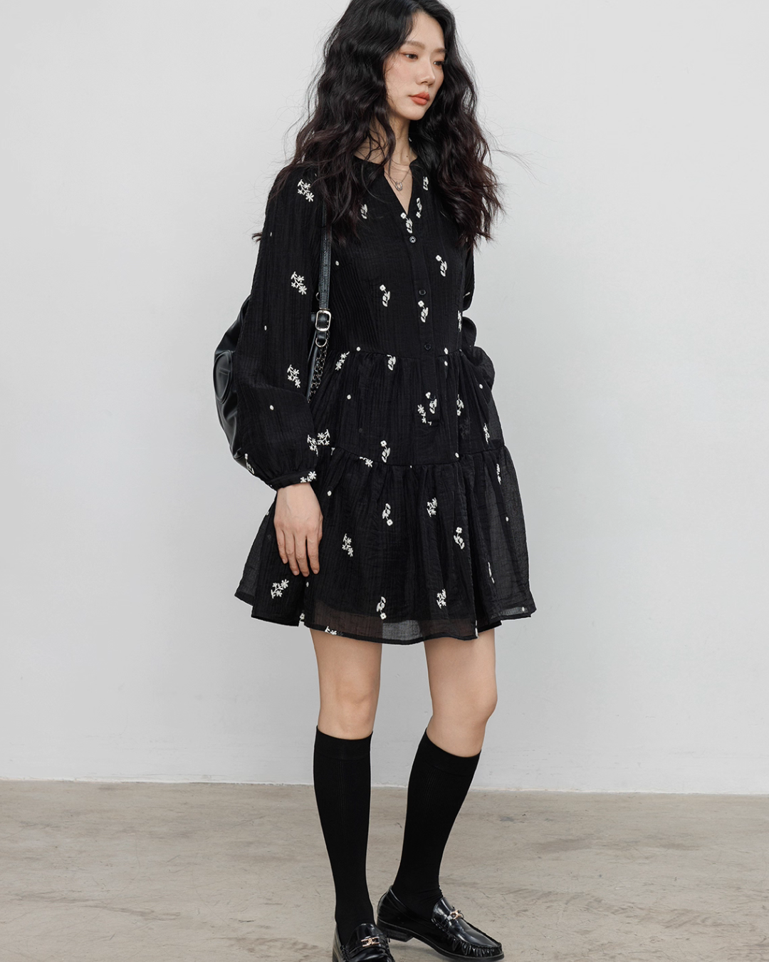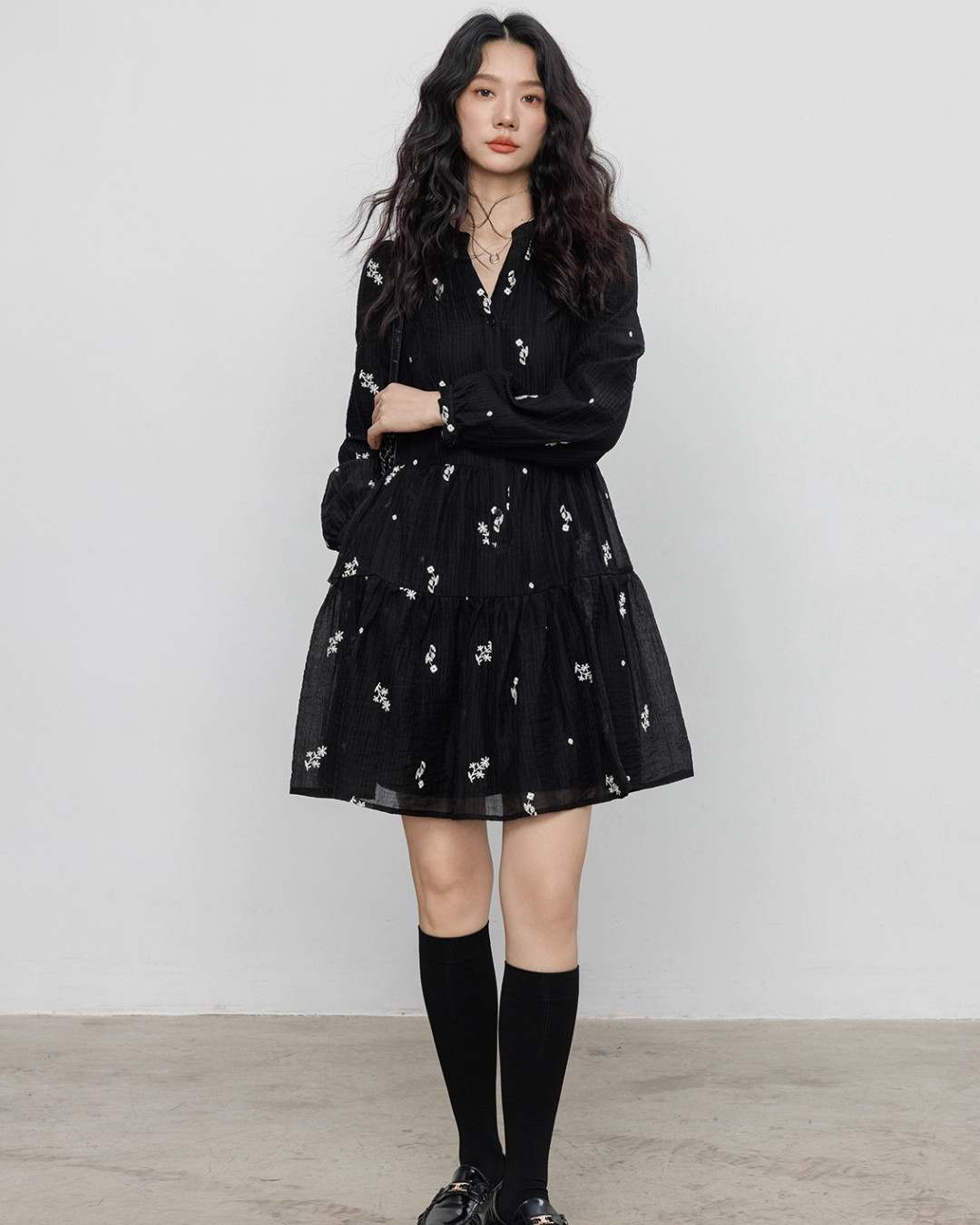 Flare one-piece dress adorned with floral embroidery.