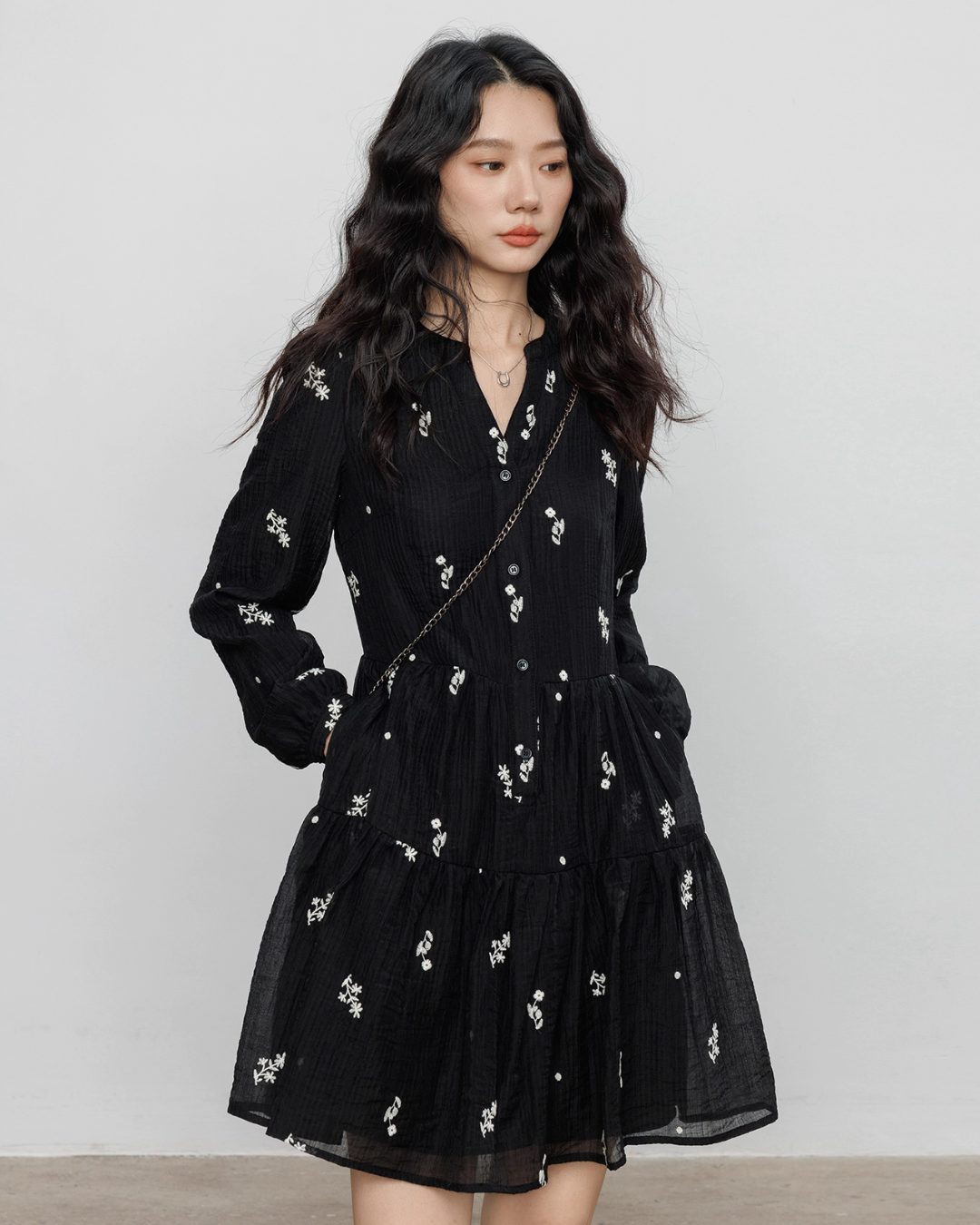 The flare that spreads towards the hem creates a feminine silhouette.