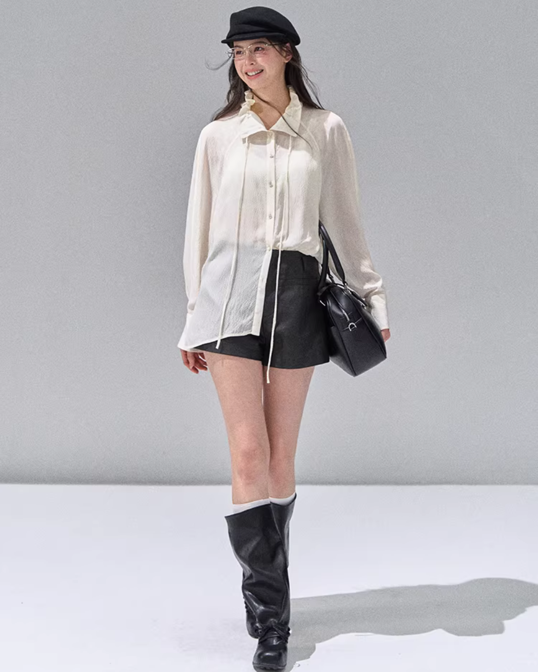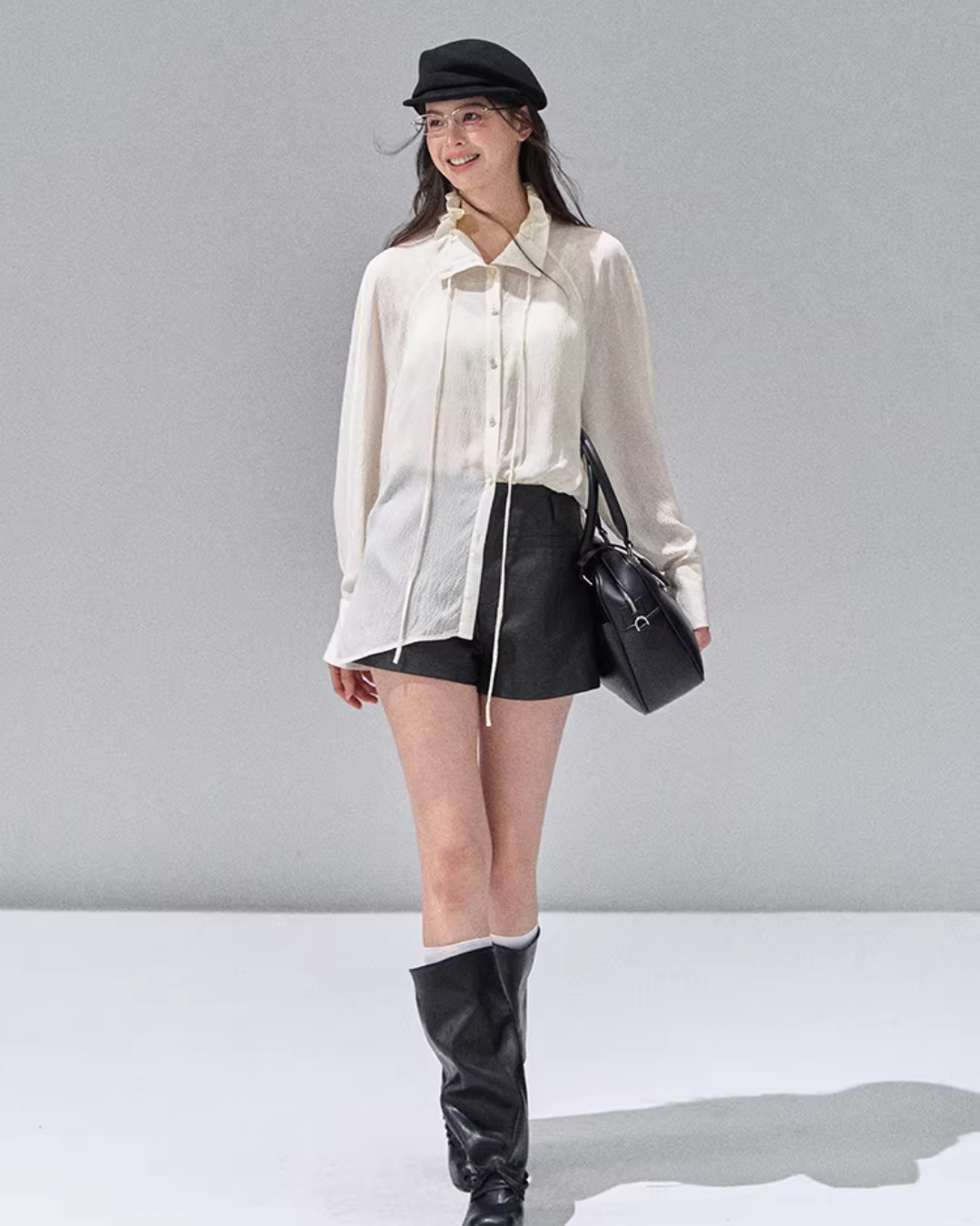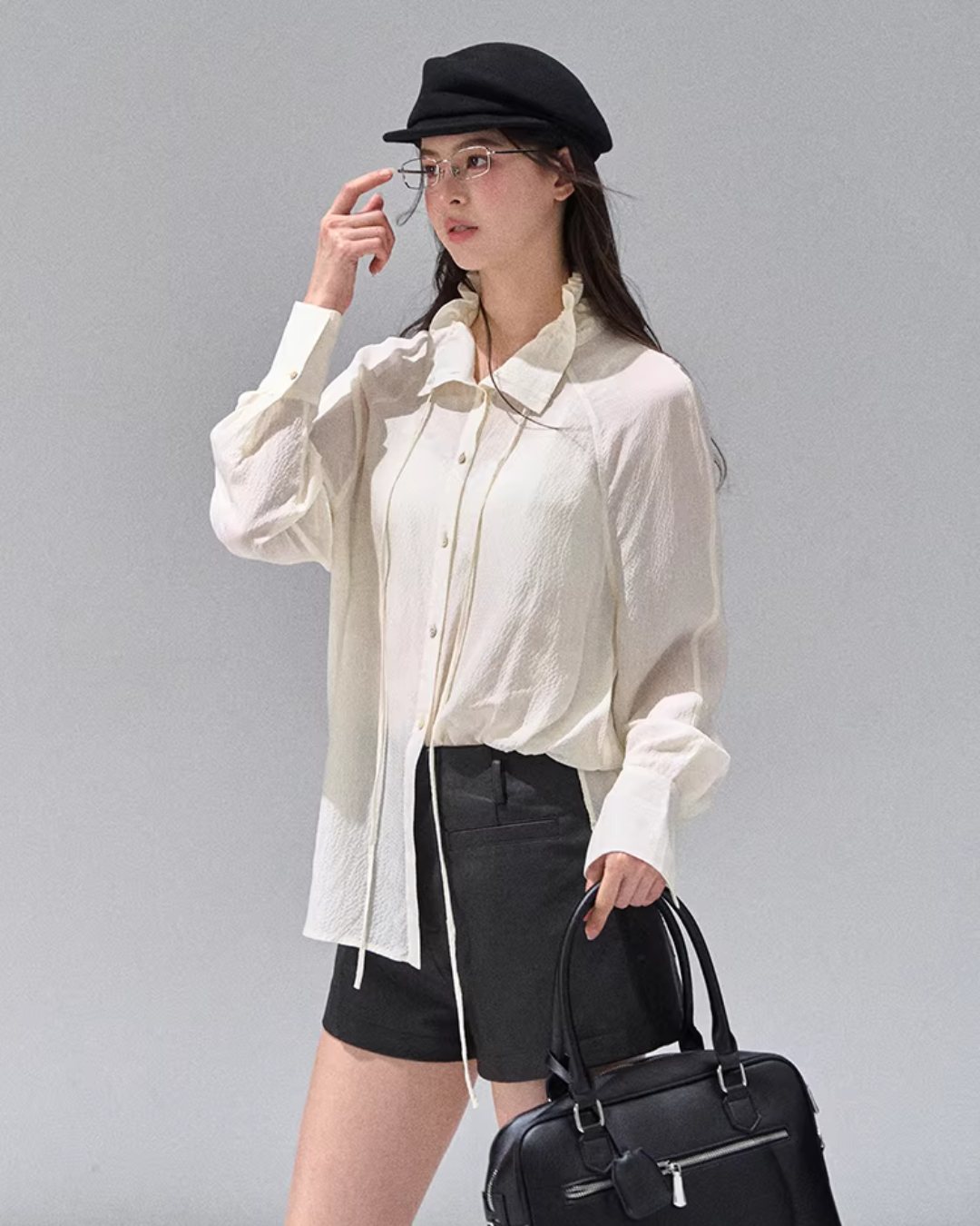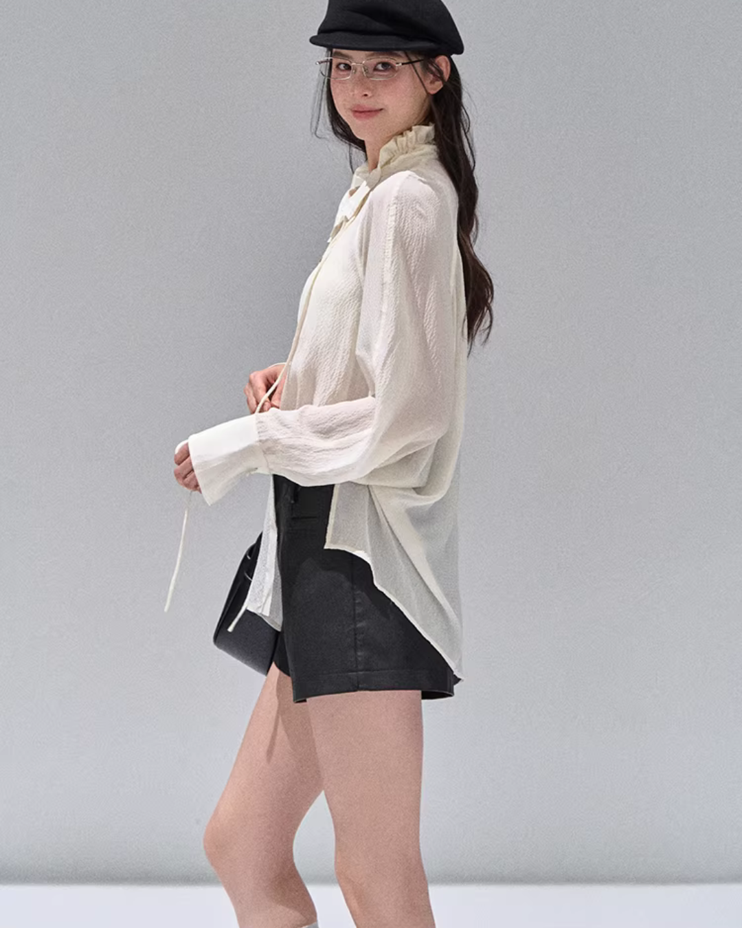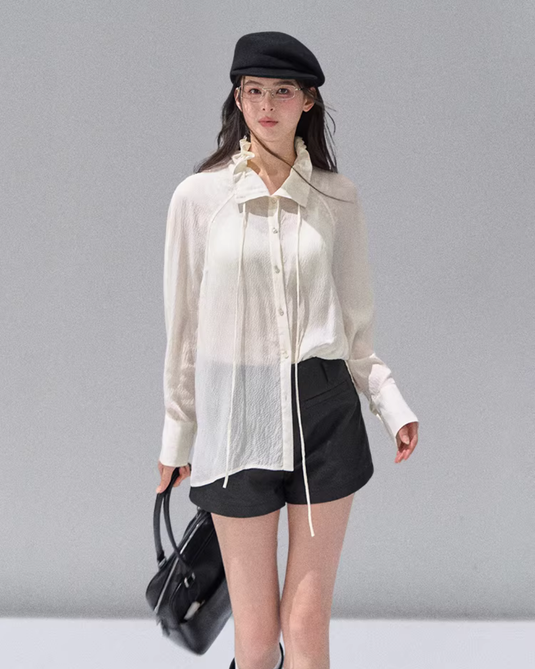 A long-sleeved shirt with a crumpled texture and transparency that creates nuance.