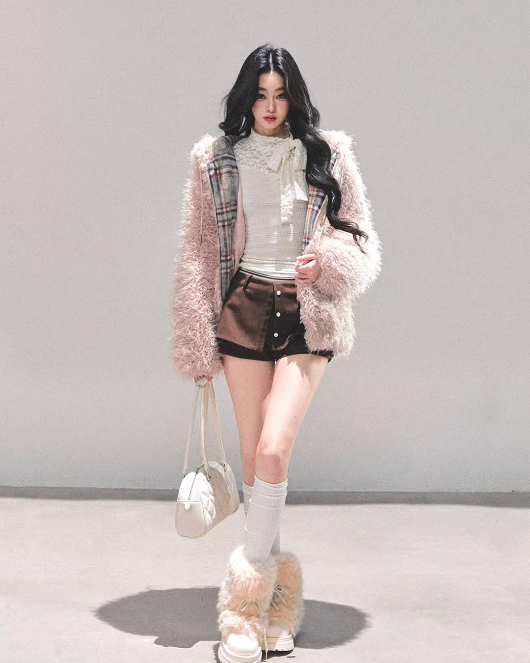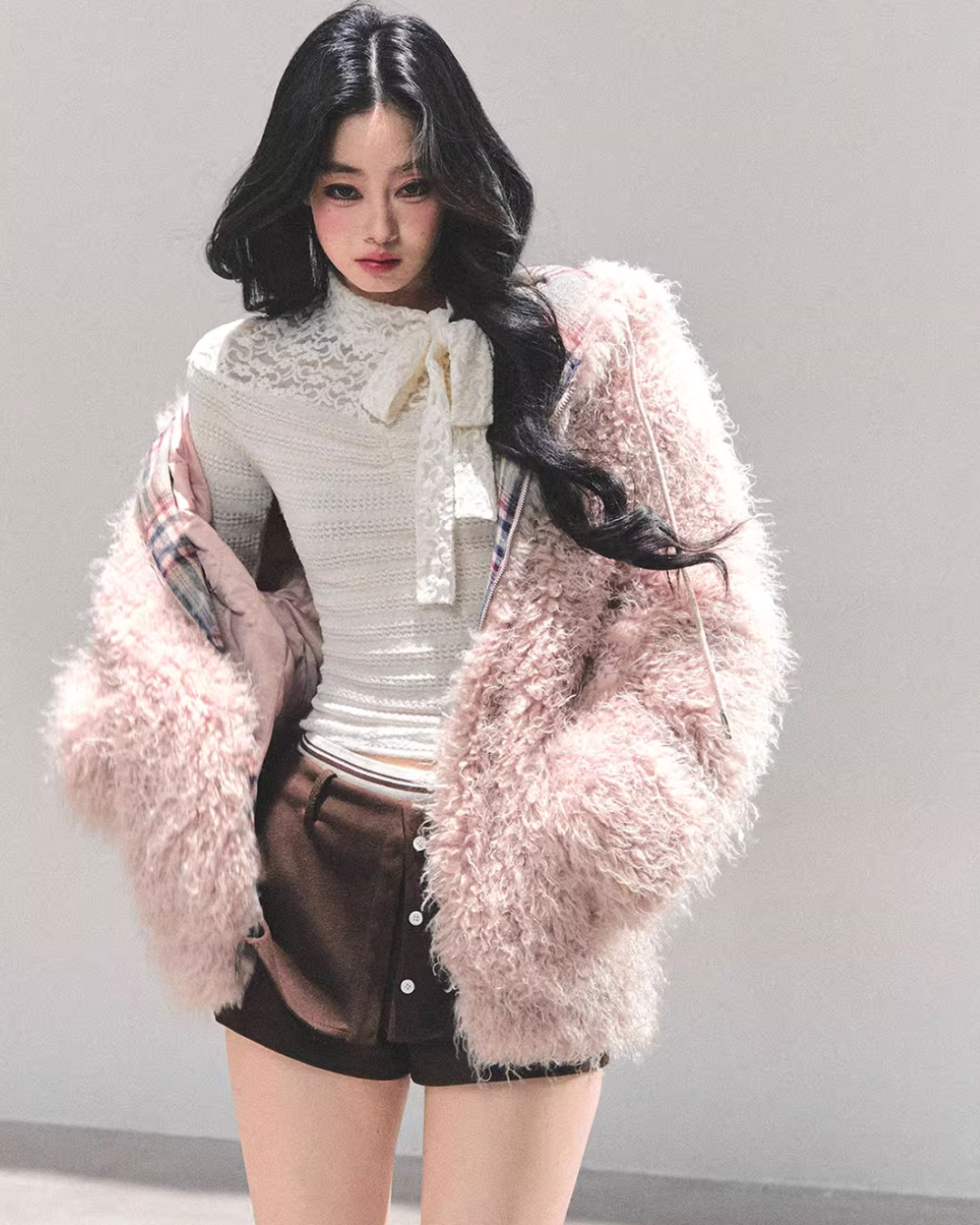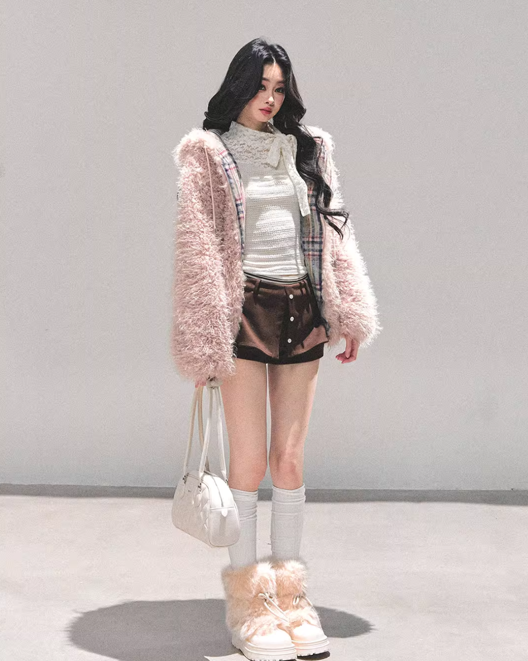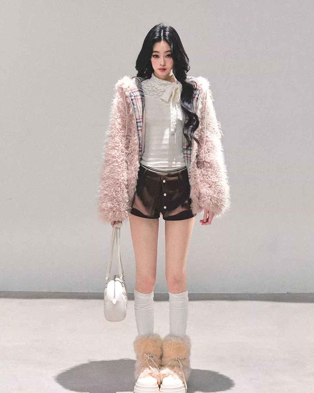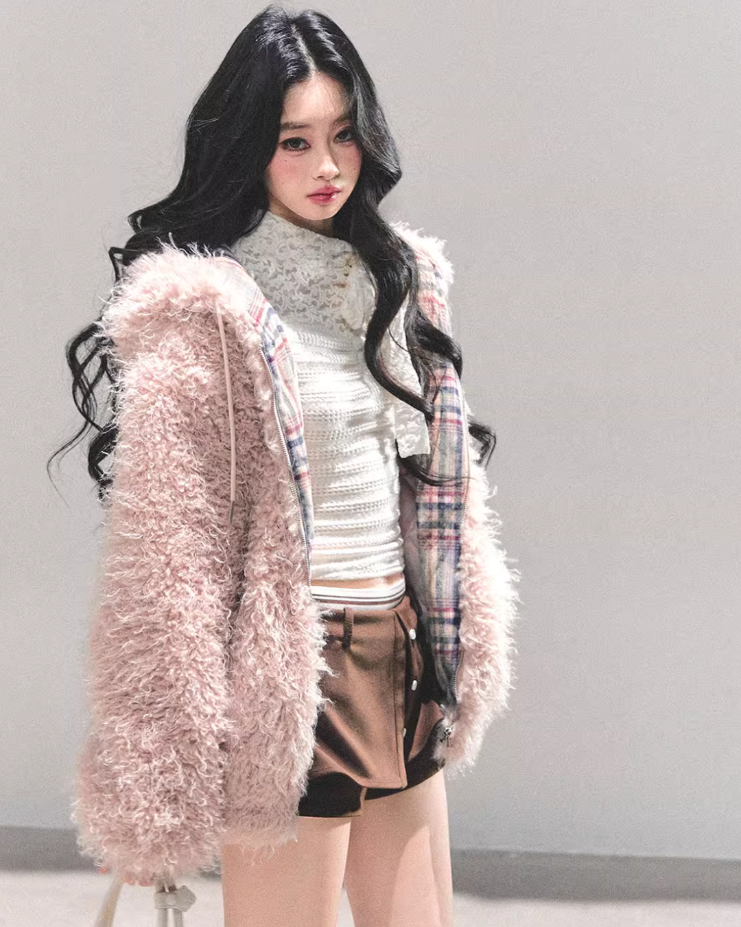 A fluffy fur jacket with a voluminous feel that makes you want to touch it.