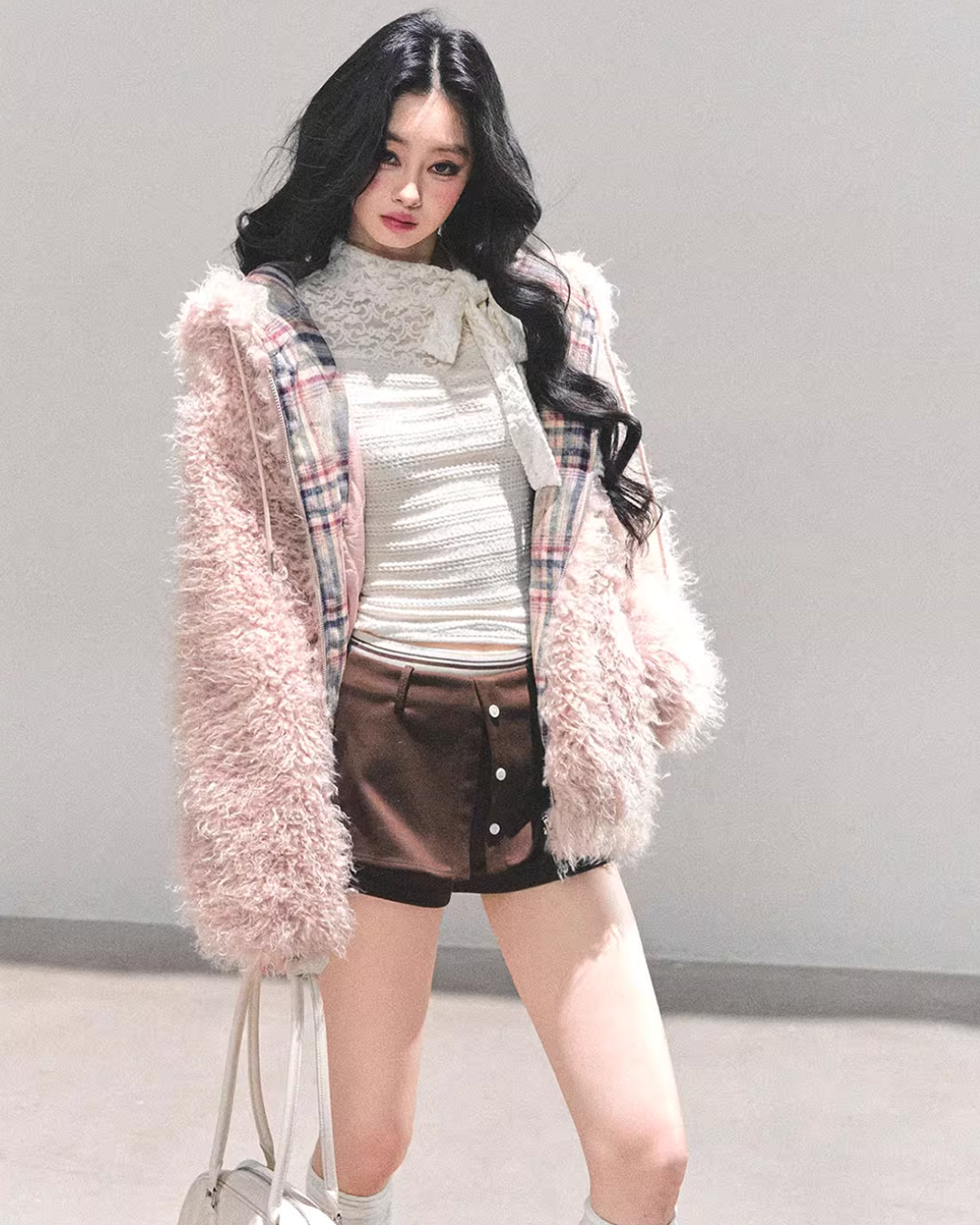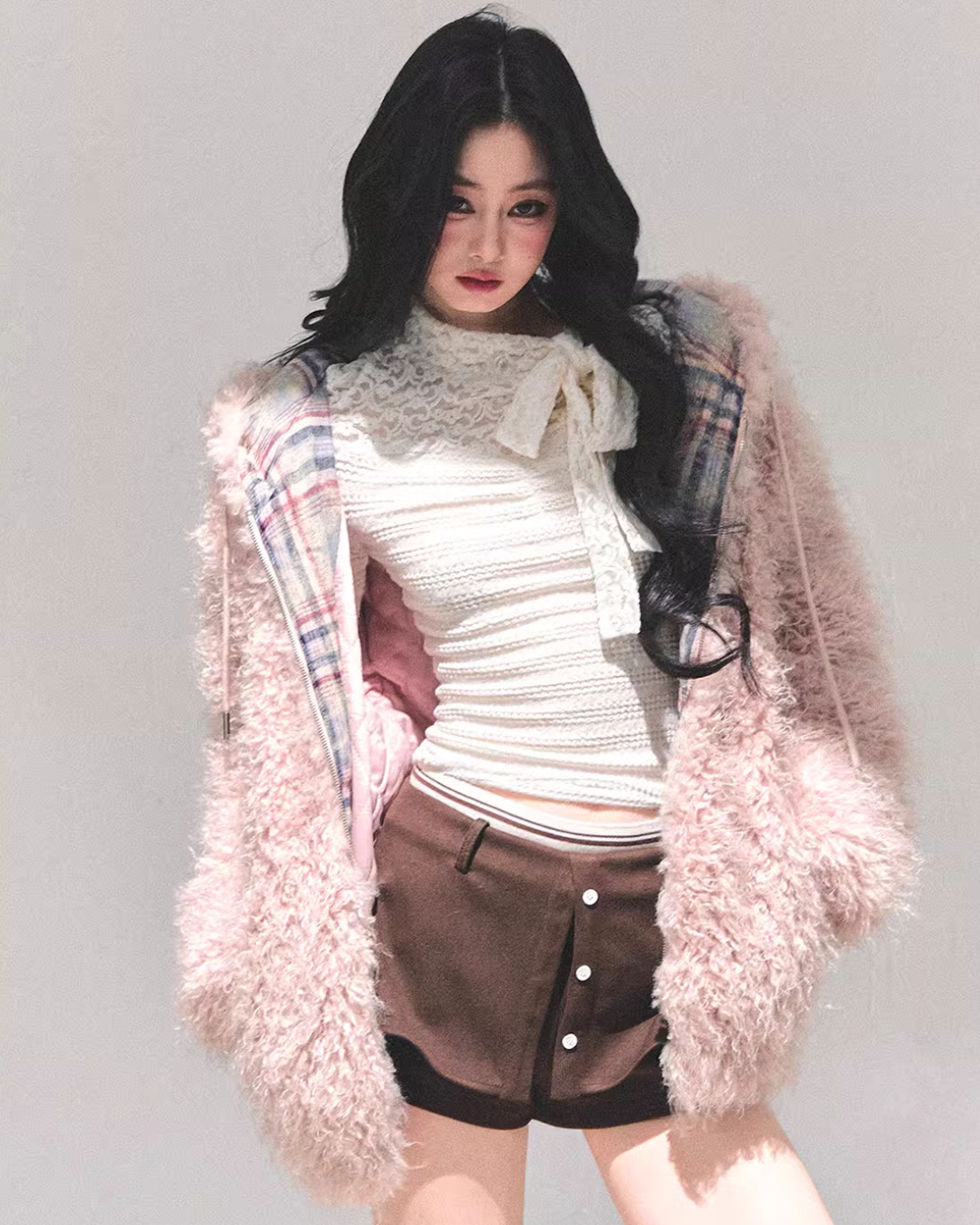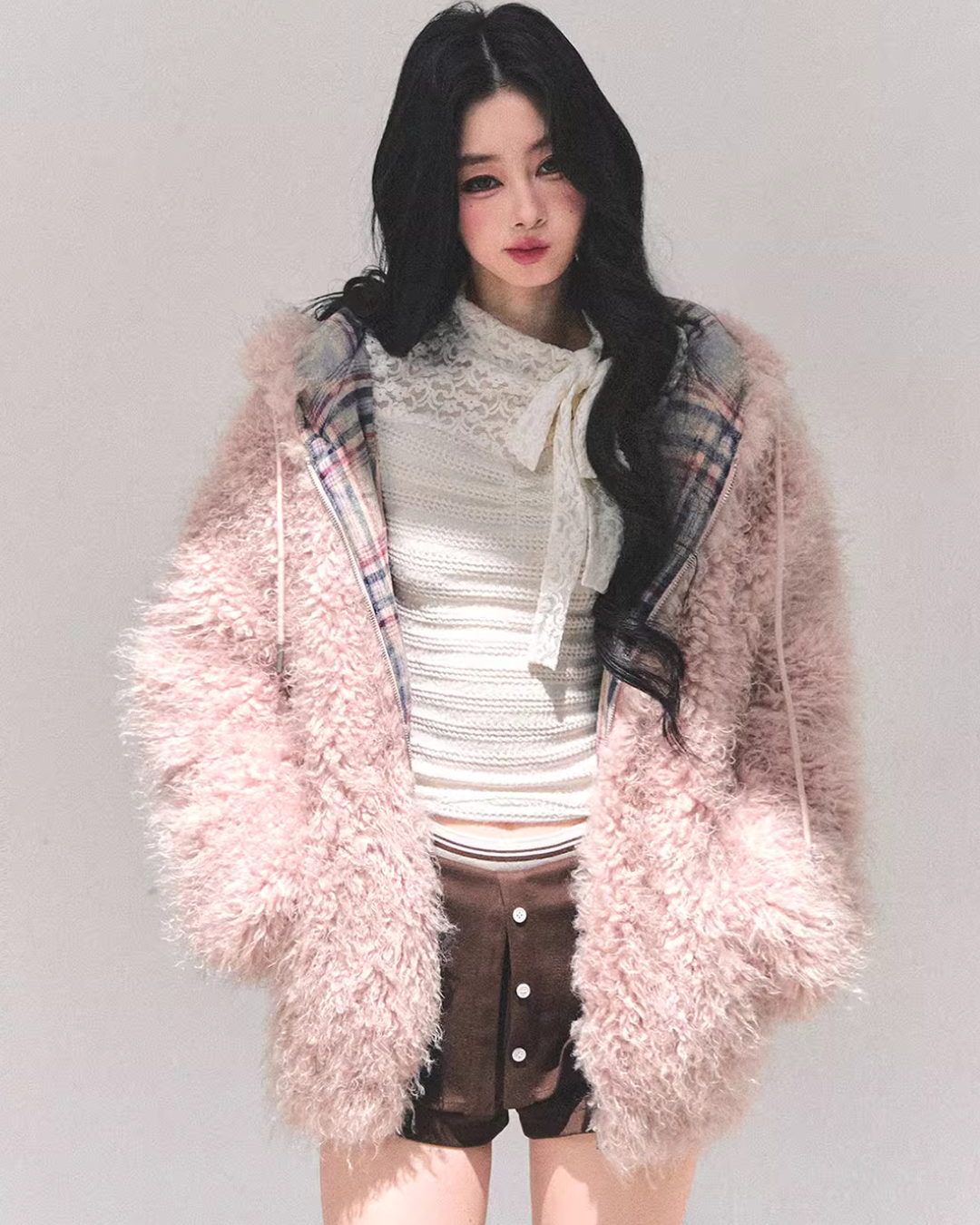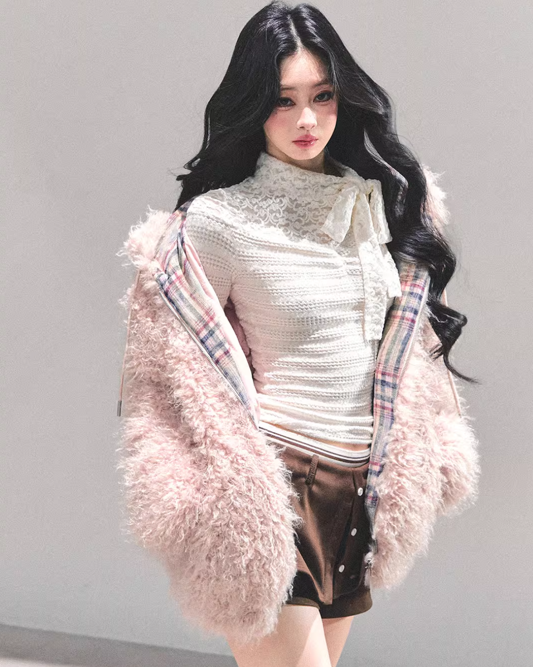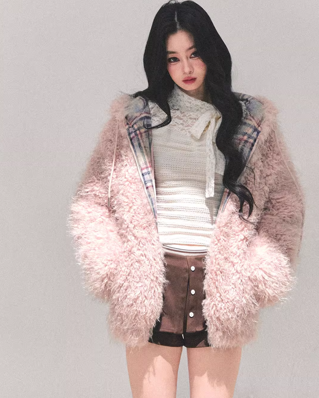 A fluffy fur jacket with a voluminous feel that makes you want to touch it.