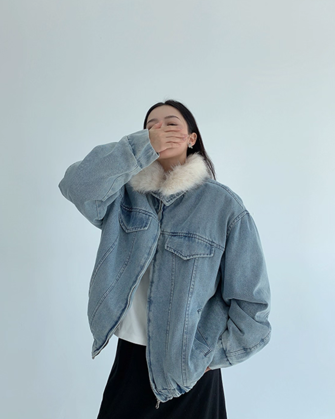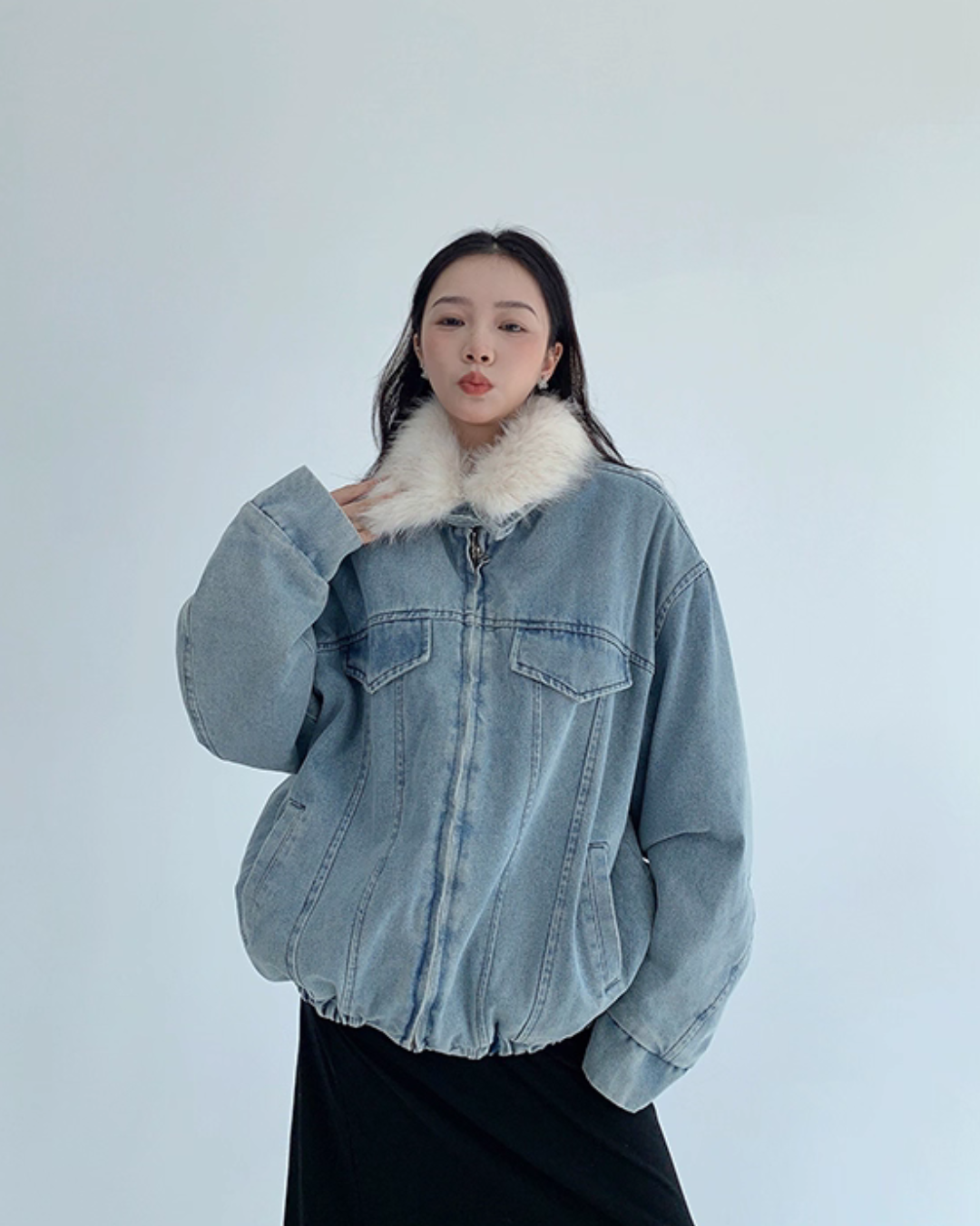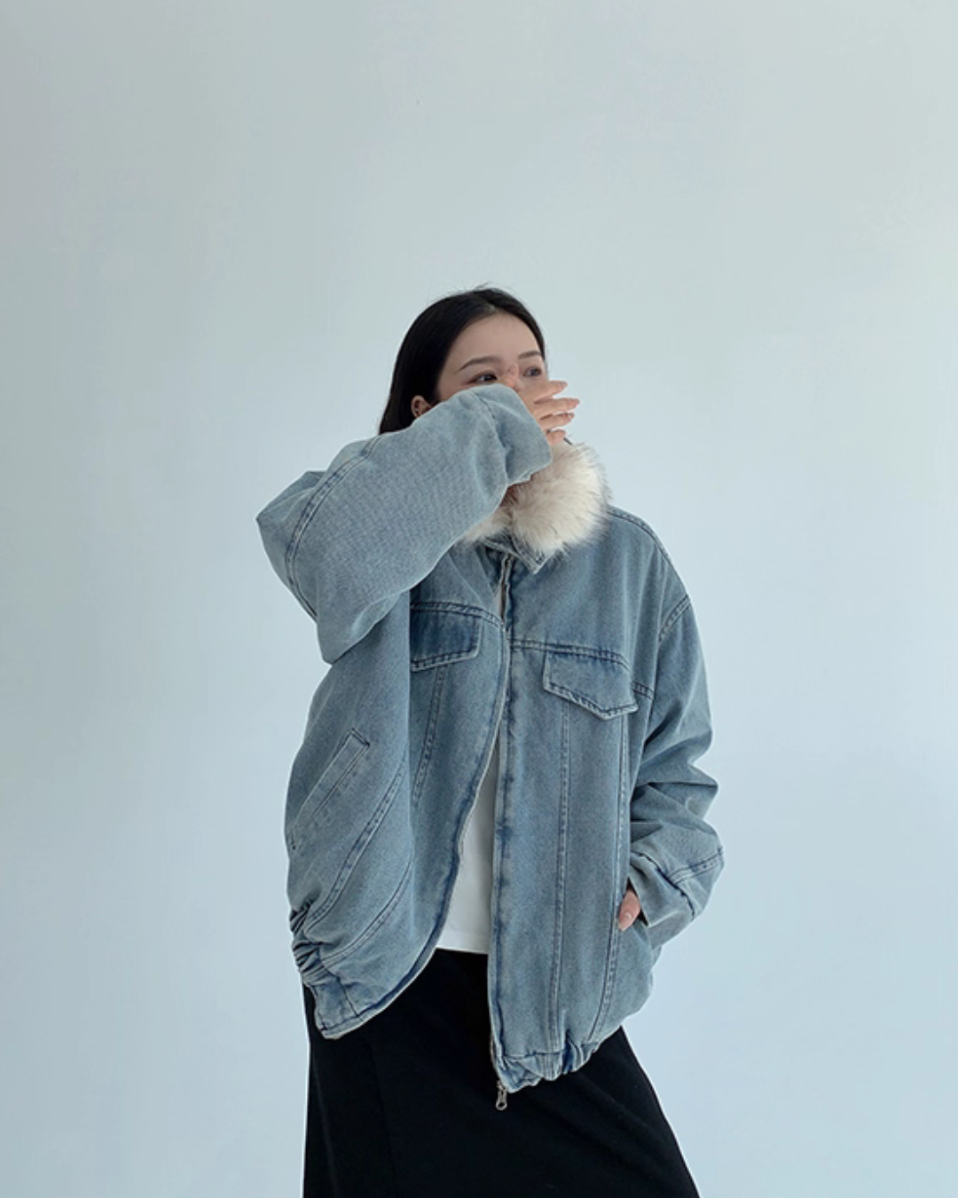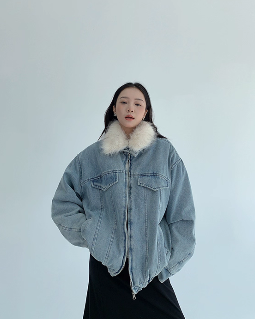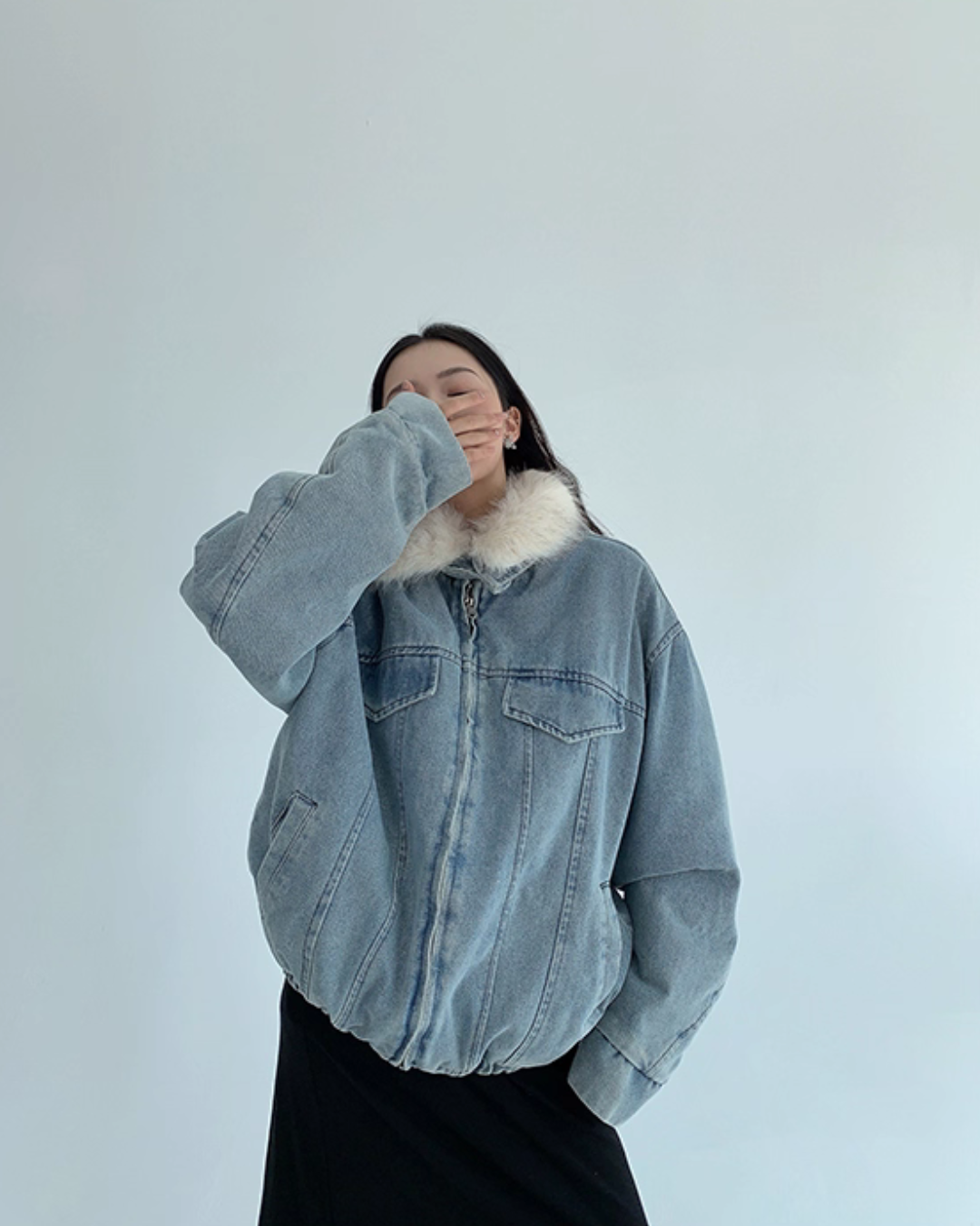 A denim jacket with a collar made of fluffy eco-fur material as an accent.