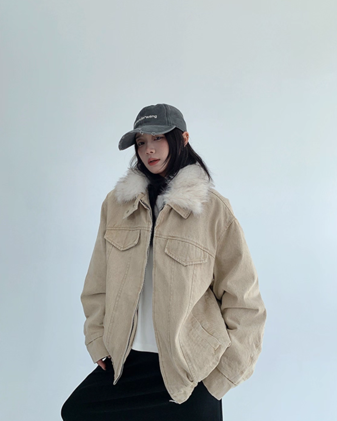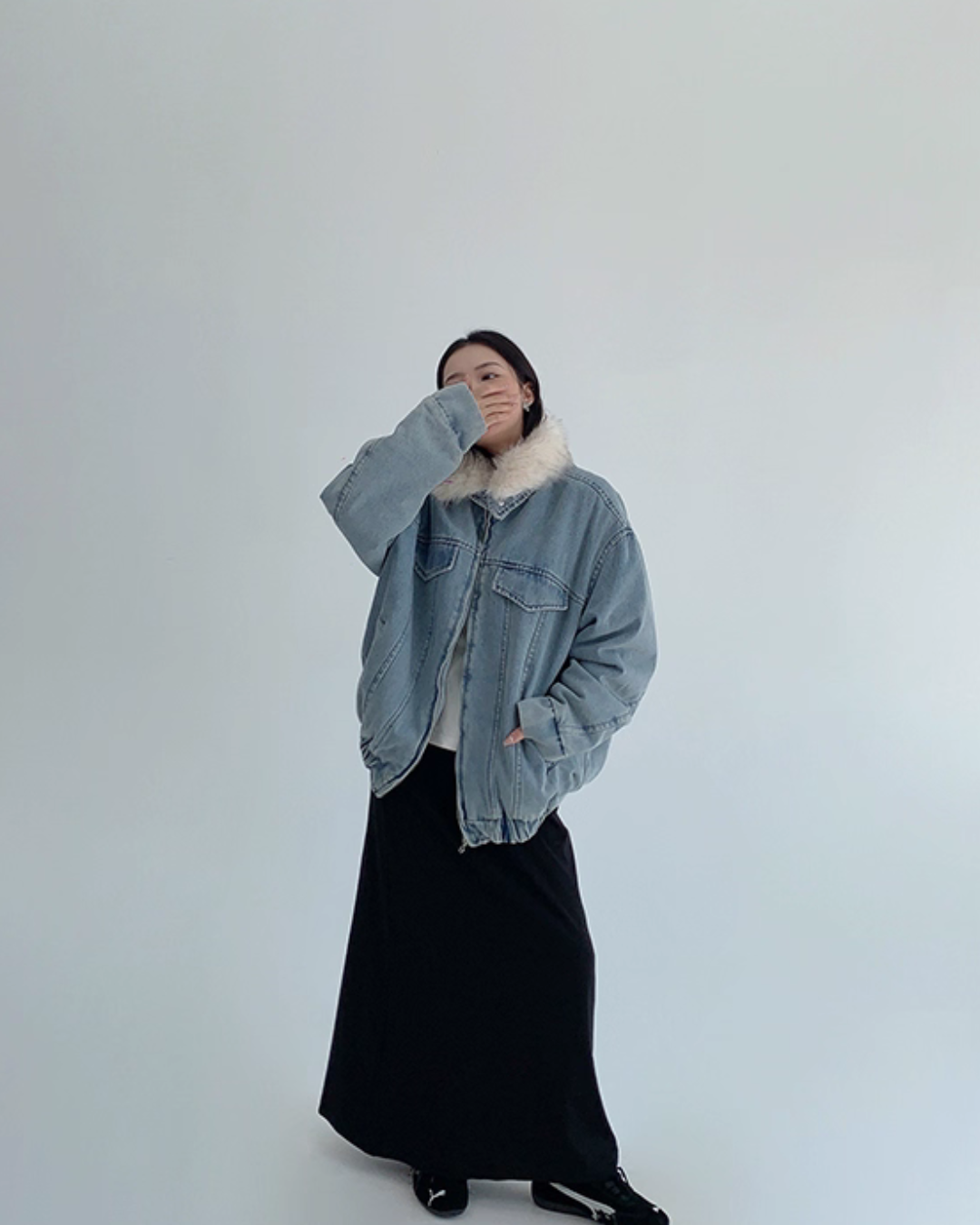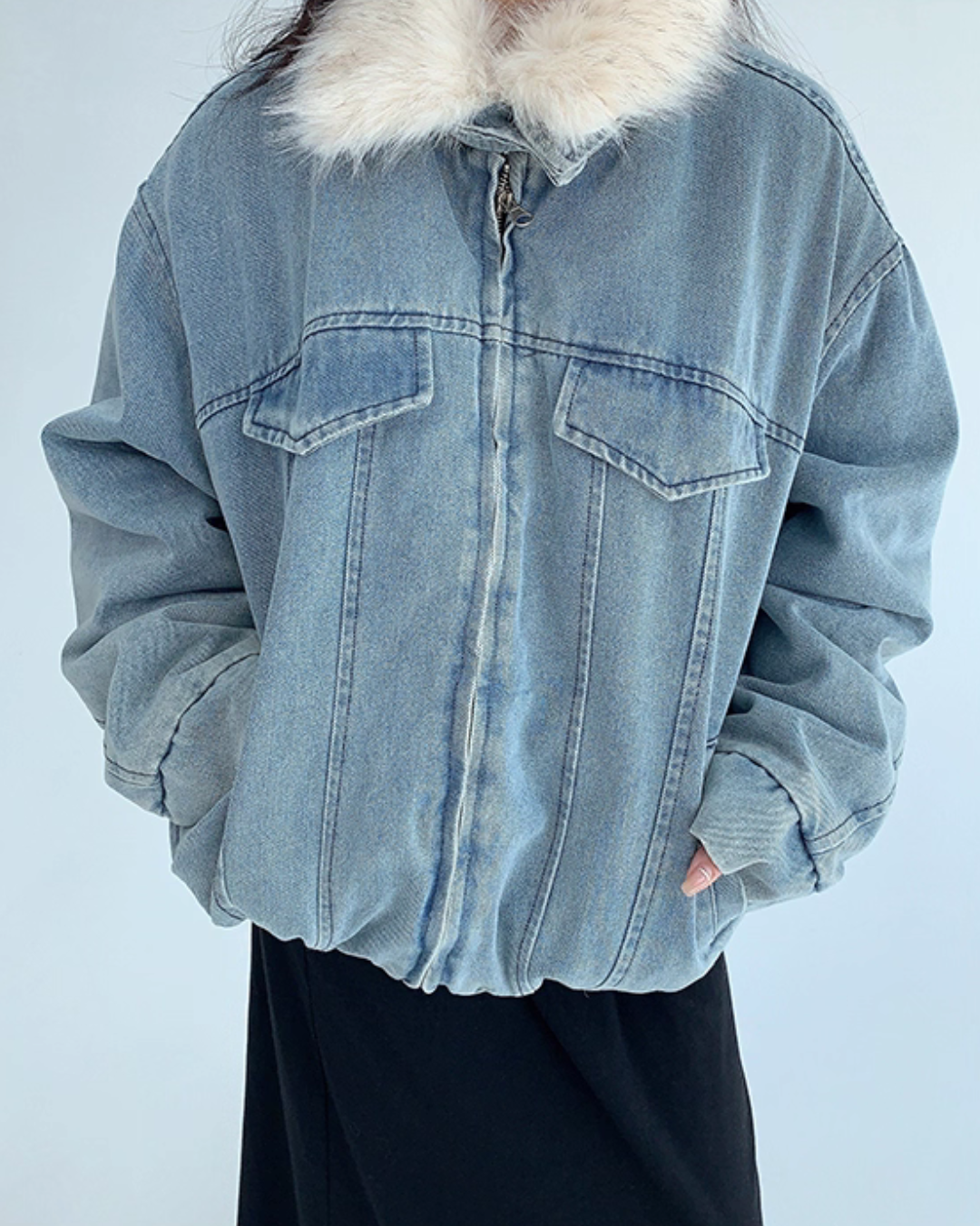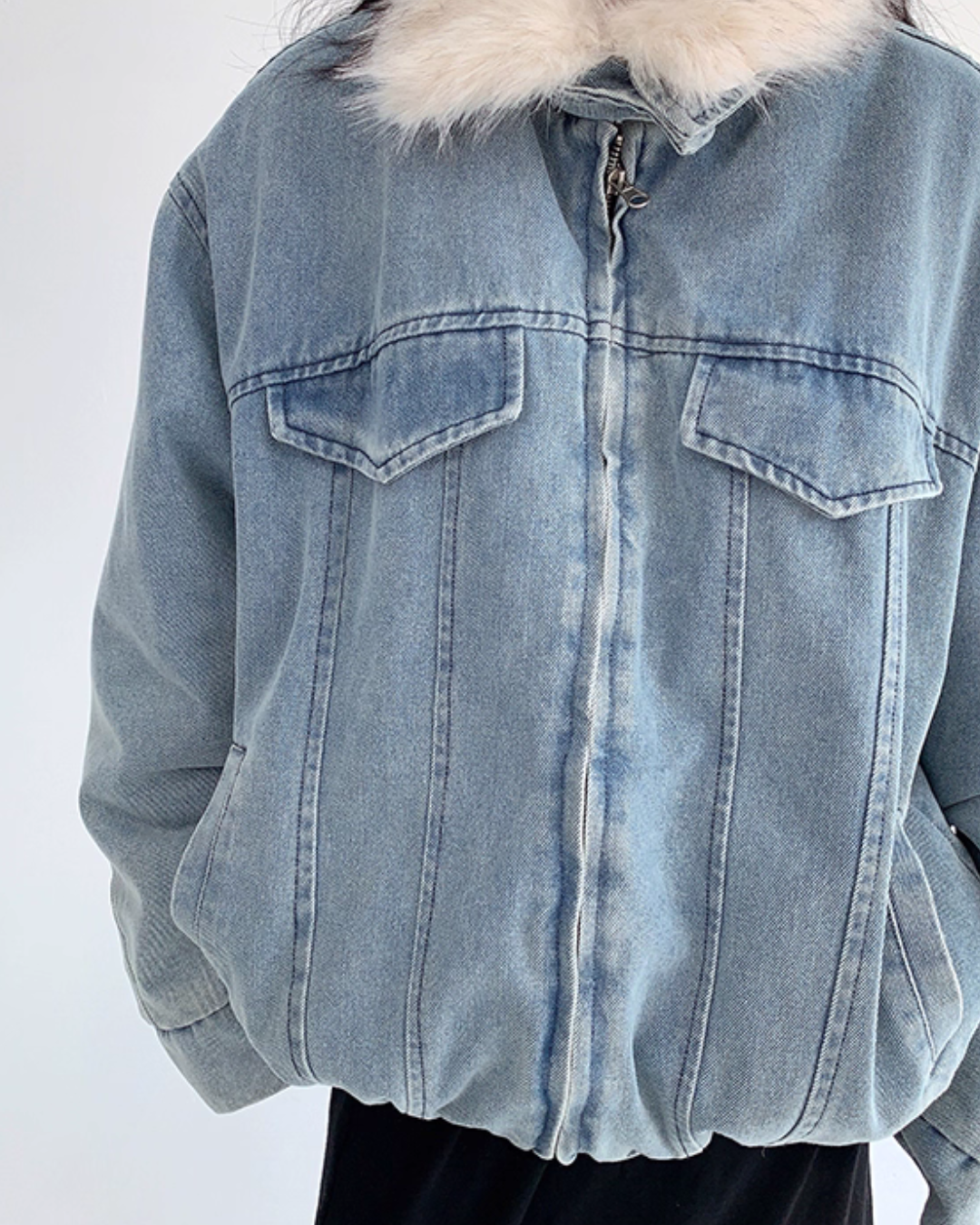 A denim jacket with a collar made of fluffy eco-fur material as an accent.