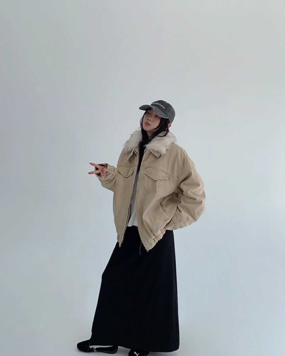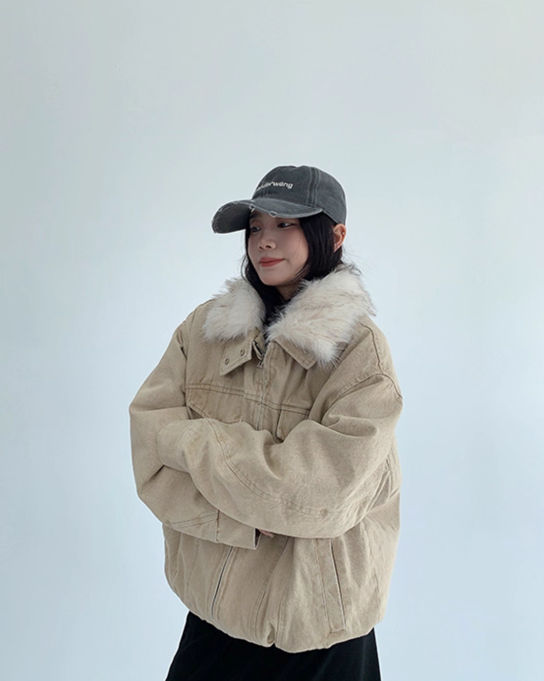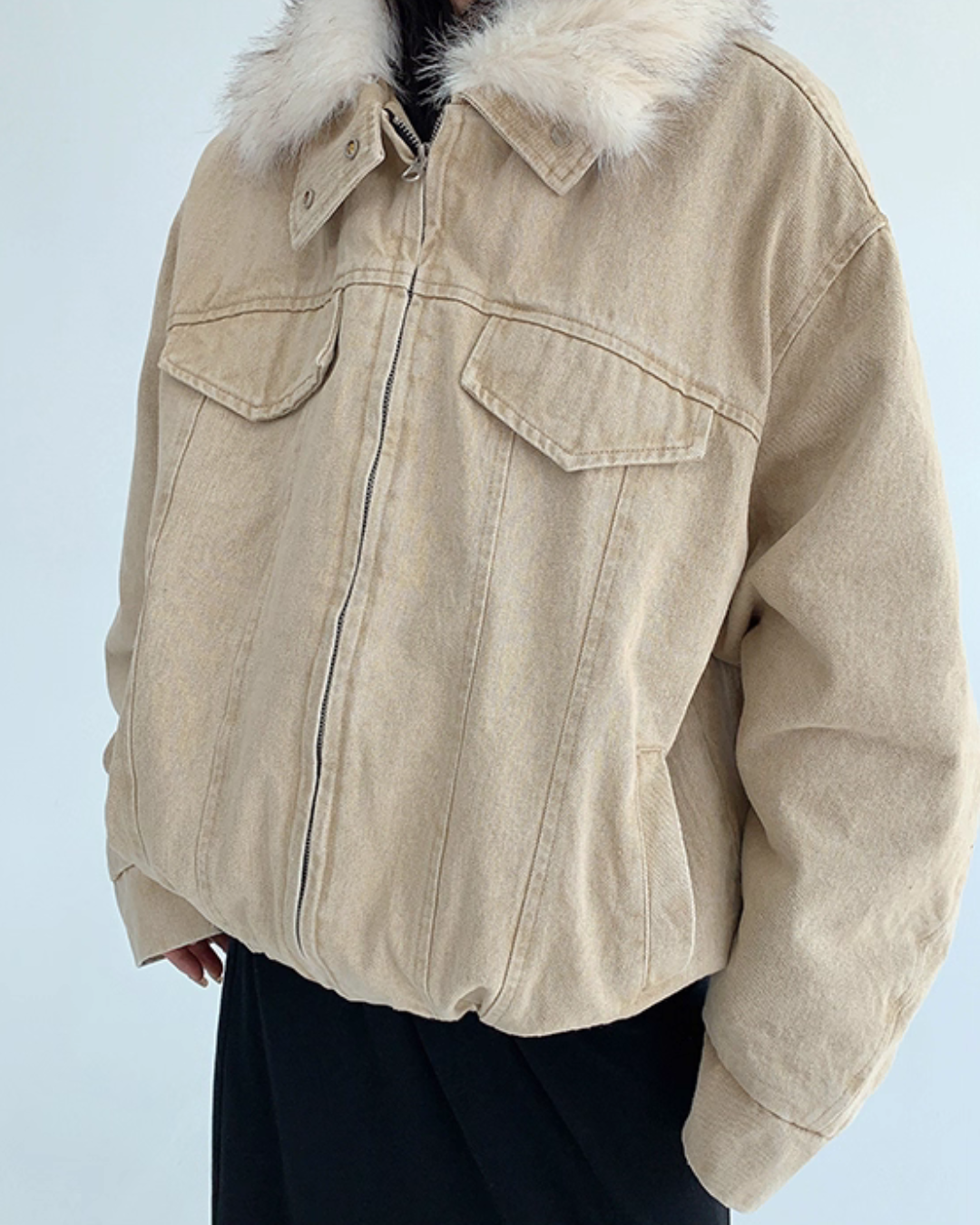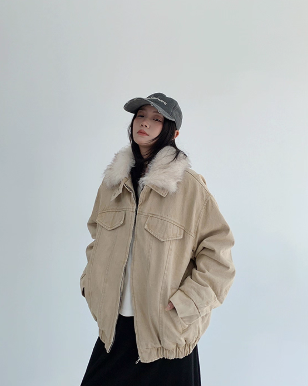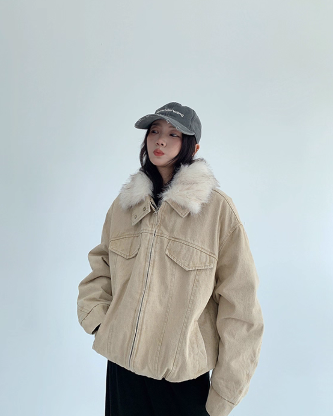 A denim jacket with a collar made of fluffy eco-fur material as an accent.