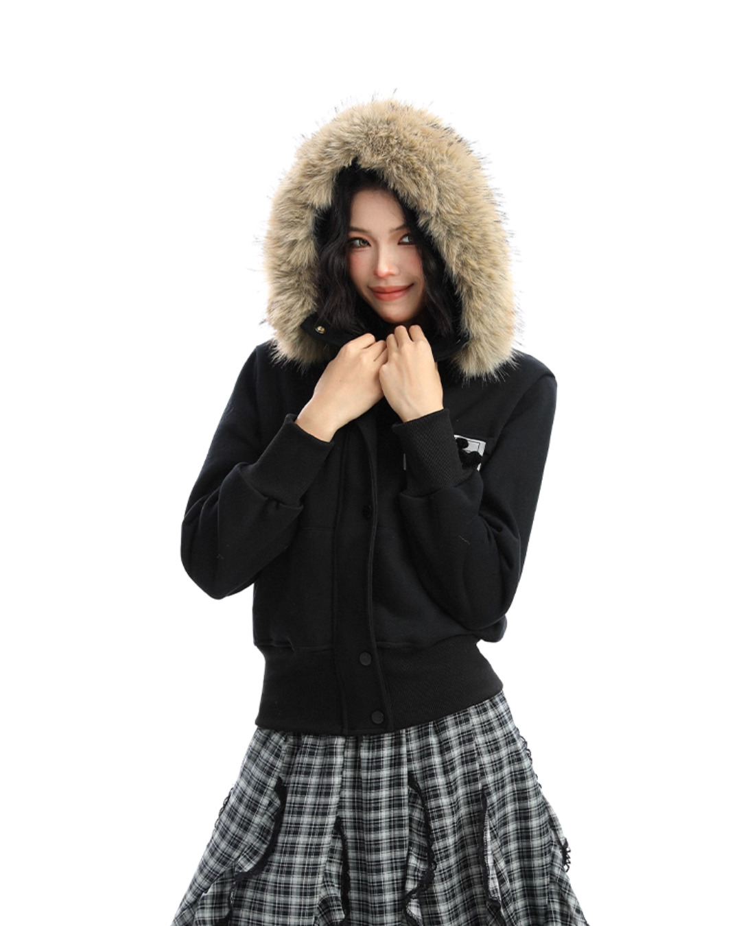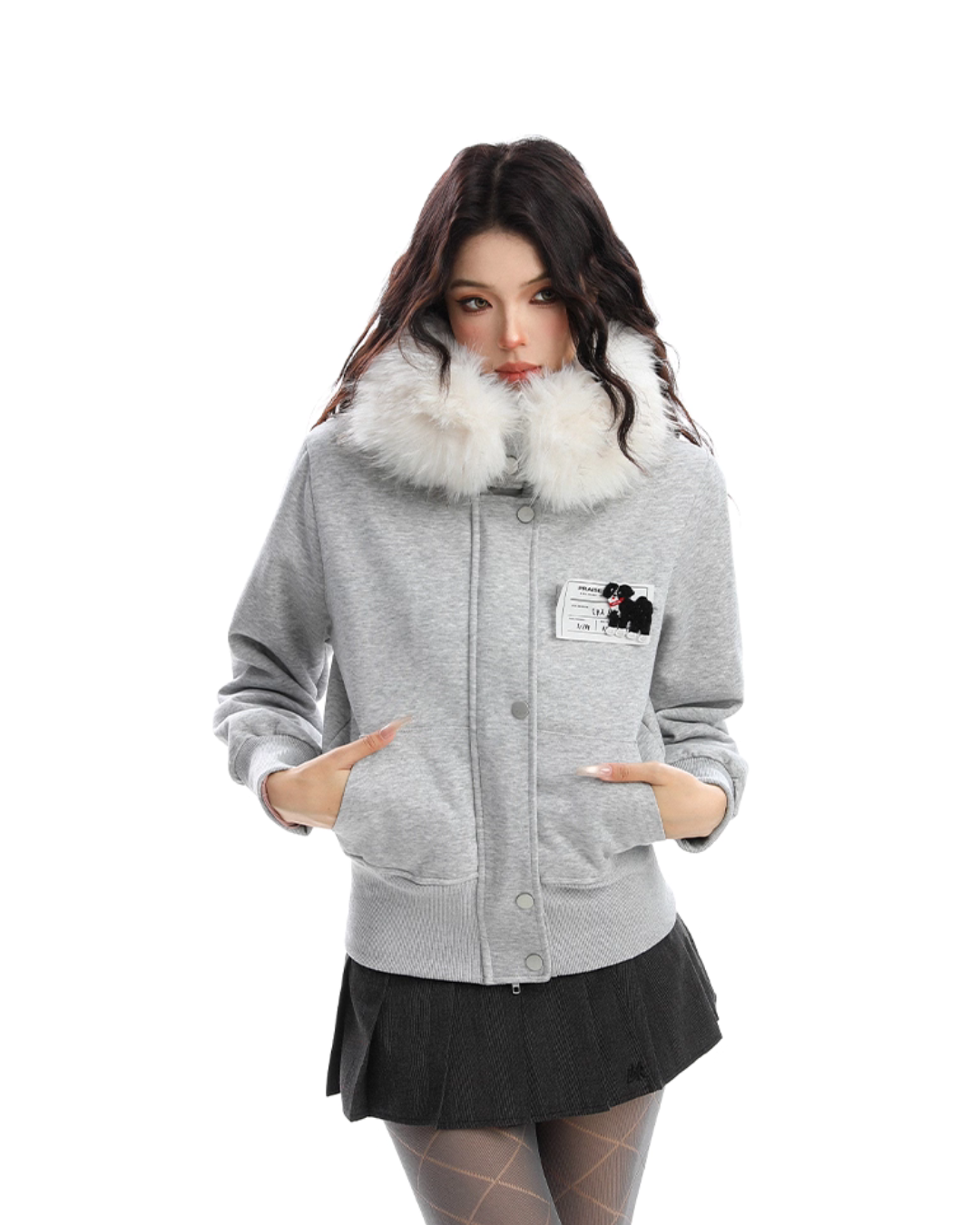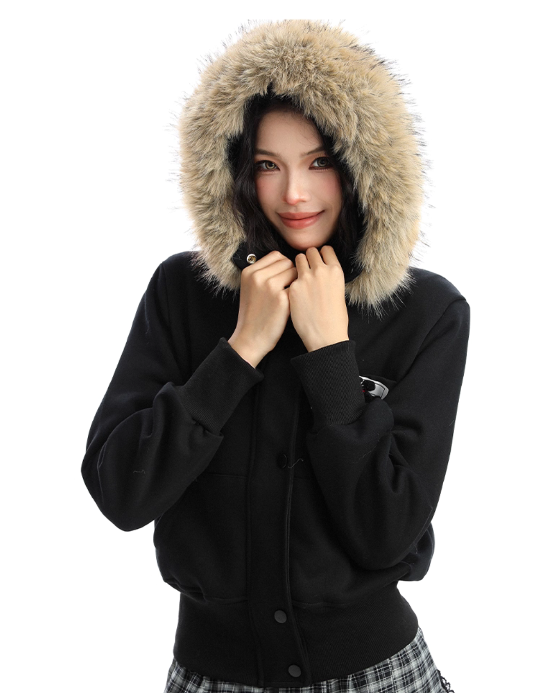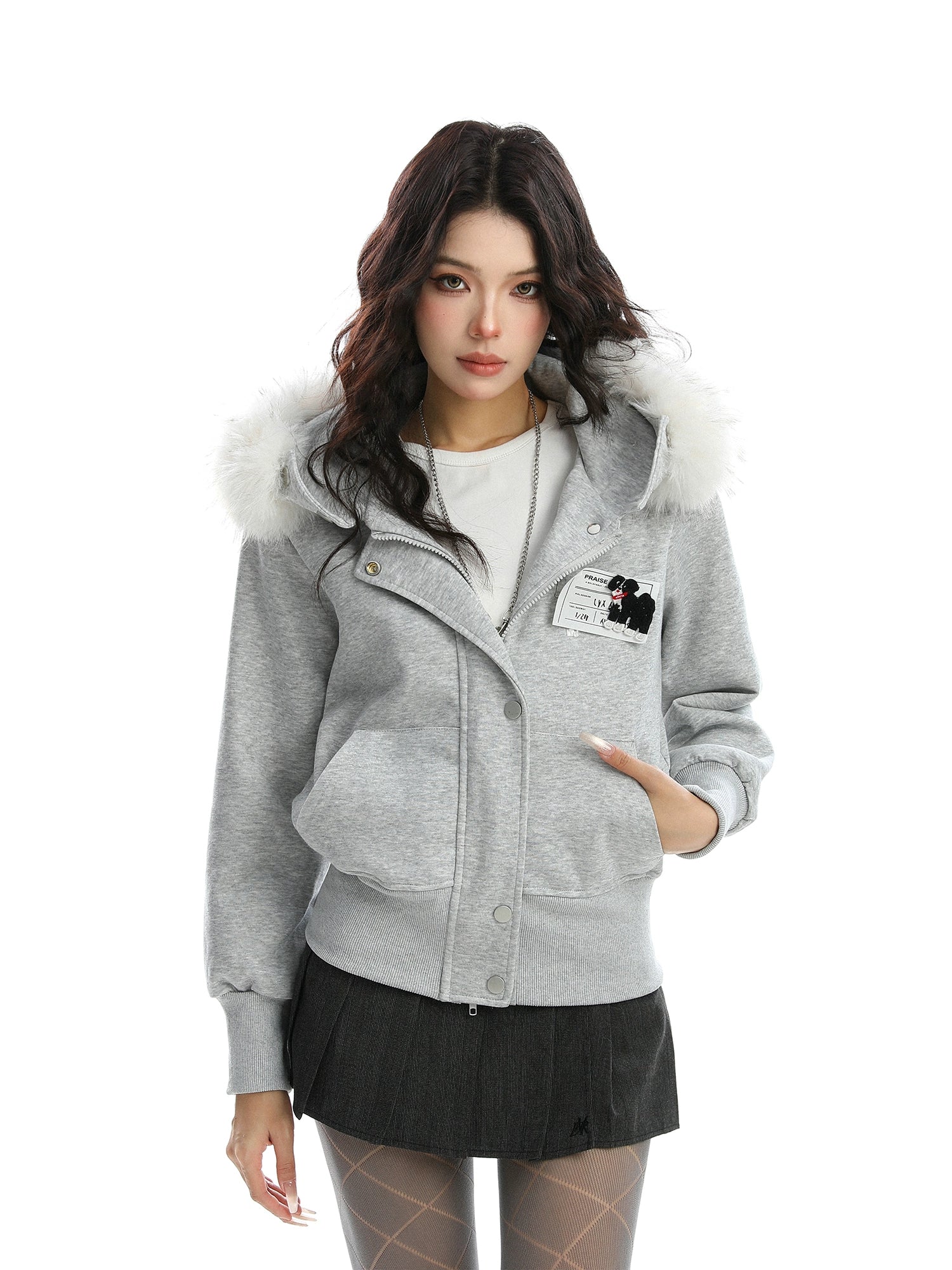 A soft fur that wraps around the neck makes this piece glamorous around the face.