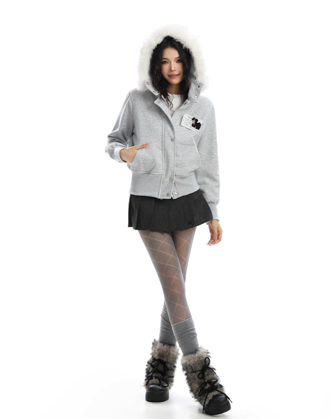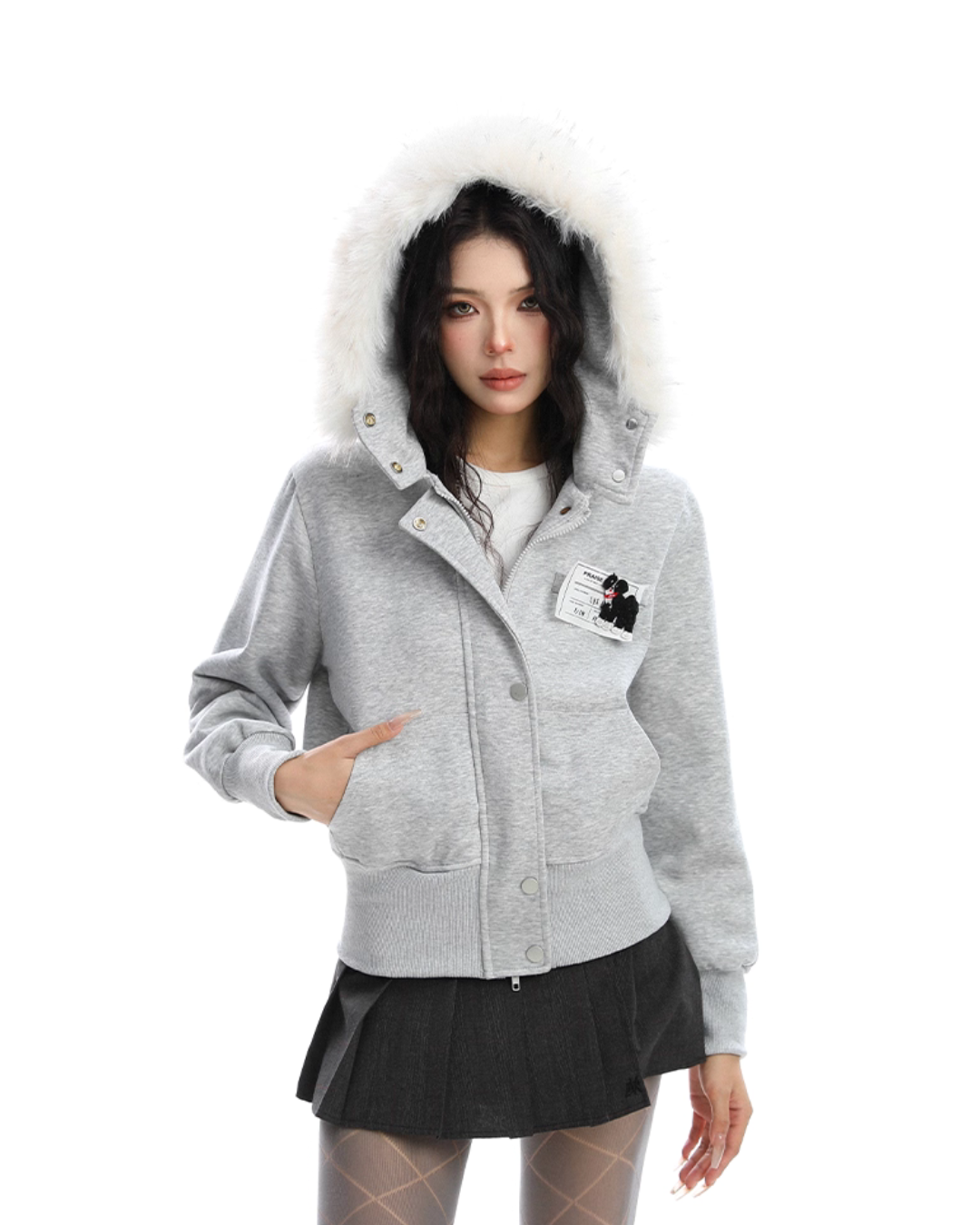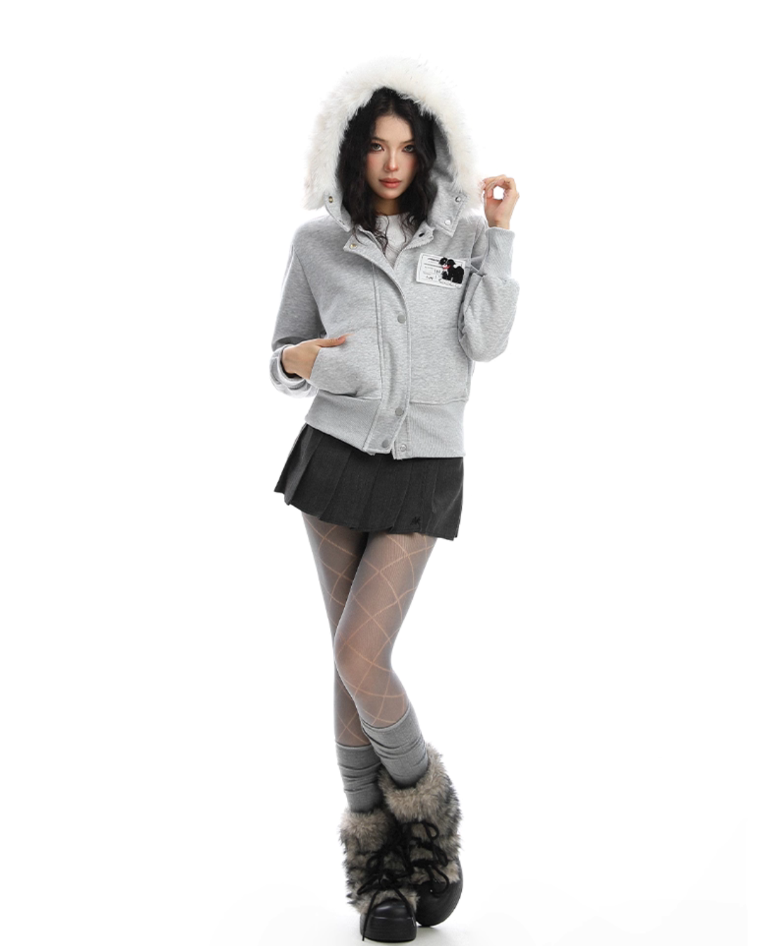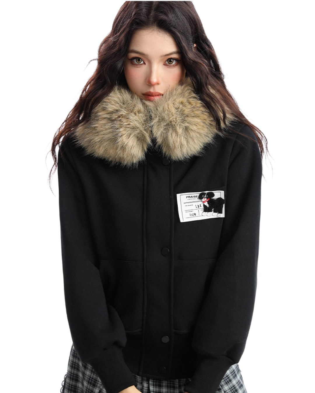 A soft fur that wraps around the neck makes this piece glamorous around the face.