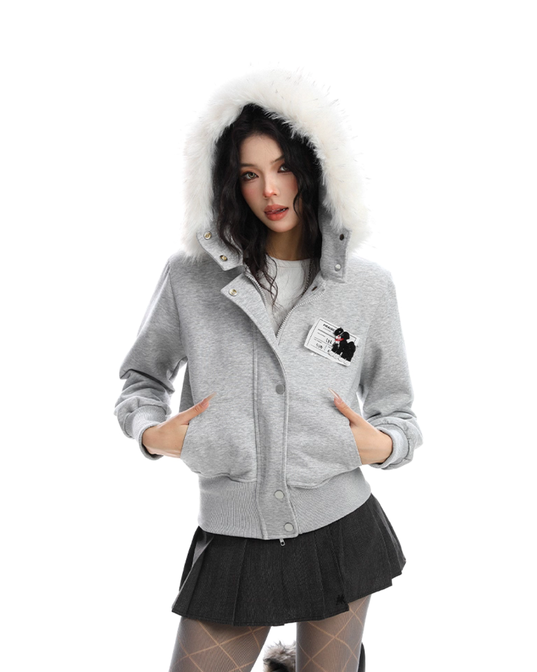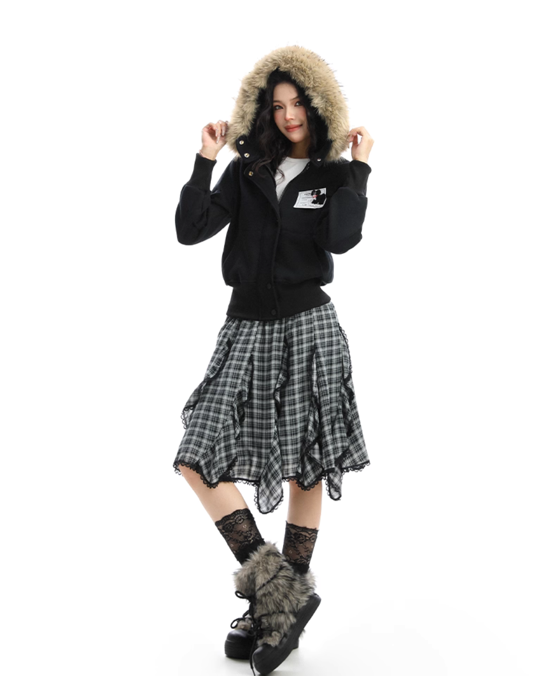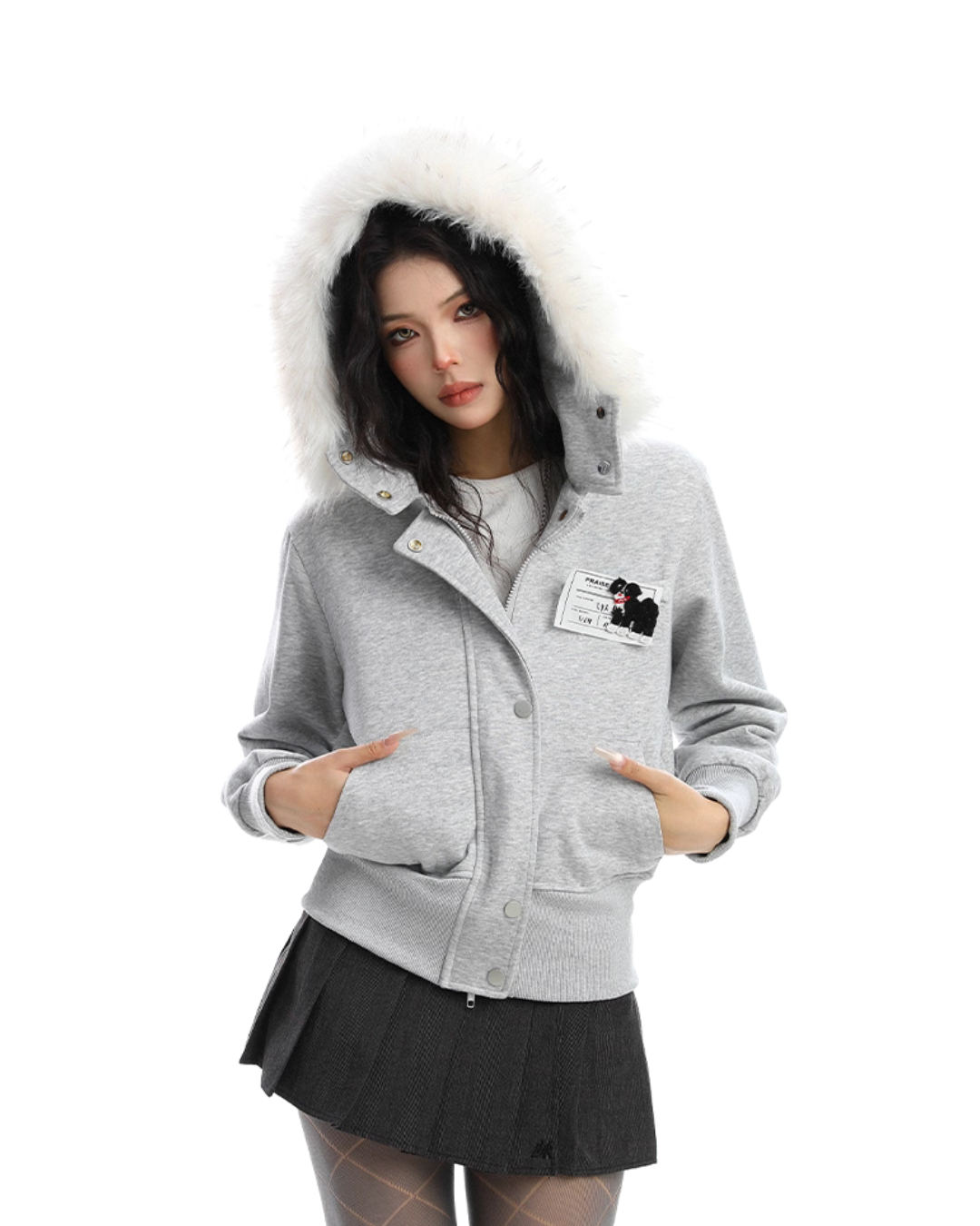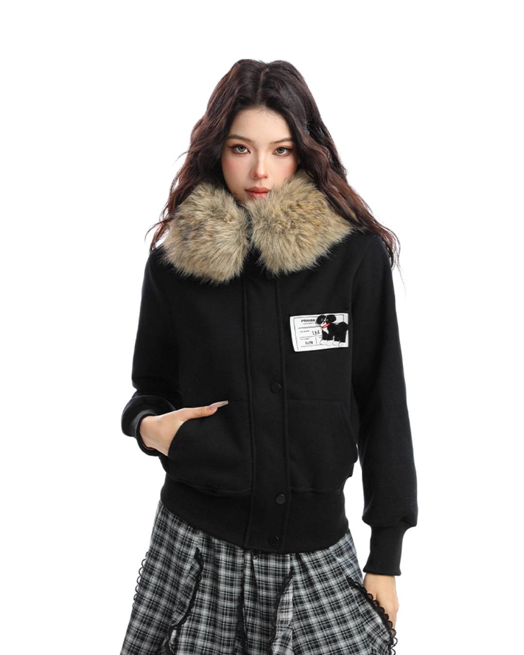 A soft fur that wraps around the neck makes this piece glamorous around the face.