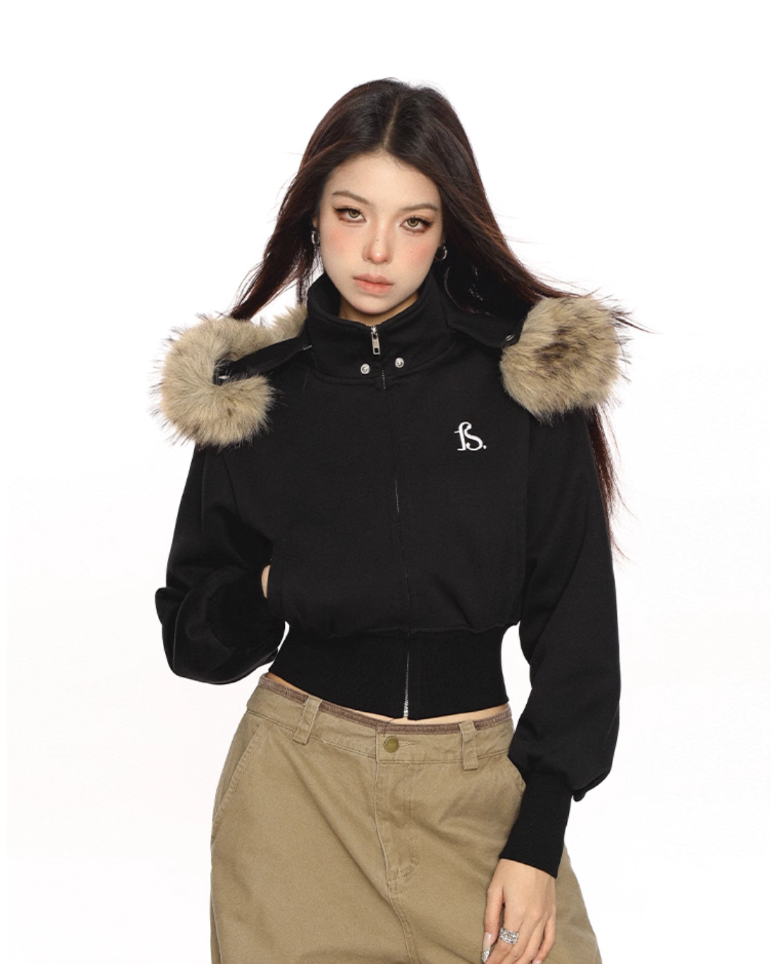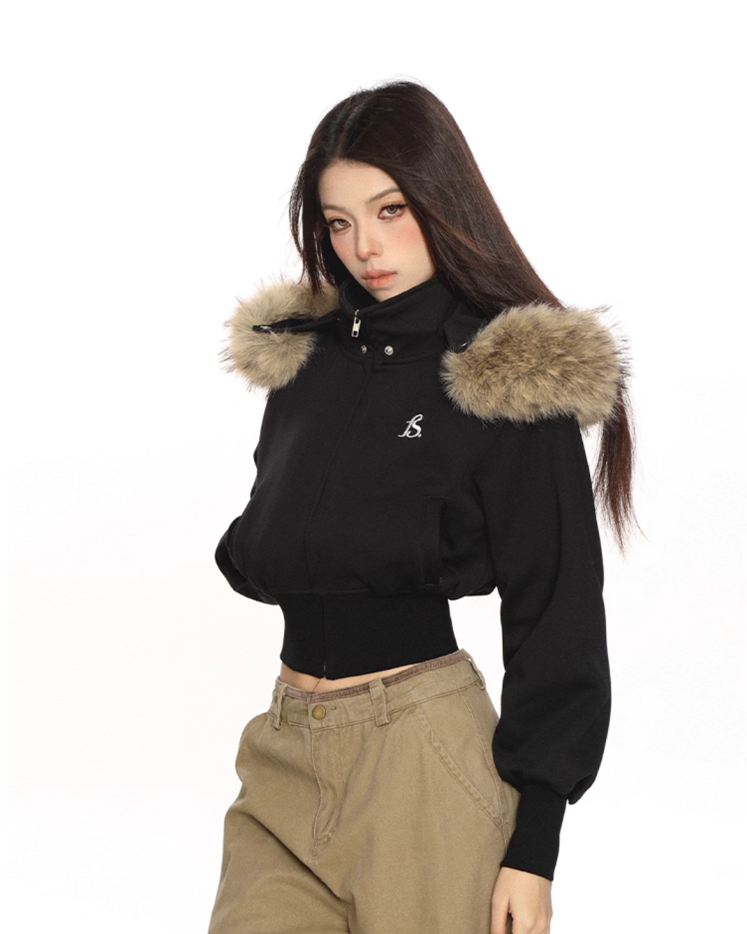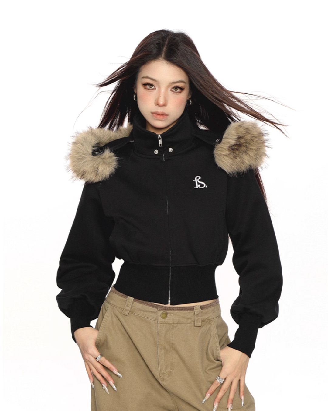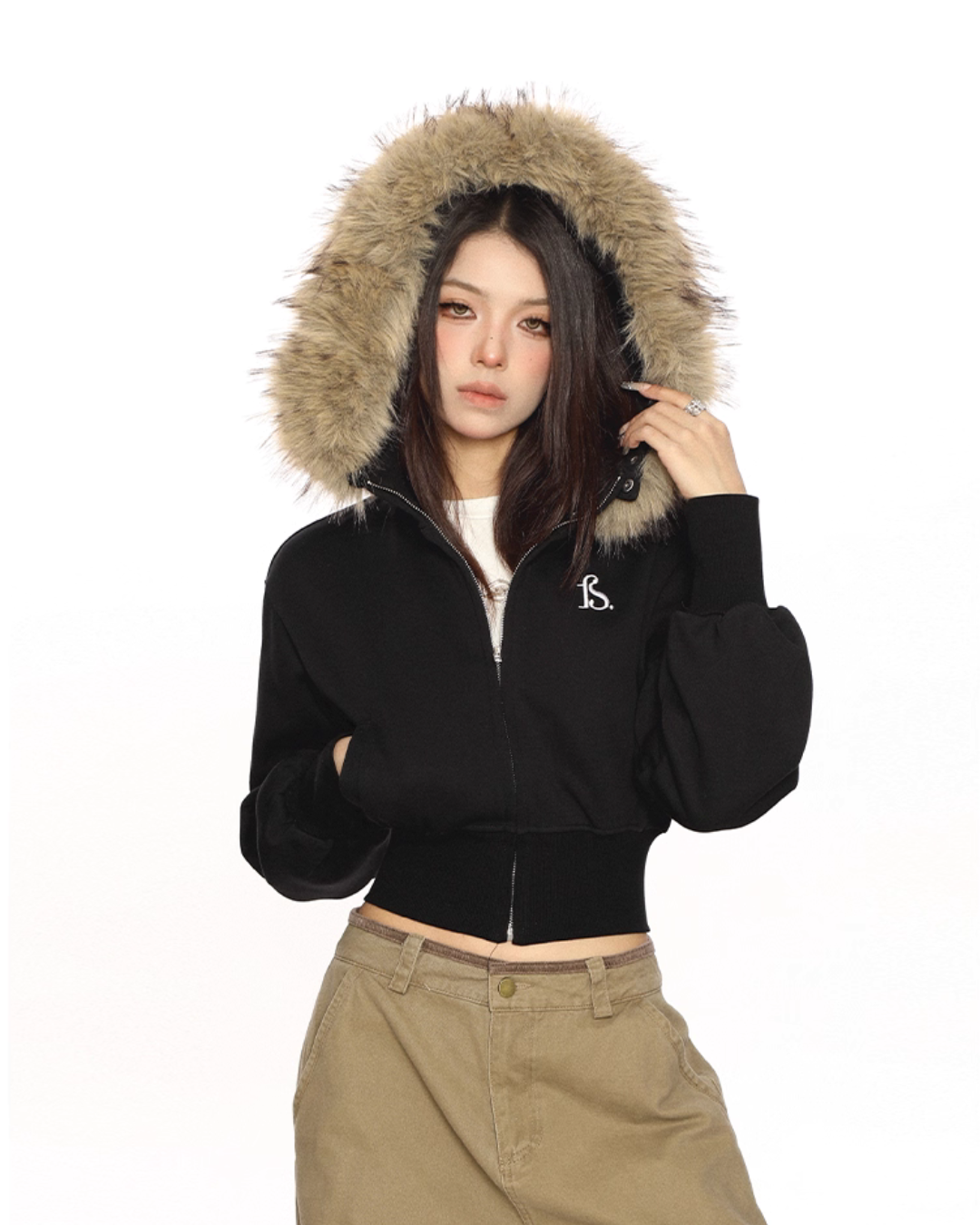 A cropped fur hooded parka that is perfect for the Y2K look.