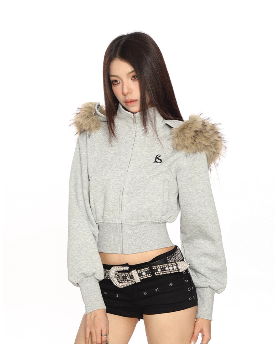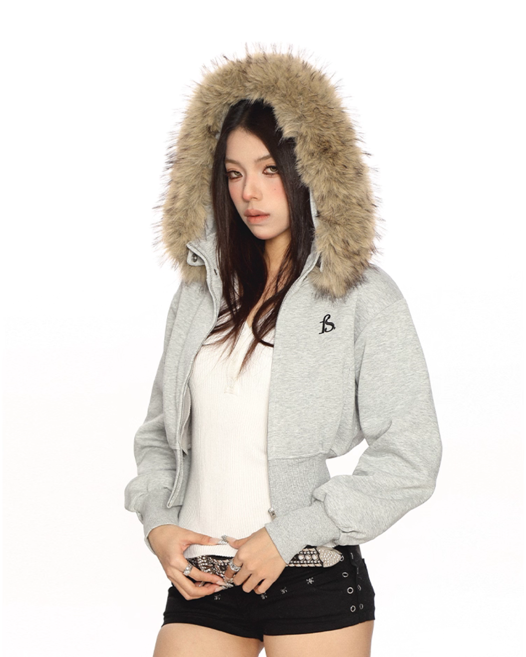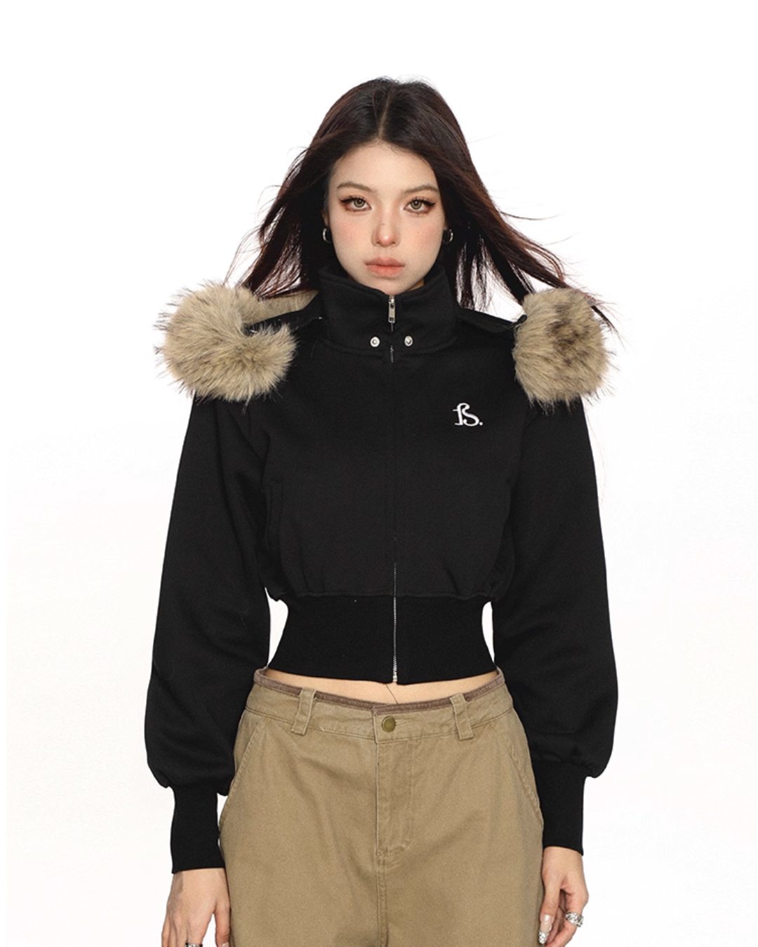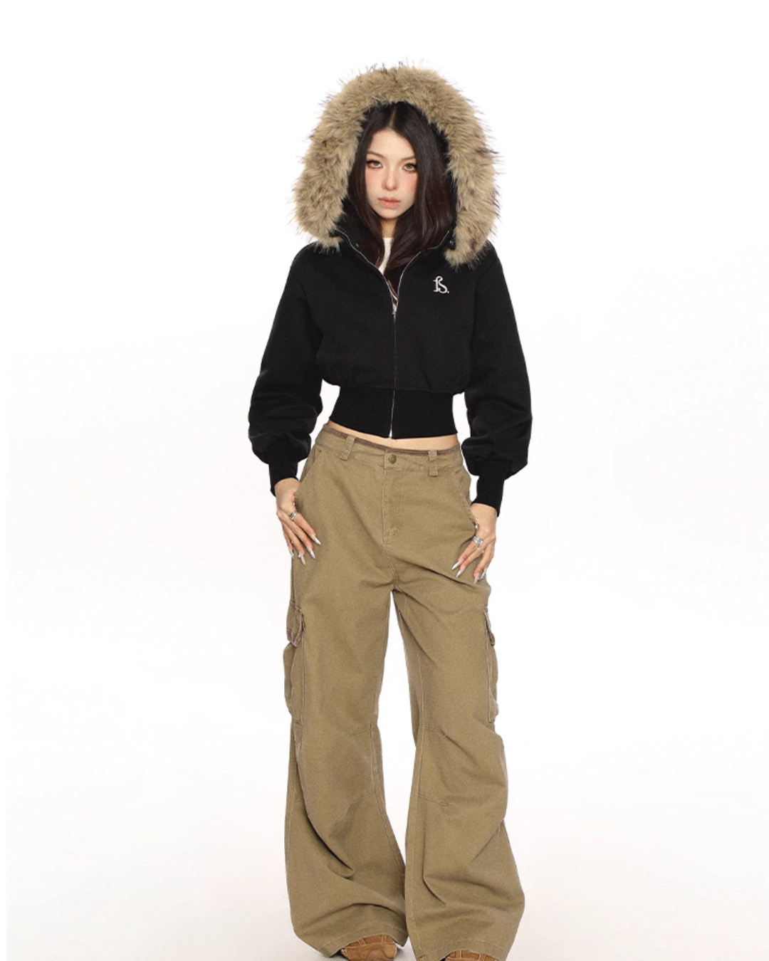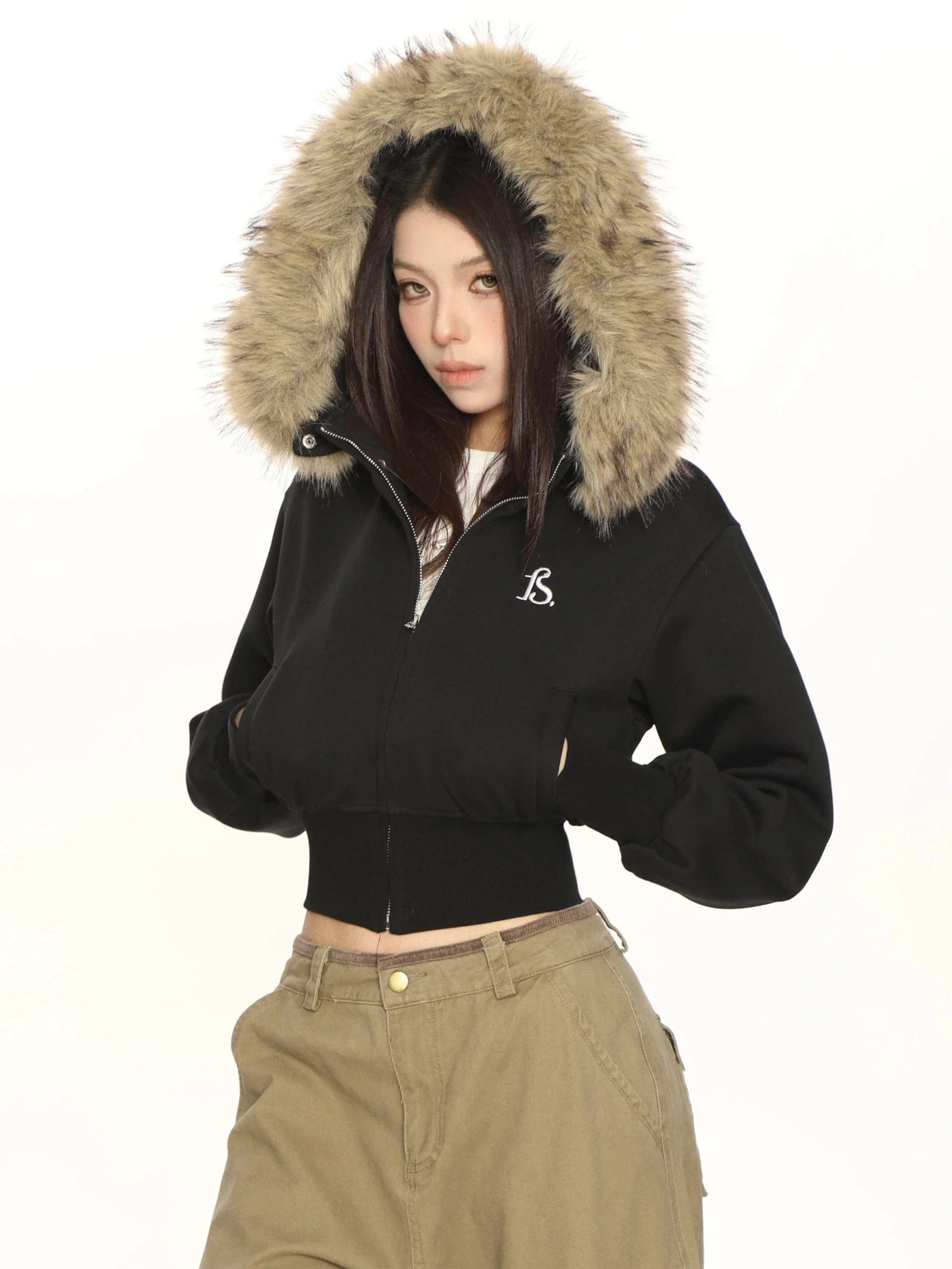 A cropped fur hooded parka that is perfect for the Y2K look.