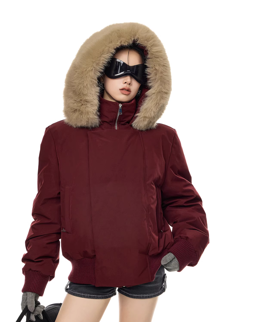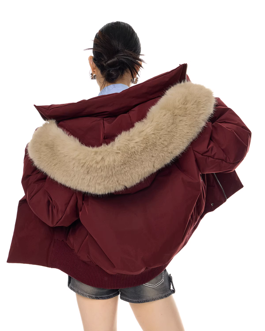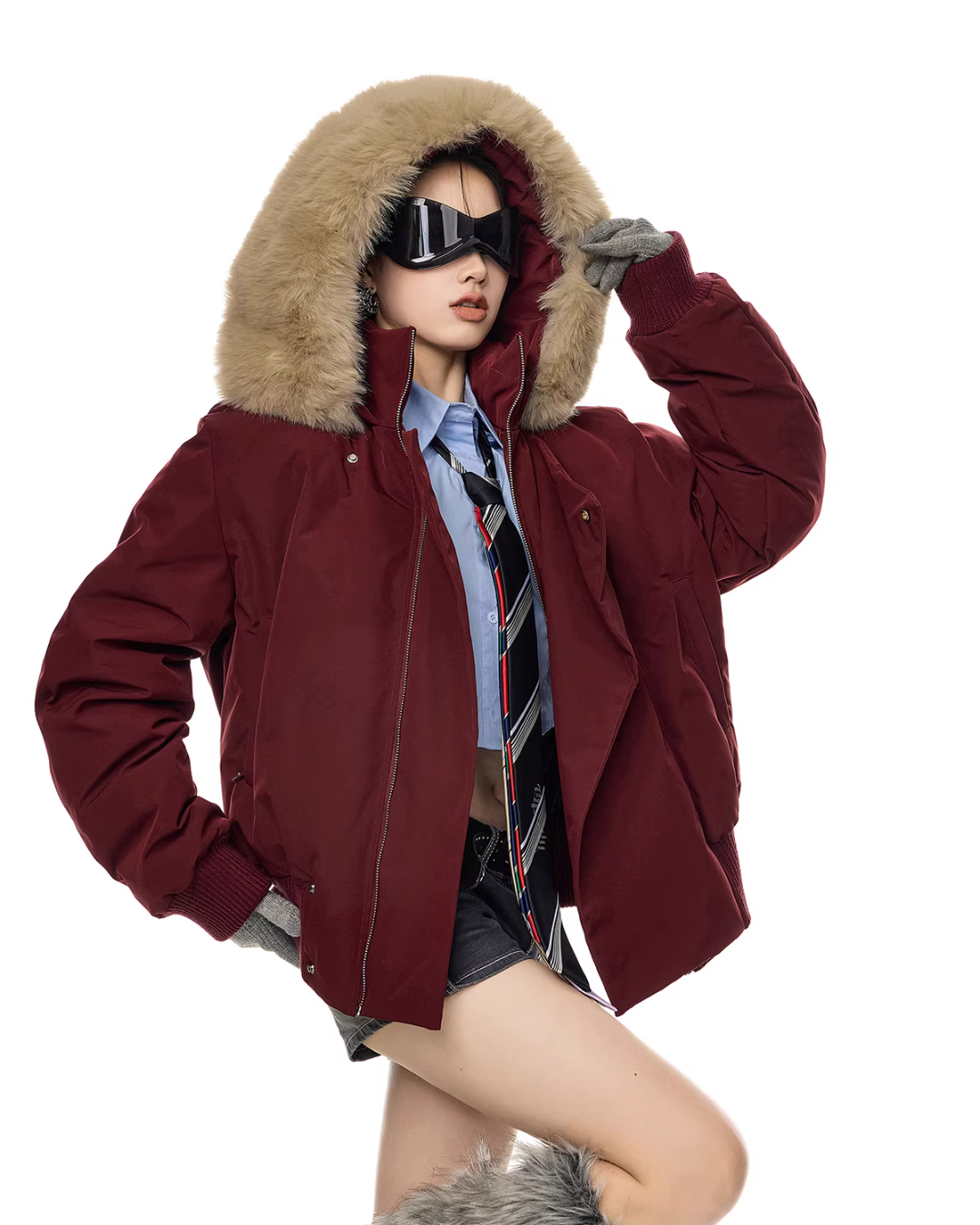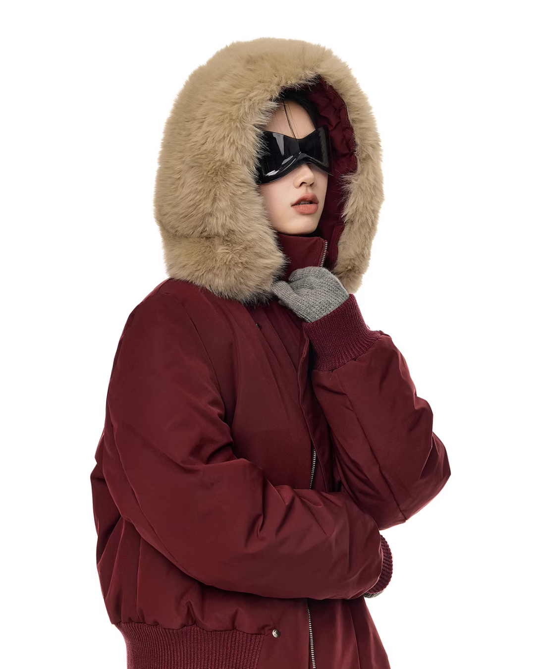 Fuzzy fur is adorned on the hood, creating a glamorous atmosphere.