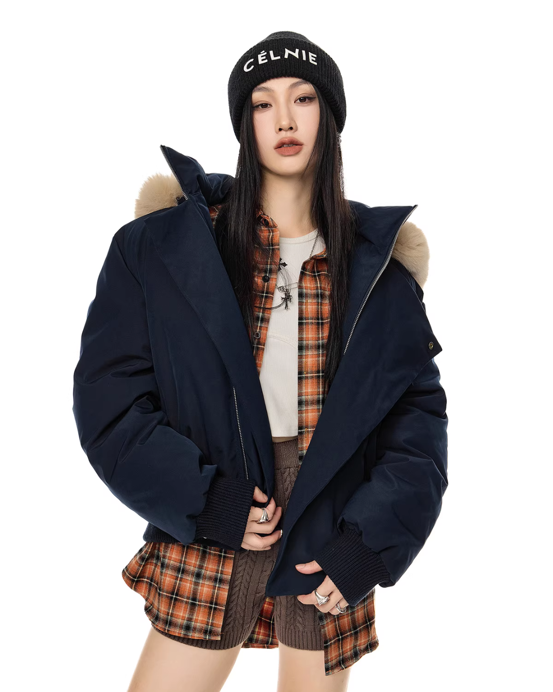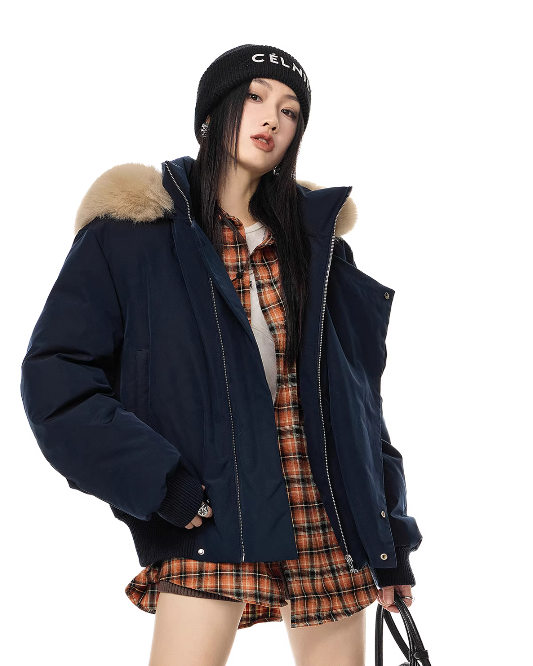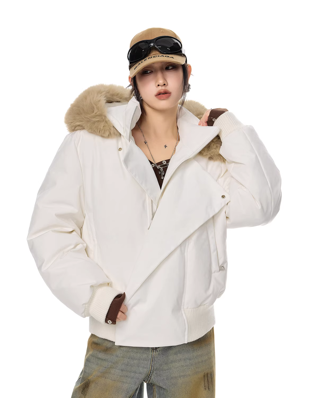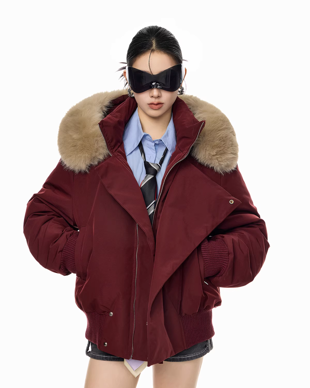 Fuzzy fur is adorned on the hood, creating a glamorous atmosphere.
