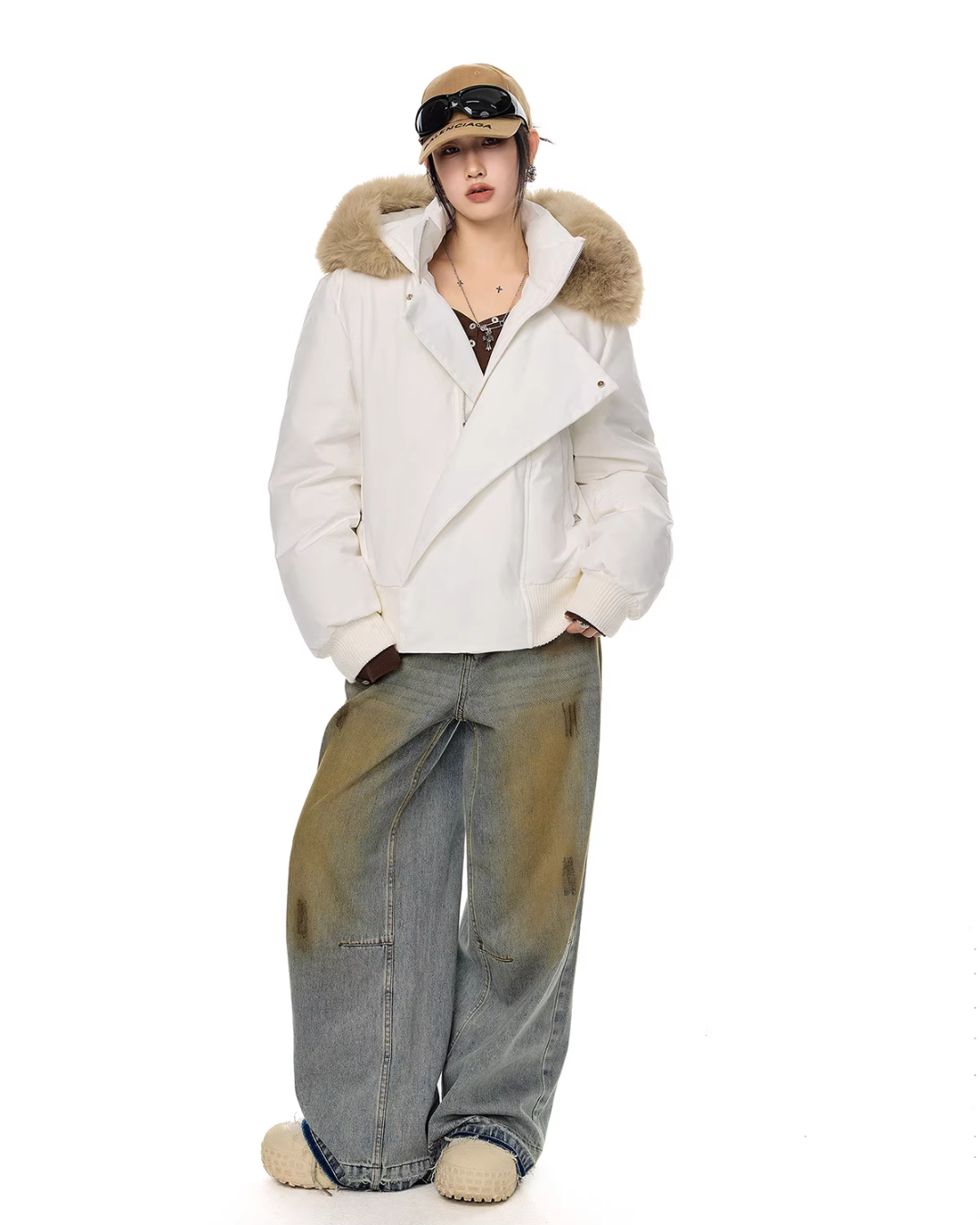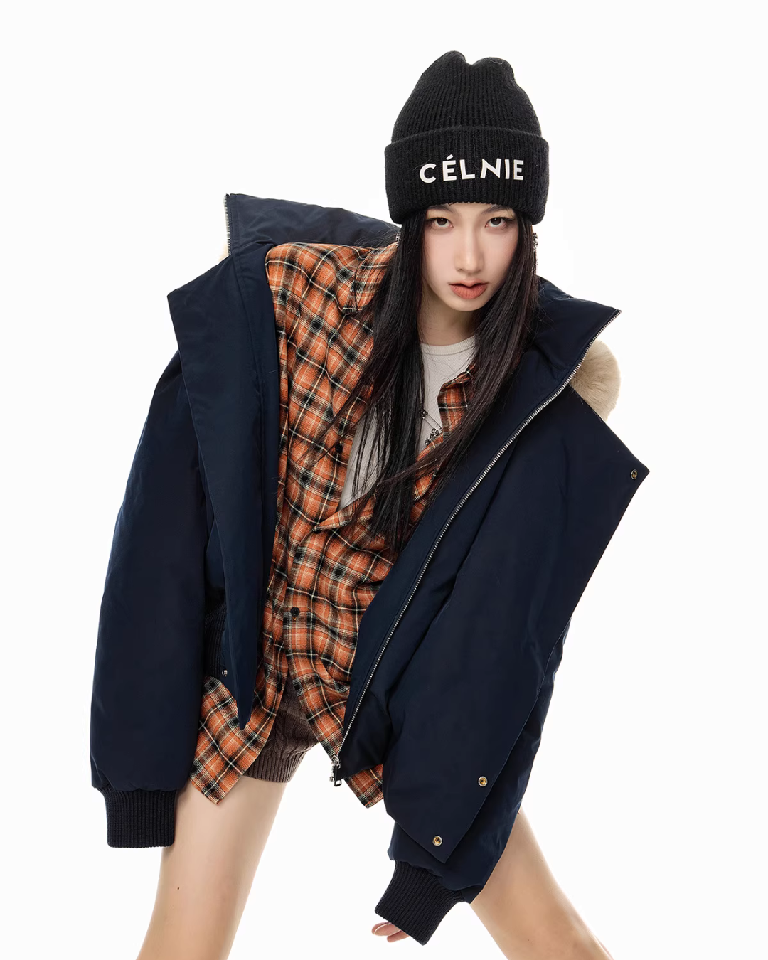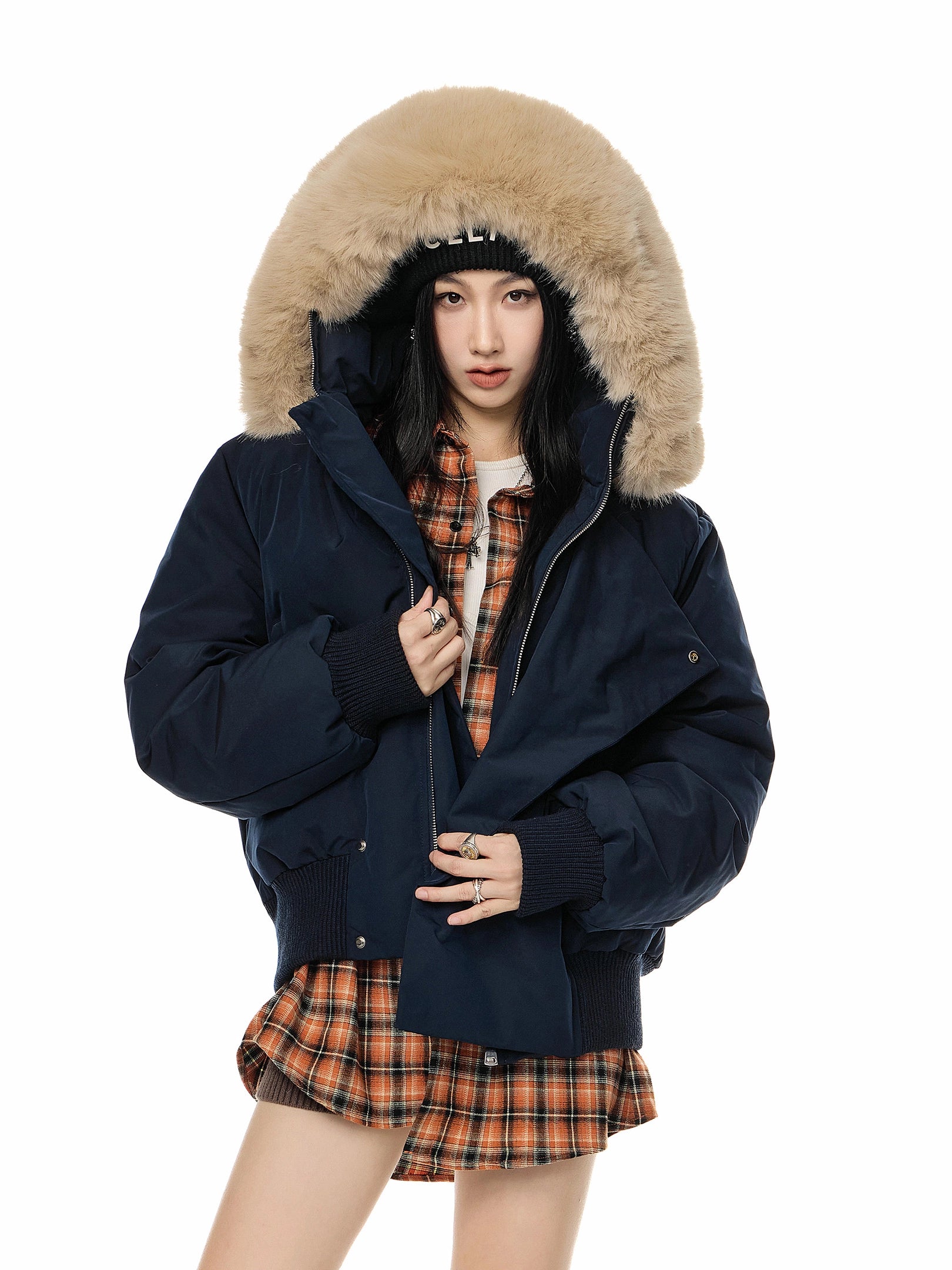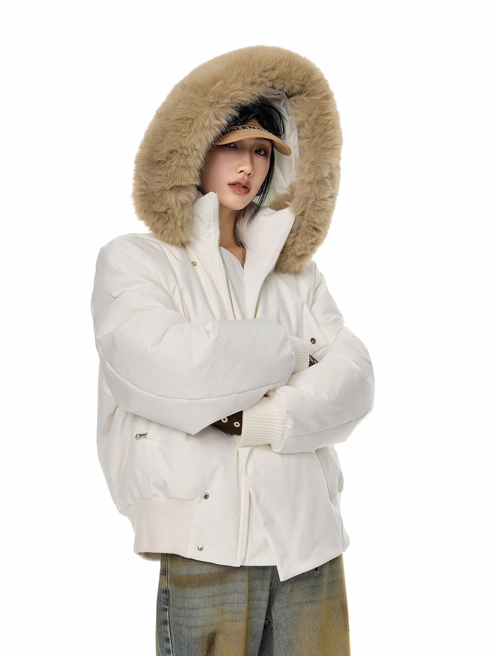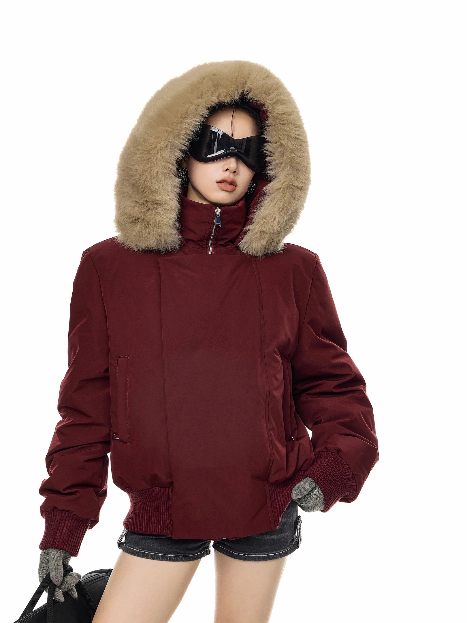 Fuzzy fur is adorned on the hood, creating a glamorous atmosphere.