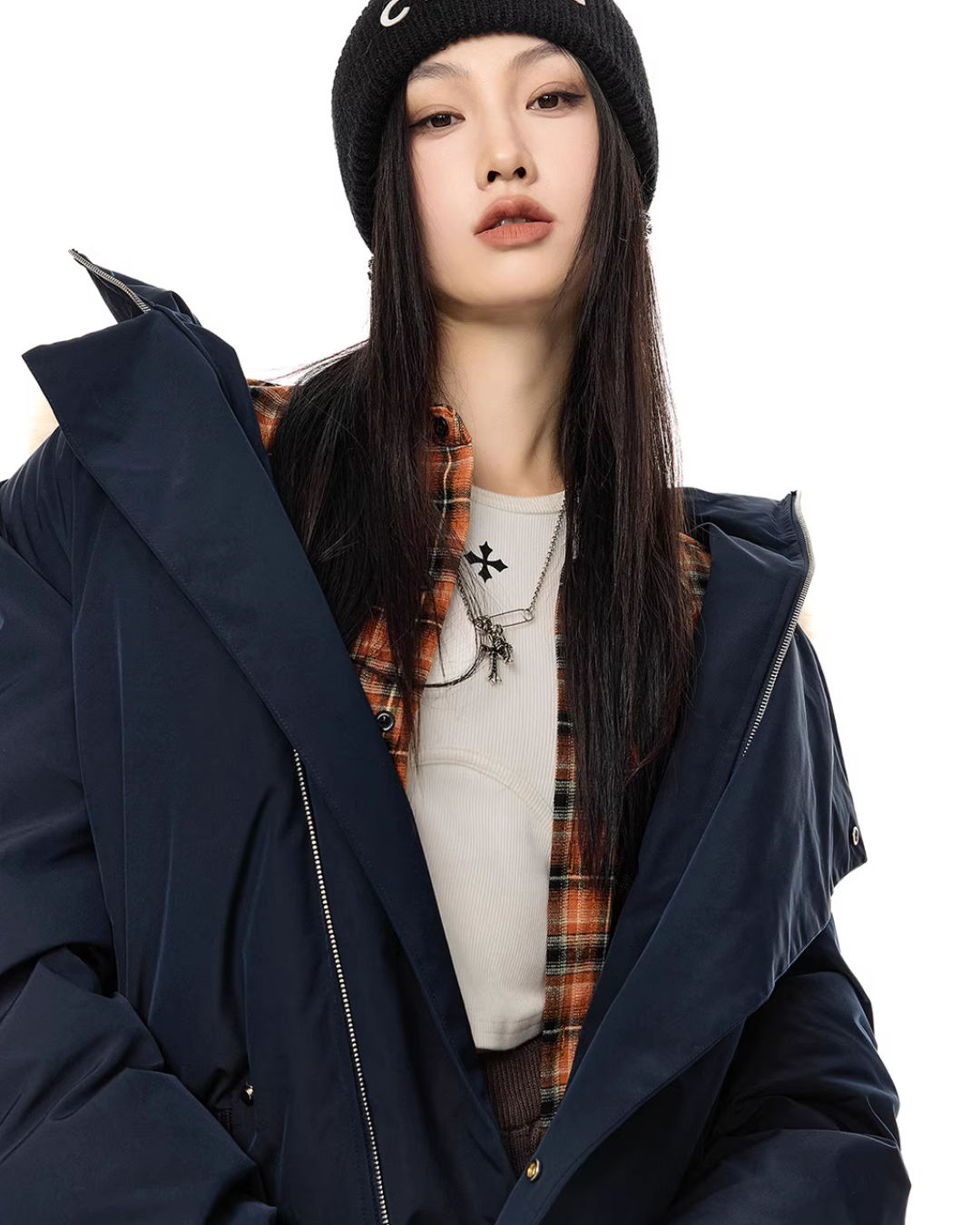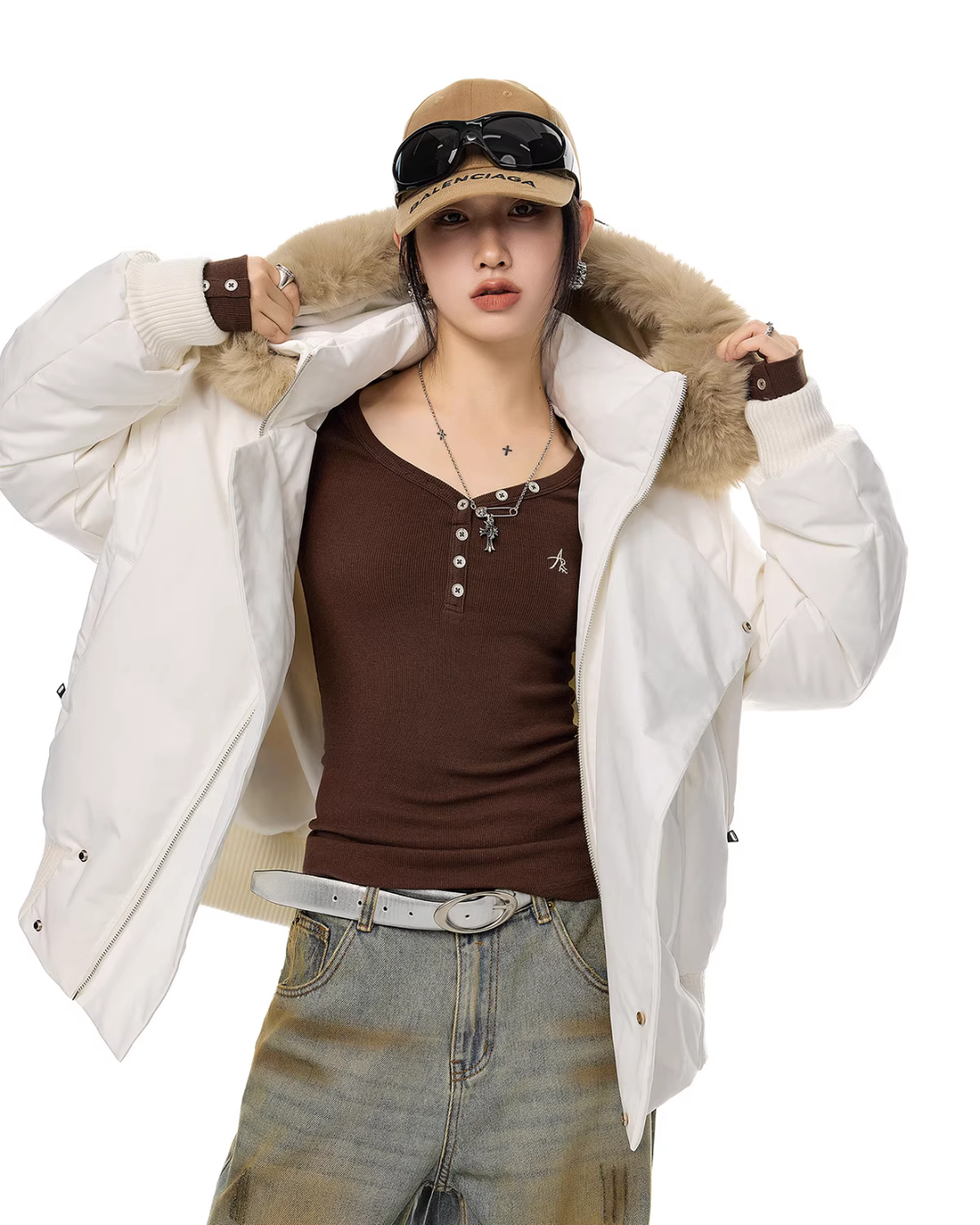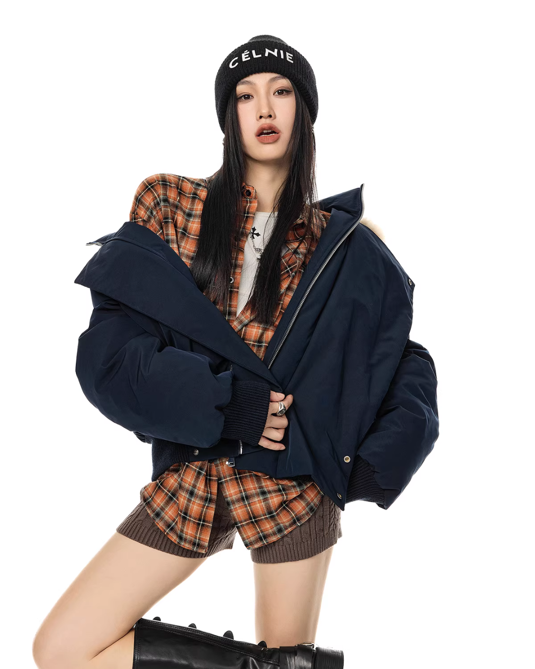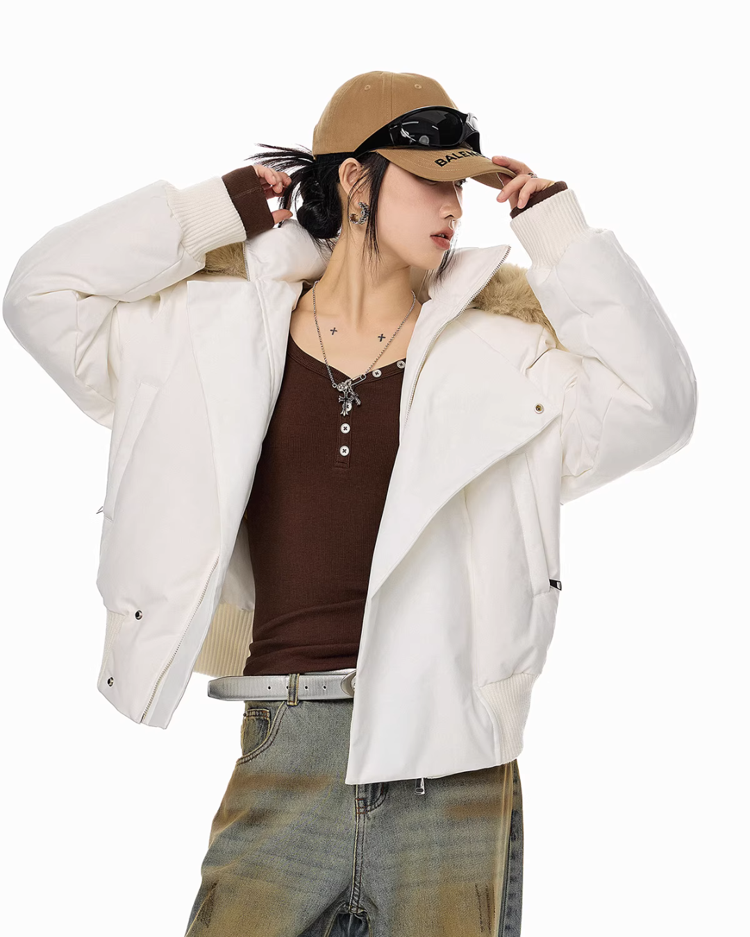 Fuzzy fur is adorned on the hood, creating a glamorous atmosphere.