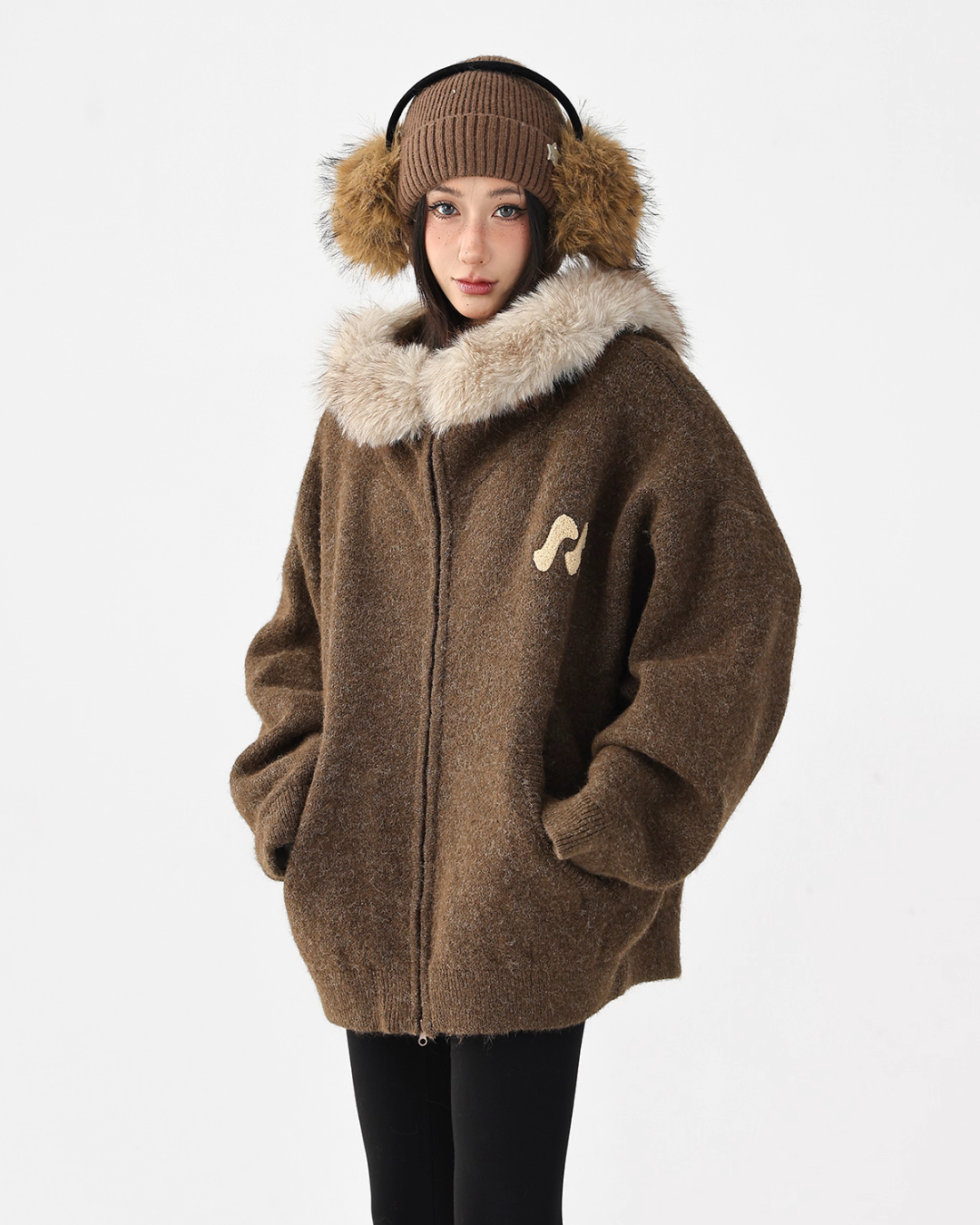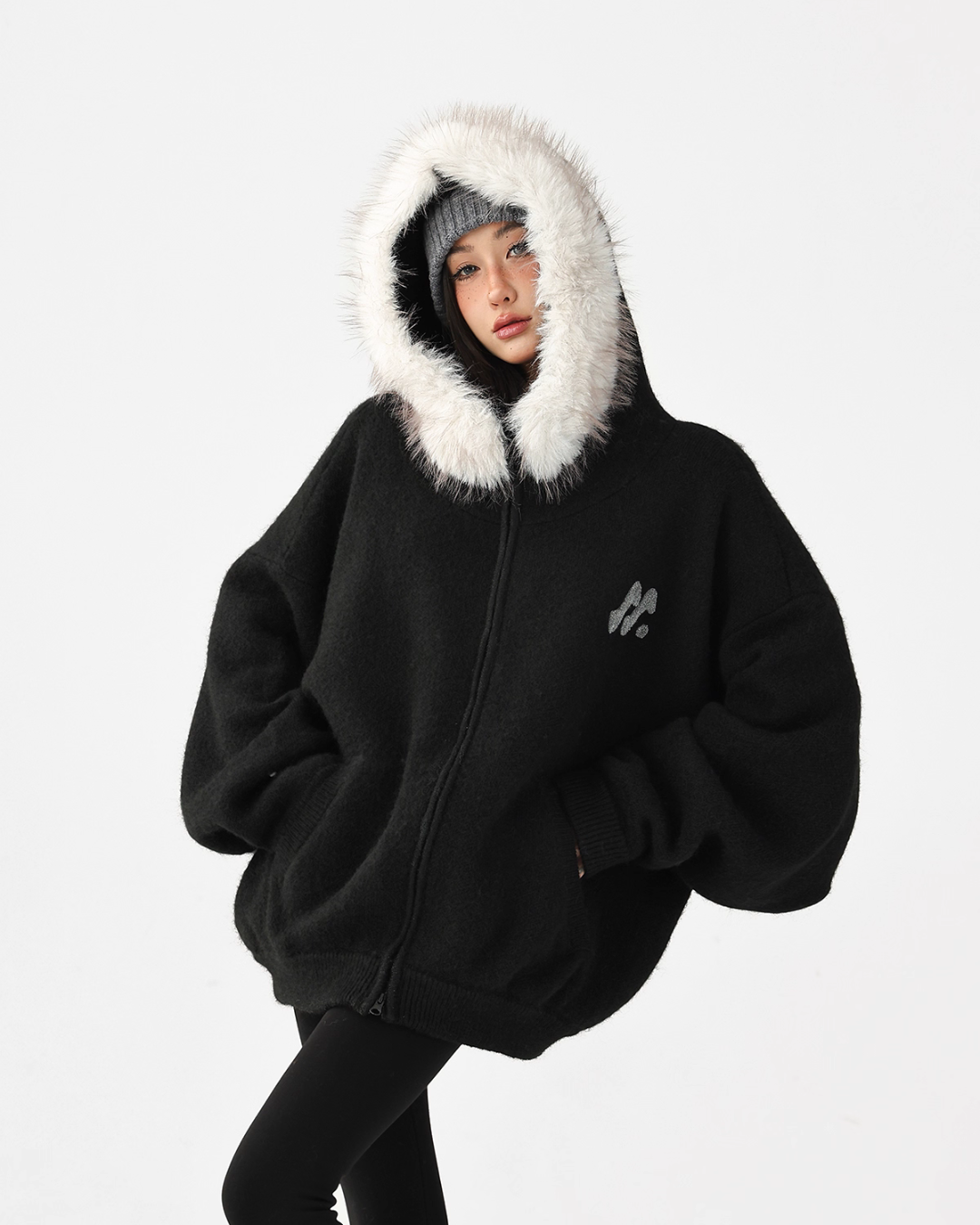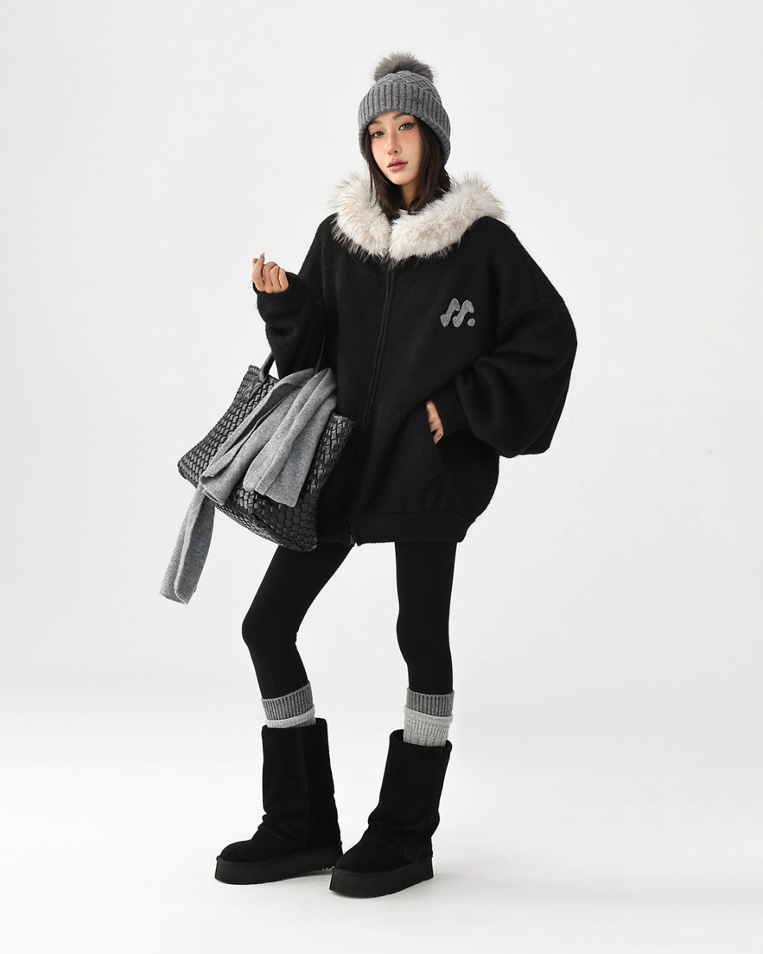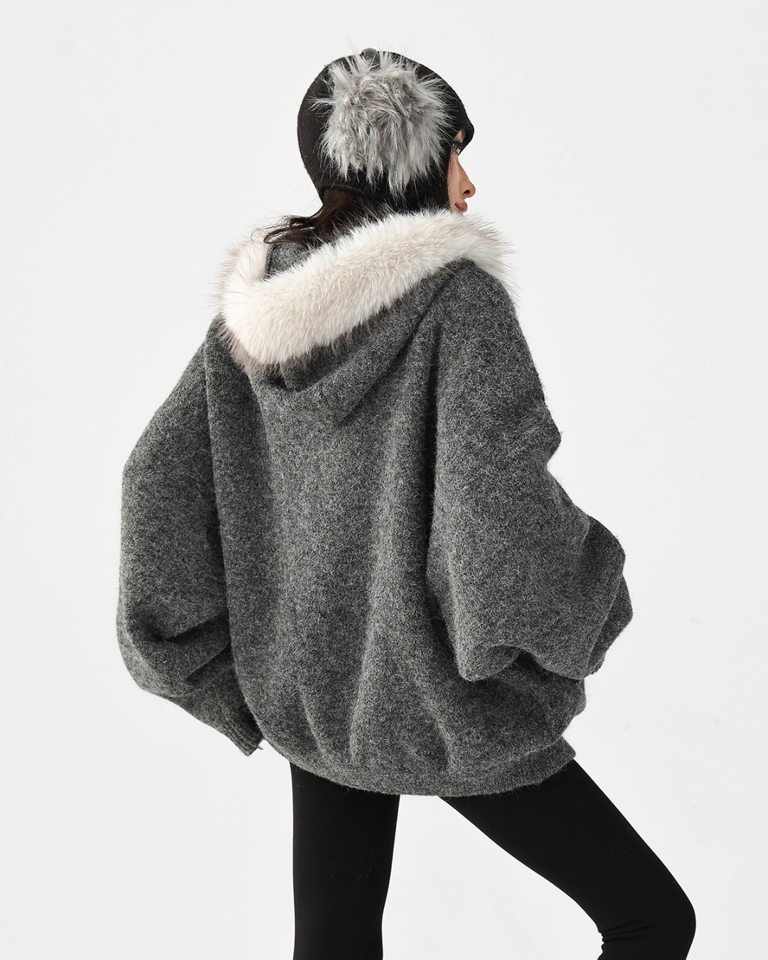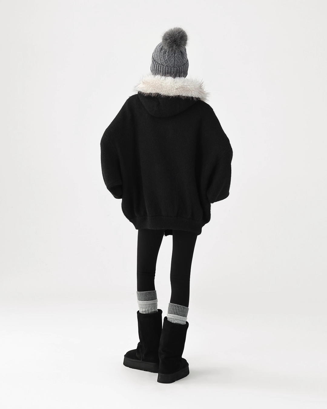 The fluffy fur on the hood adds a glamorous touch around the face.