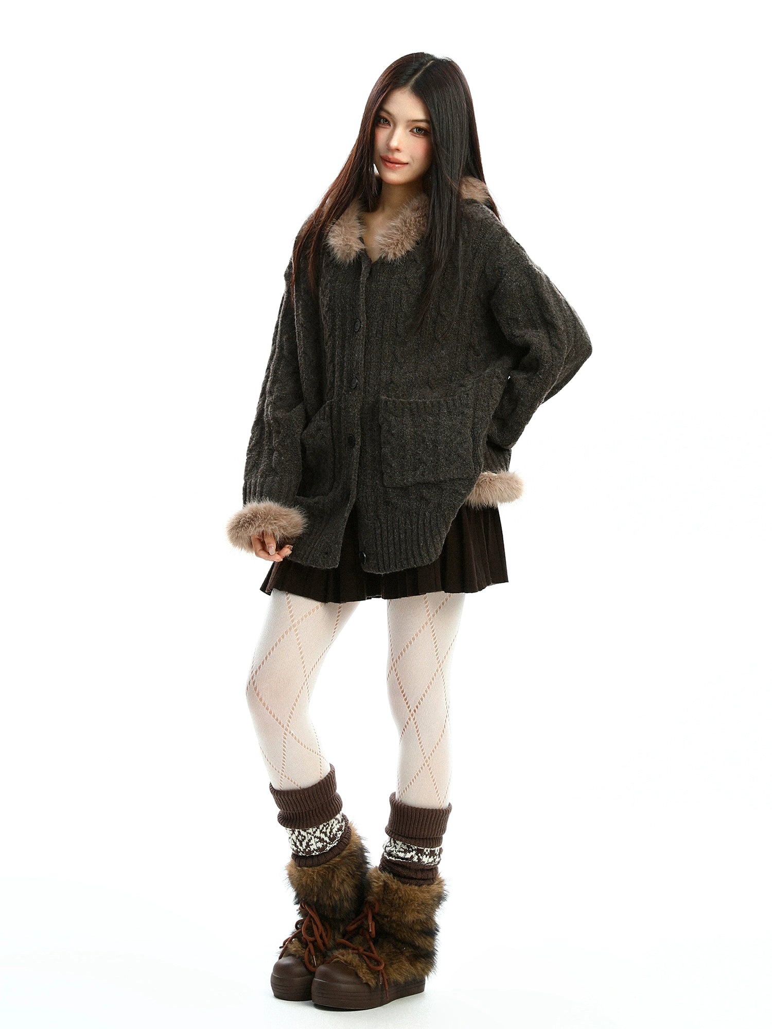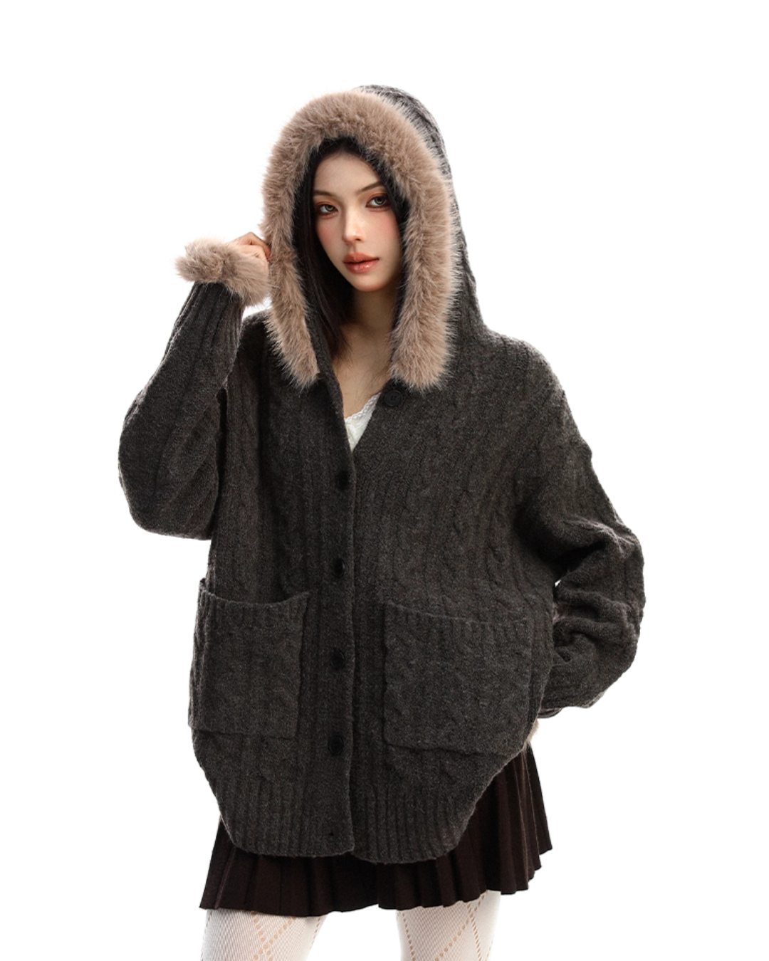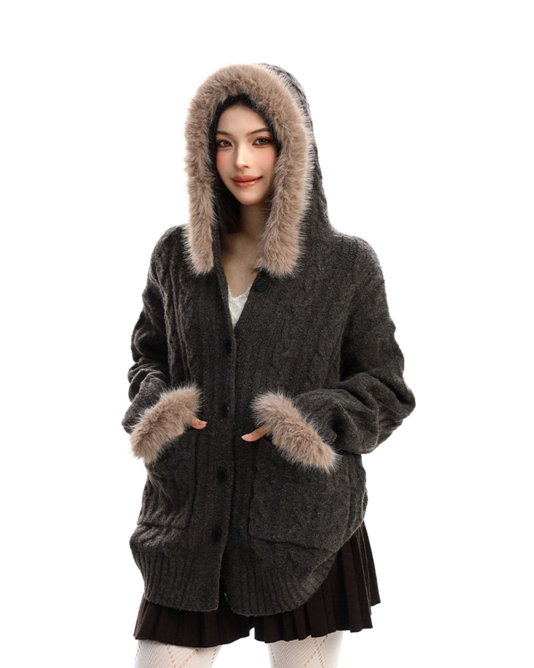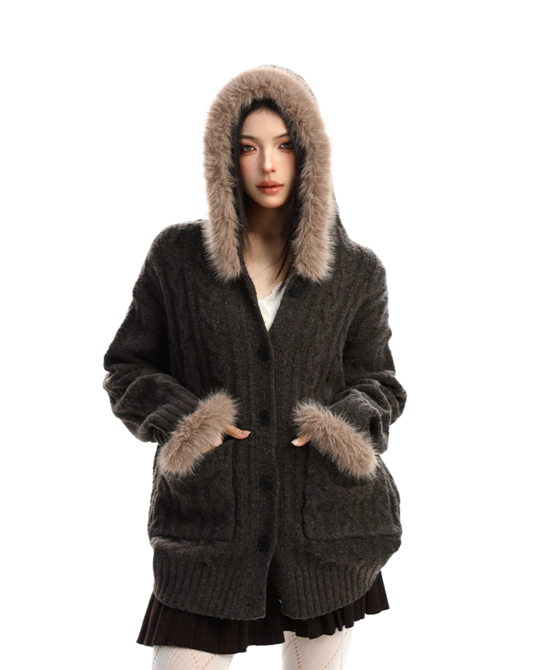 A knit cardigan with a fluffy texture fur attached to the hood.