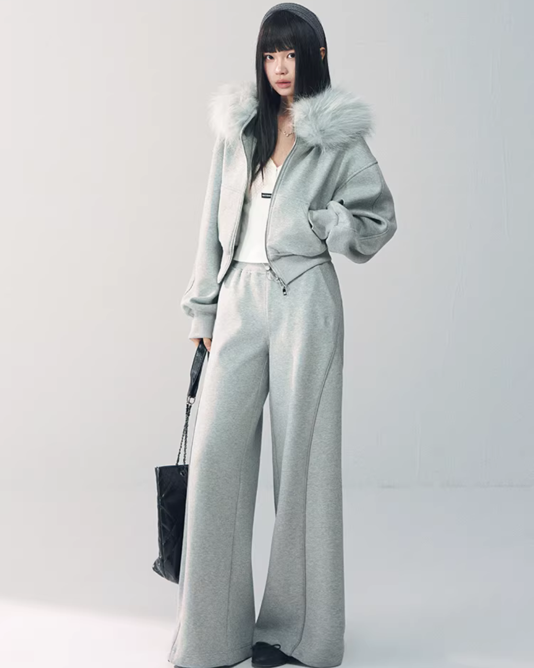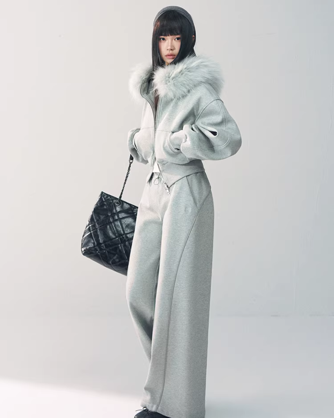 The parka features fluffy fur around the hood, adding a glamorous touch to the face.