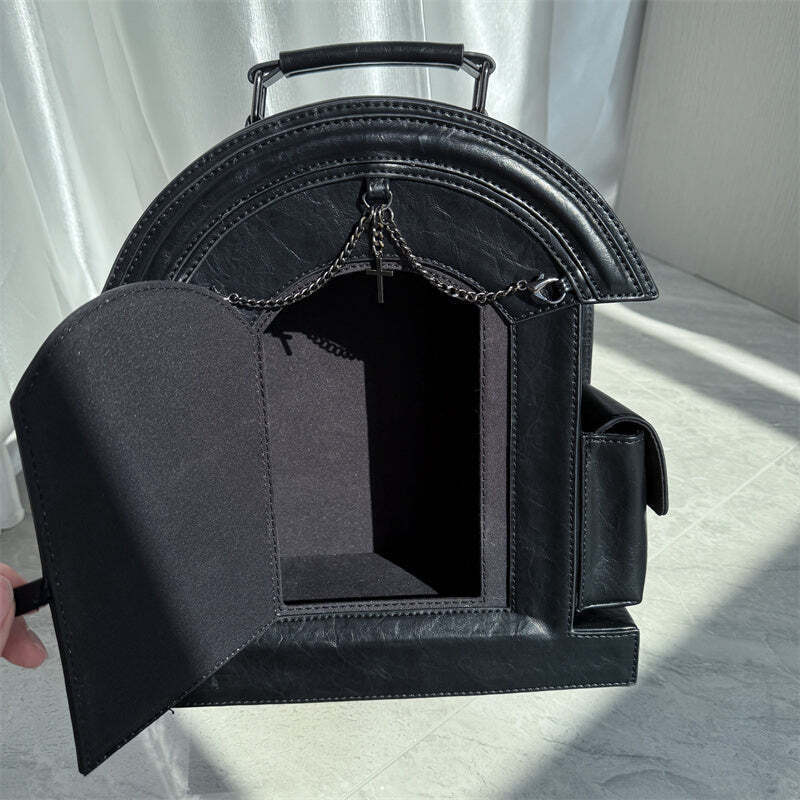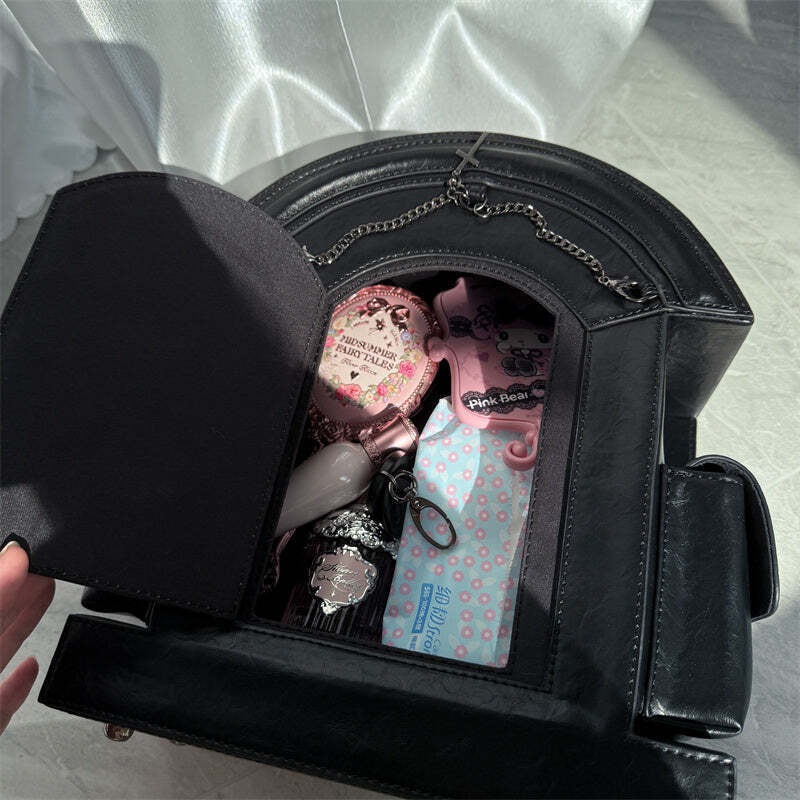 Gothic Ita Bag with Clear Window for Plushies and Pins is designed to display plushies, dolls, pins, and badges while keeping everyday essentials organized.