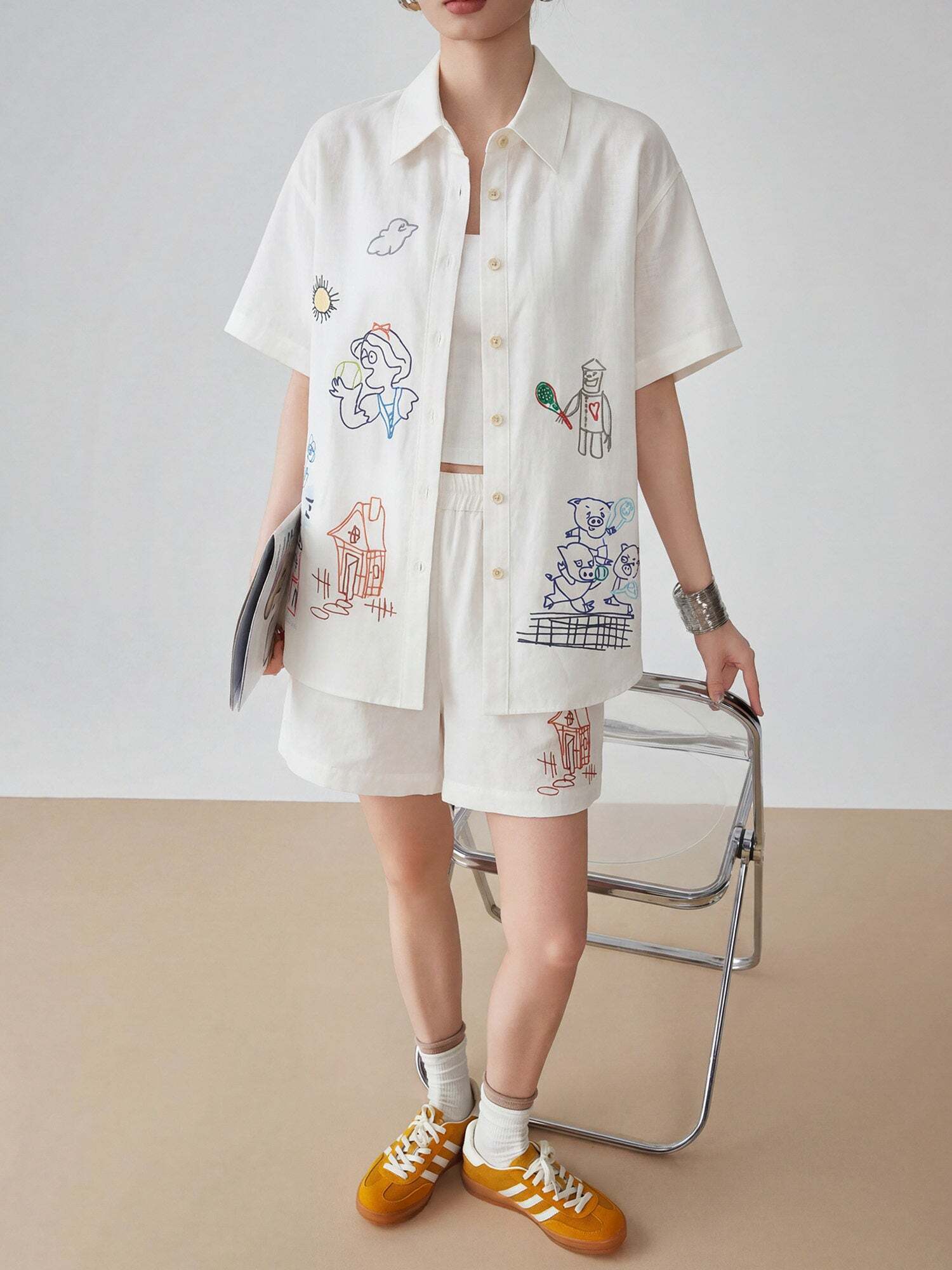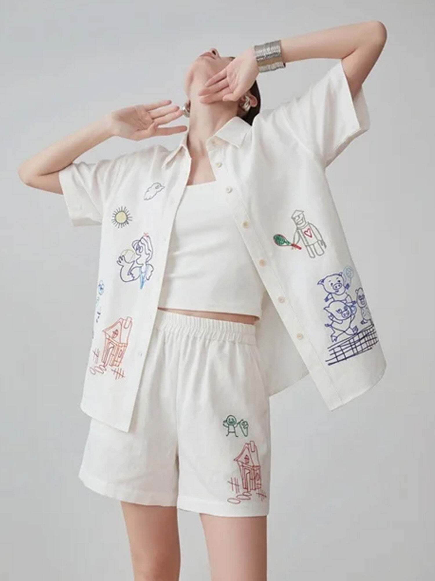 A set-up of a unique shirt and pants with illustrations that catch the eye like graffiti.