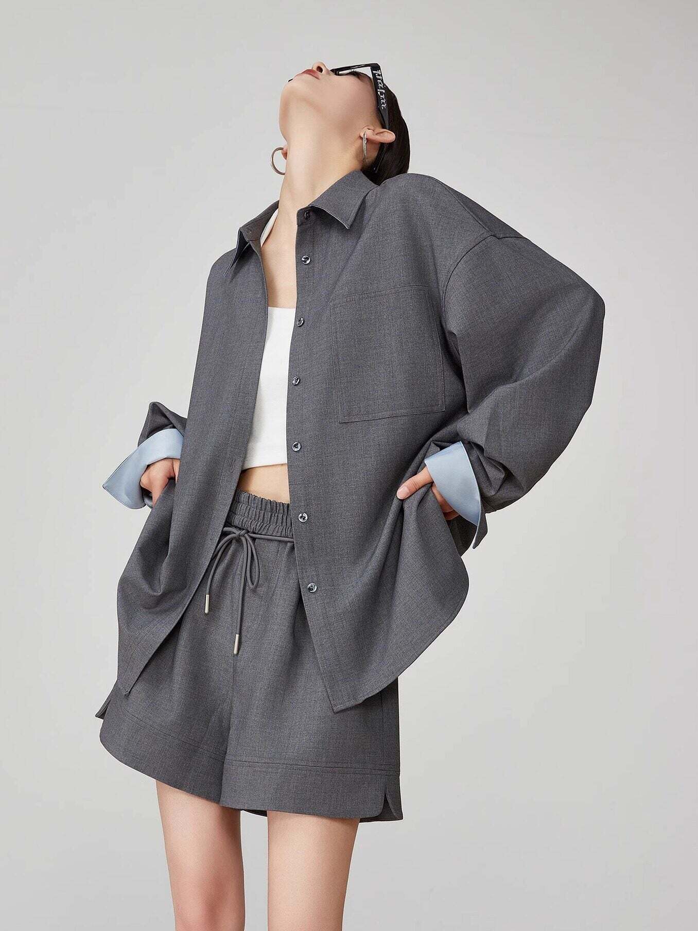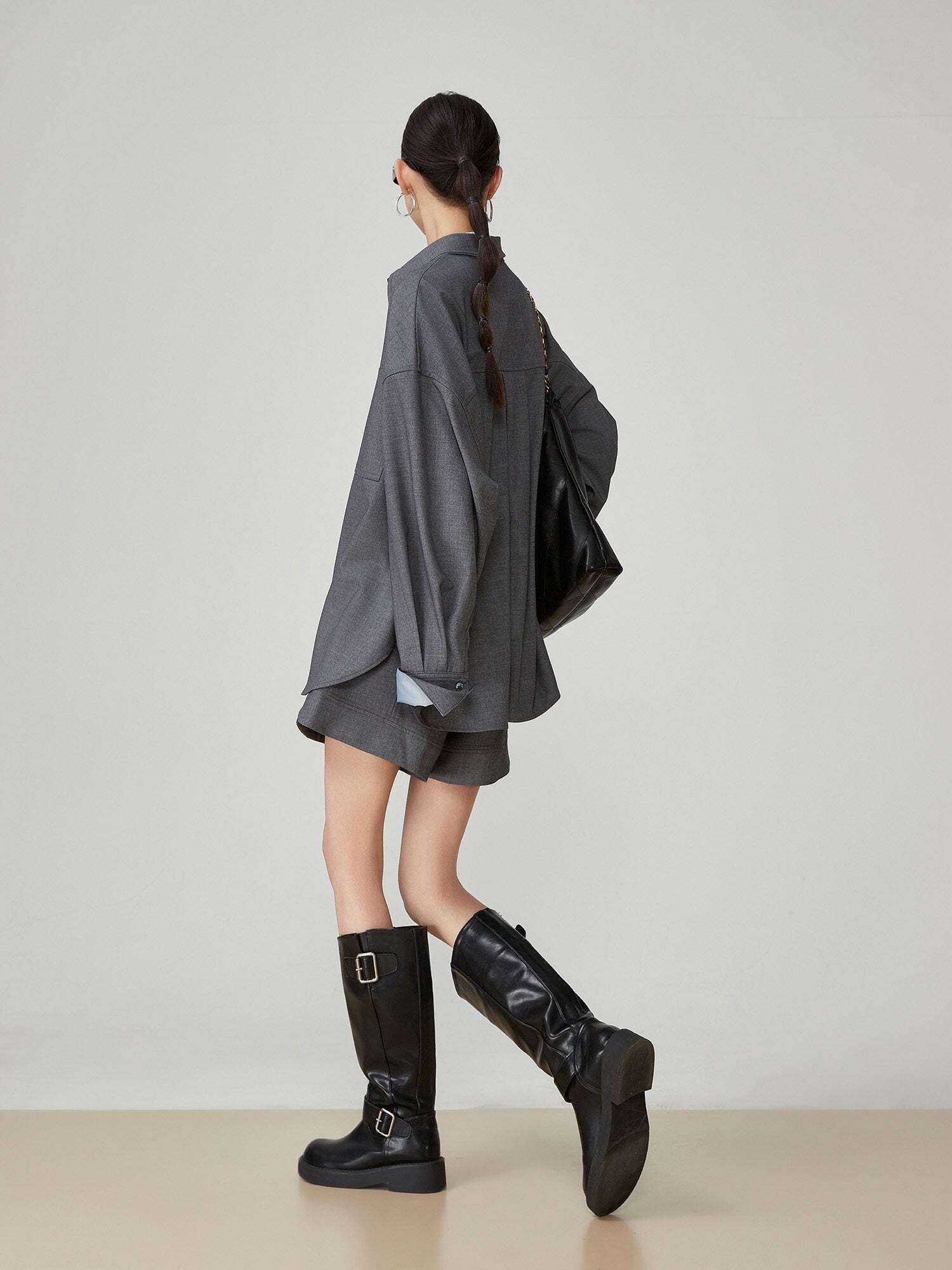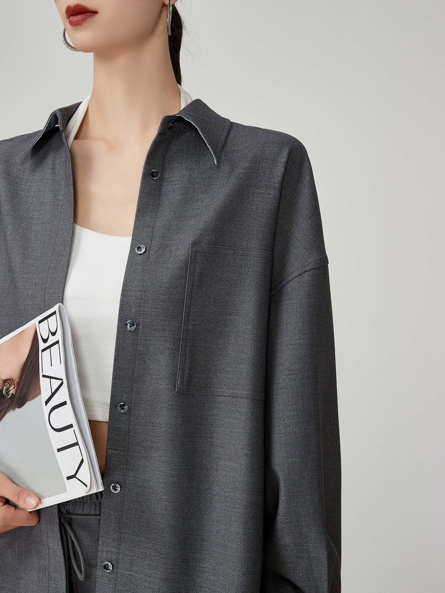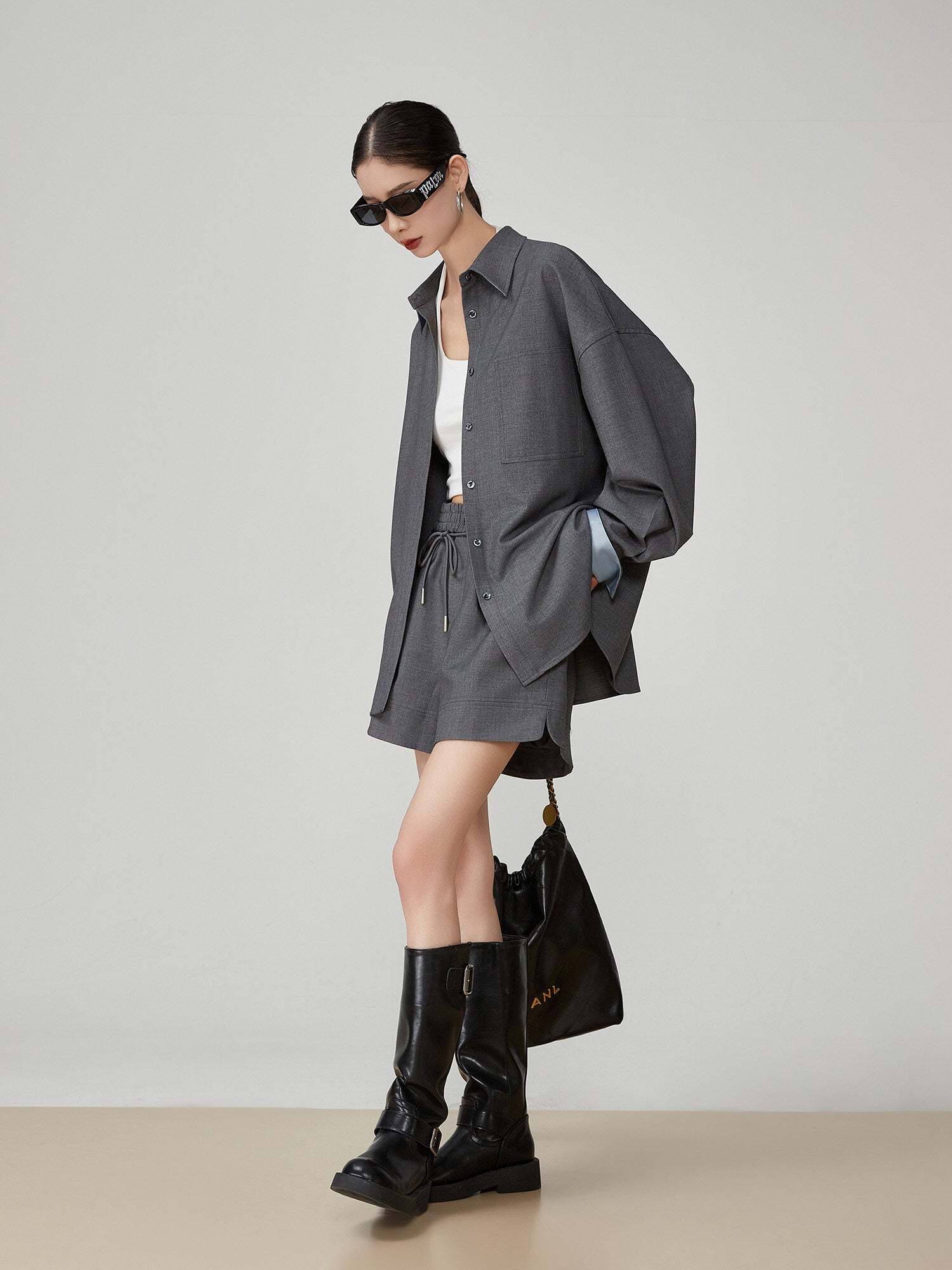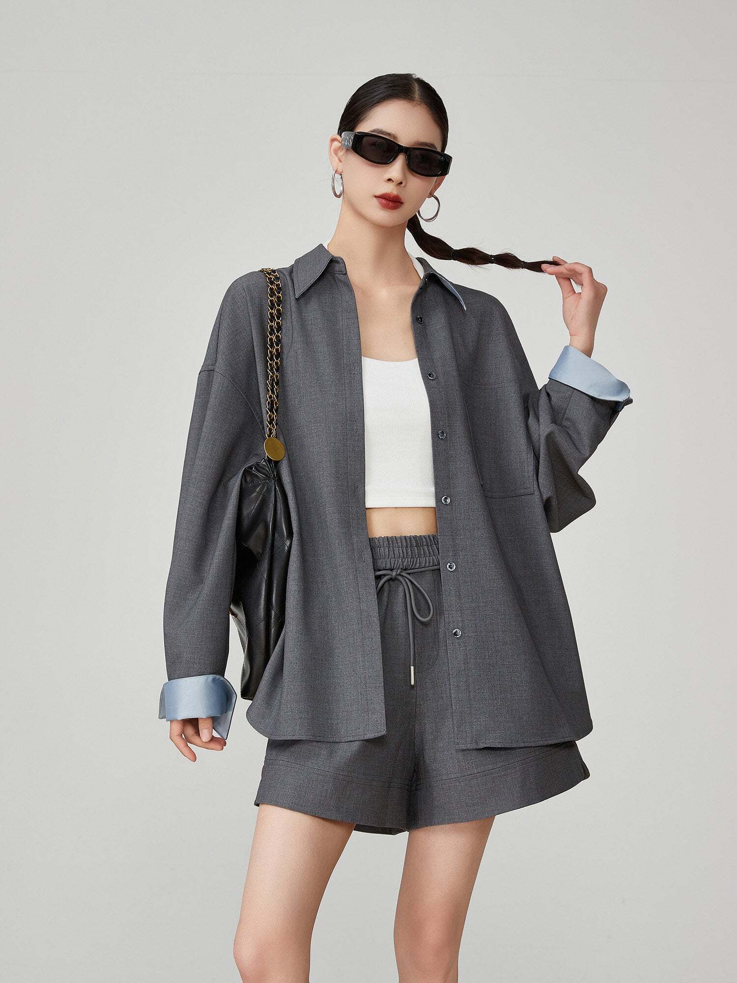 A chic color scheme, a set-up of a shirt and pants that suppresses sweetness.