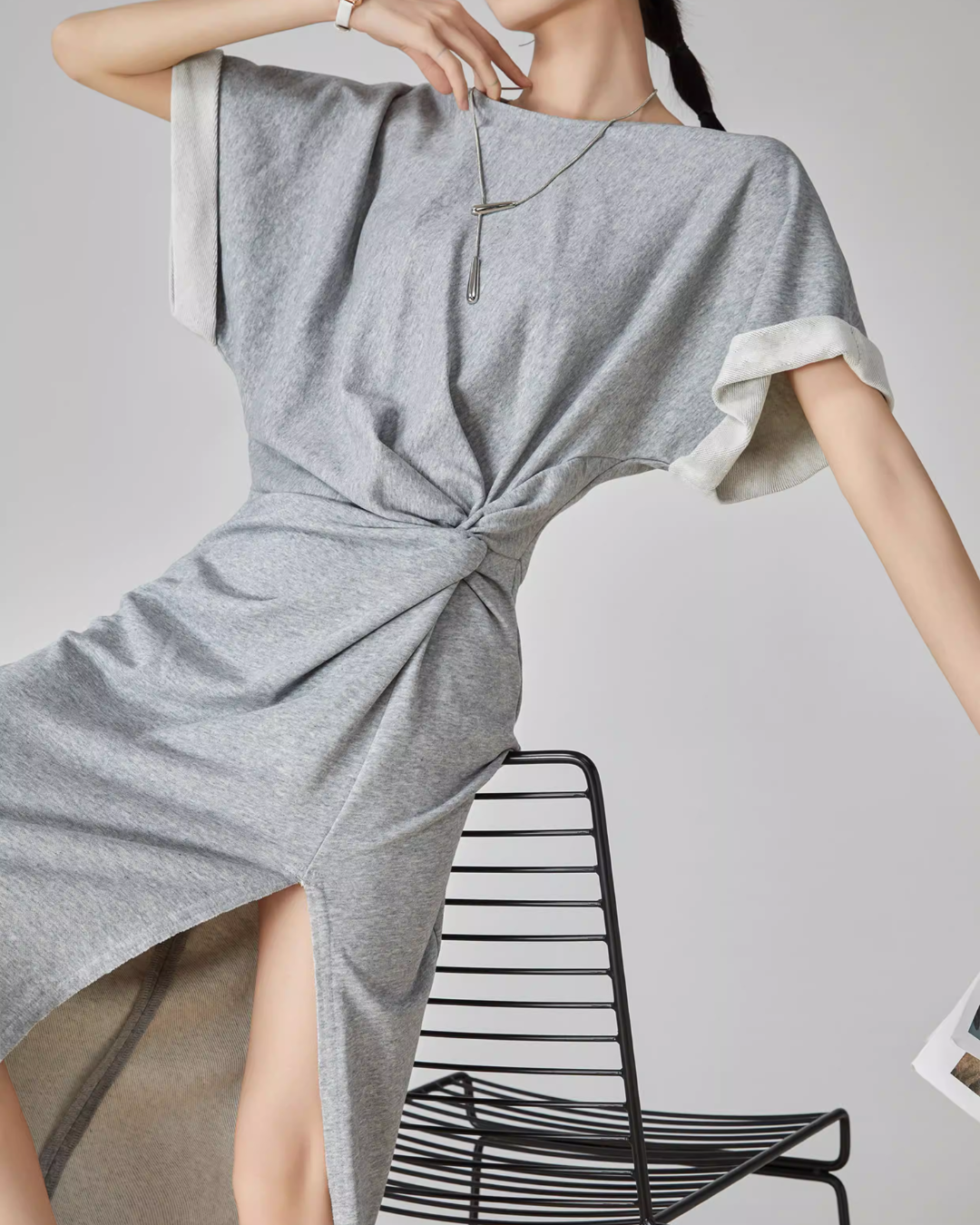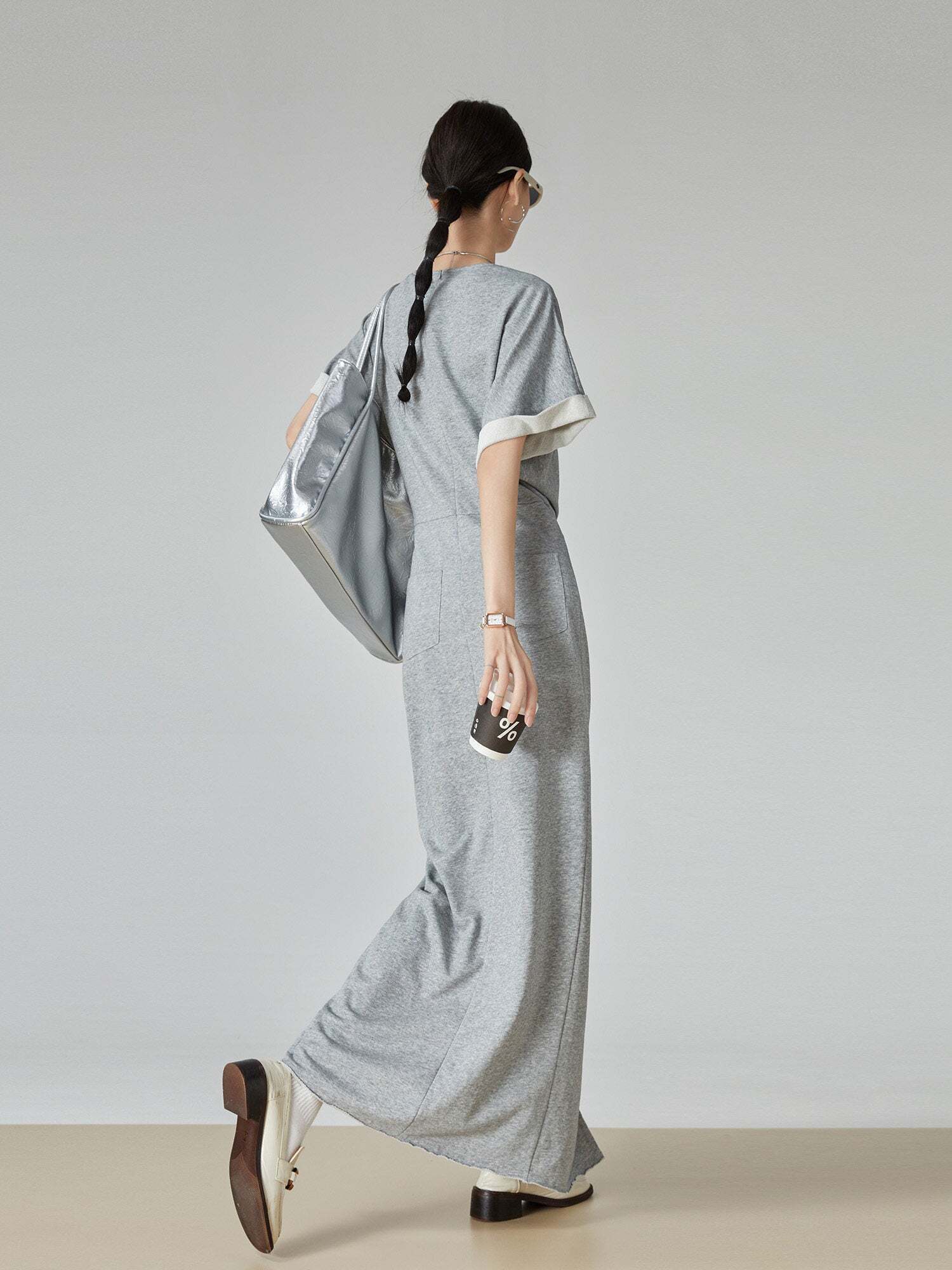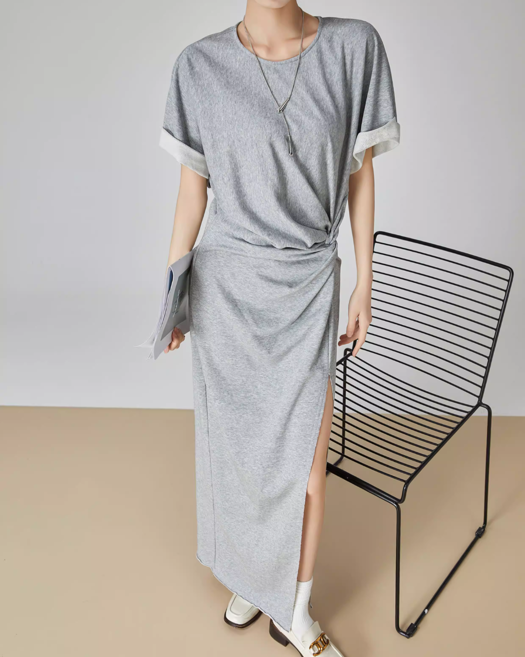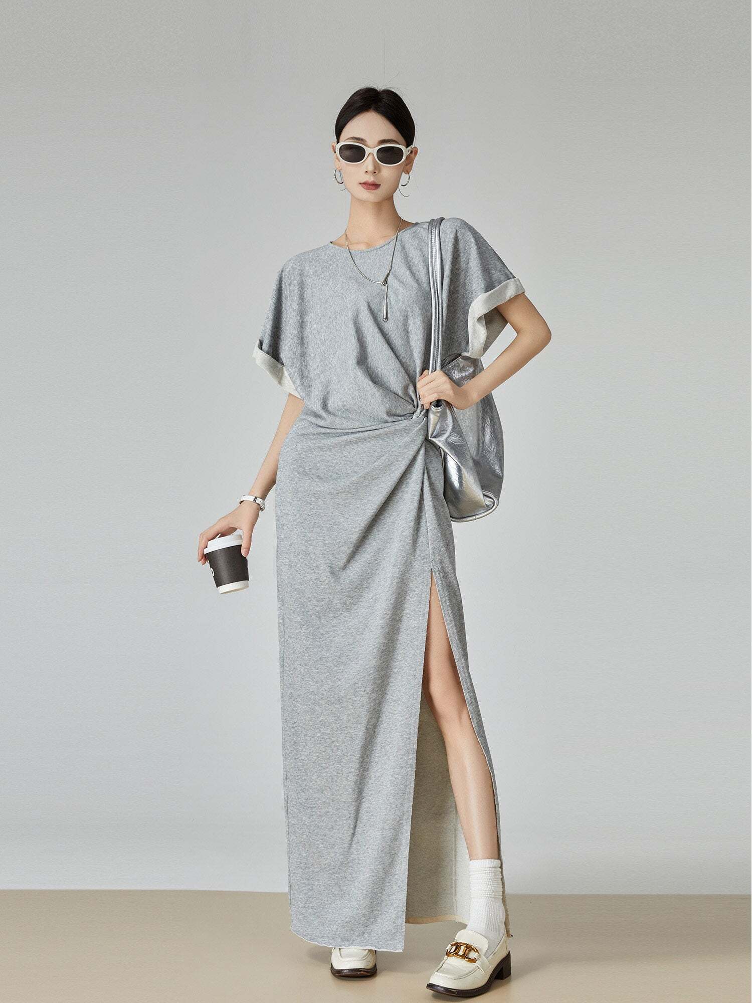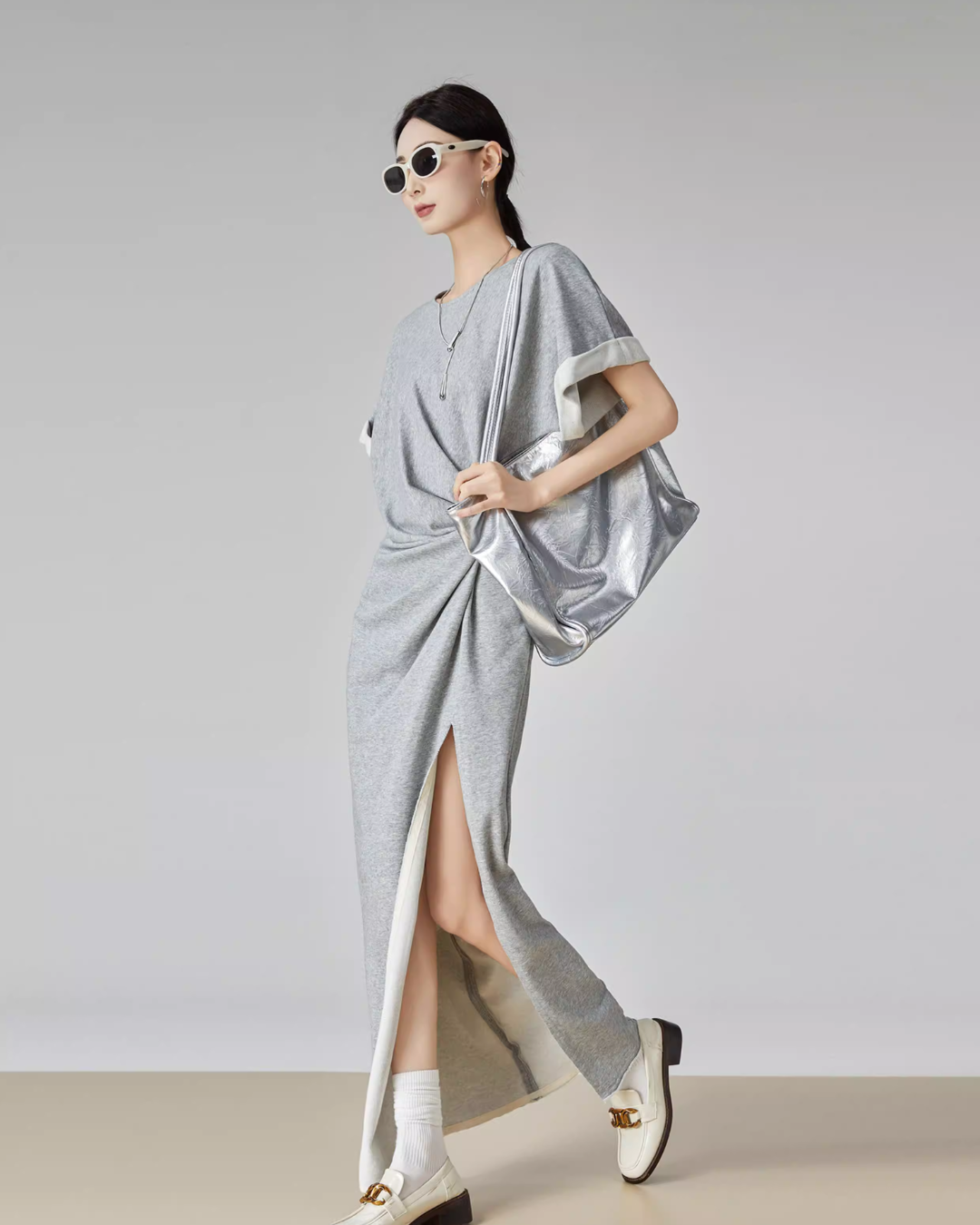 It features a deep slit in the front, allowing for ease of movement while creating a sense of openness.
