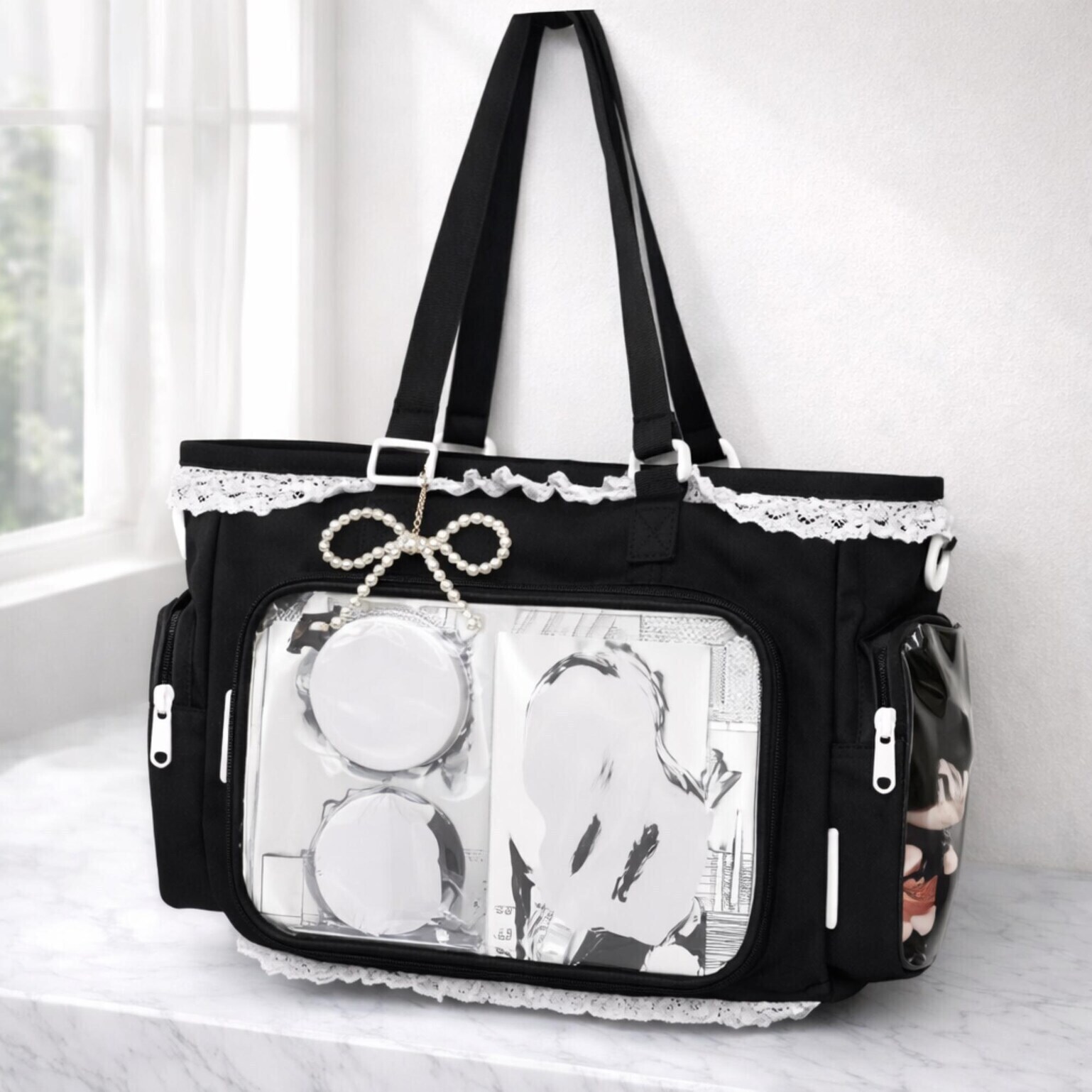 Soft as spring, elegant as lace, and designed to celebrate your fandom-this Mint Green Lace Ita Bag is your personal moving gallery. Featuring delicate coquette lace details and crystal-clear display windows, it allows you to showcase your favorite enamel pins, charms, plushies, and photocards while keeping them protected.