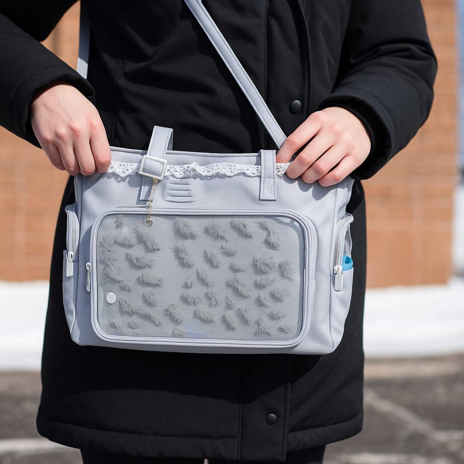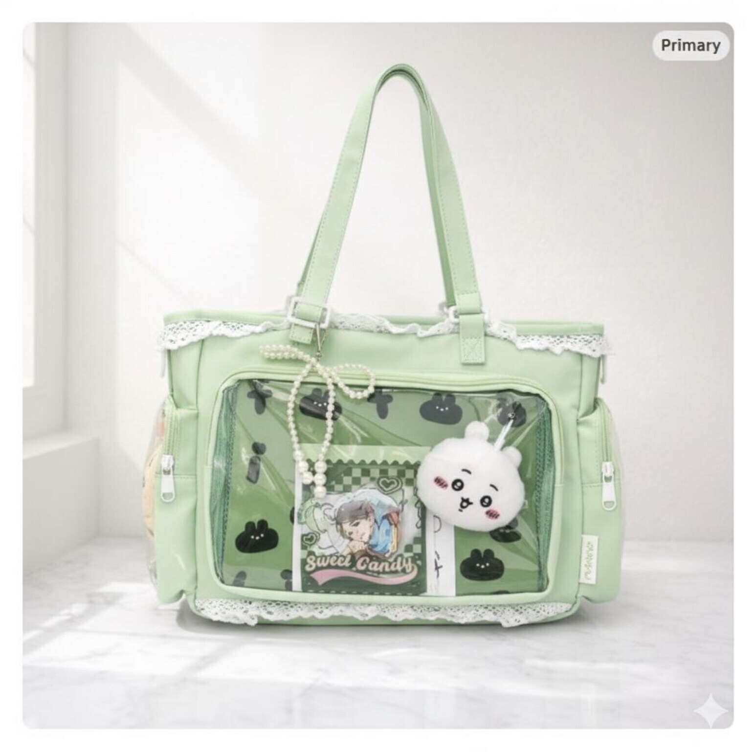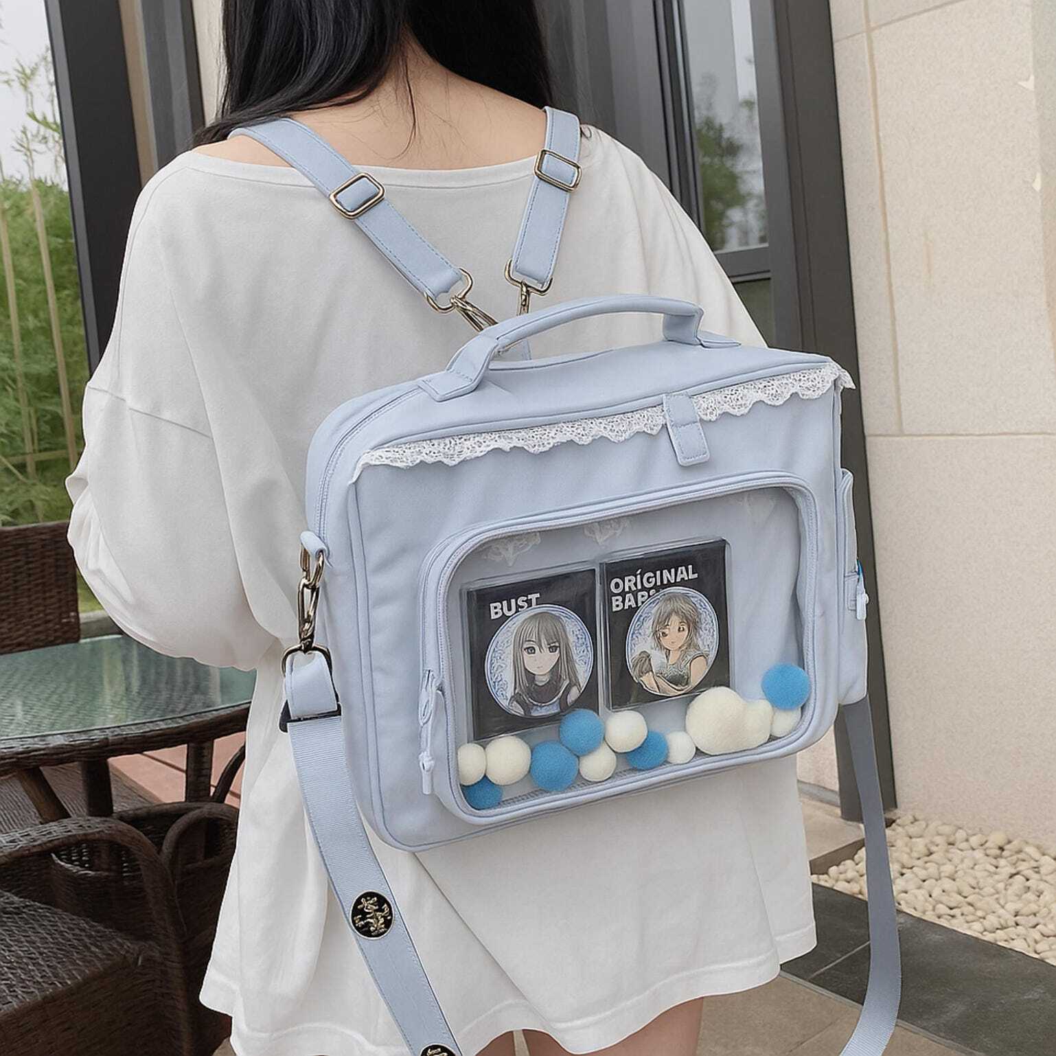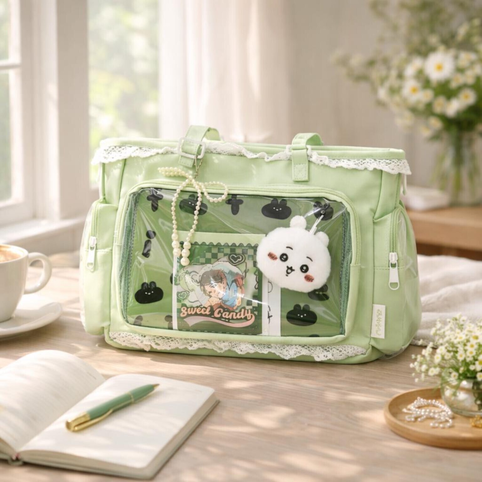 Green Kawaii Ita Shoulder Bag with Clear Window for Plushies and Pins is designed to display plushies, dolls, pins, and badges while keeping everyday essentials organized.