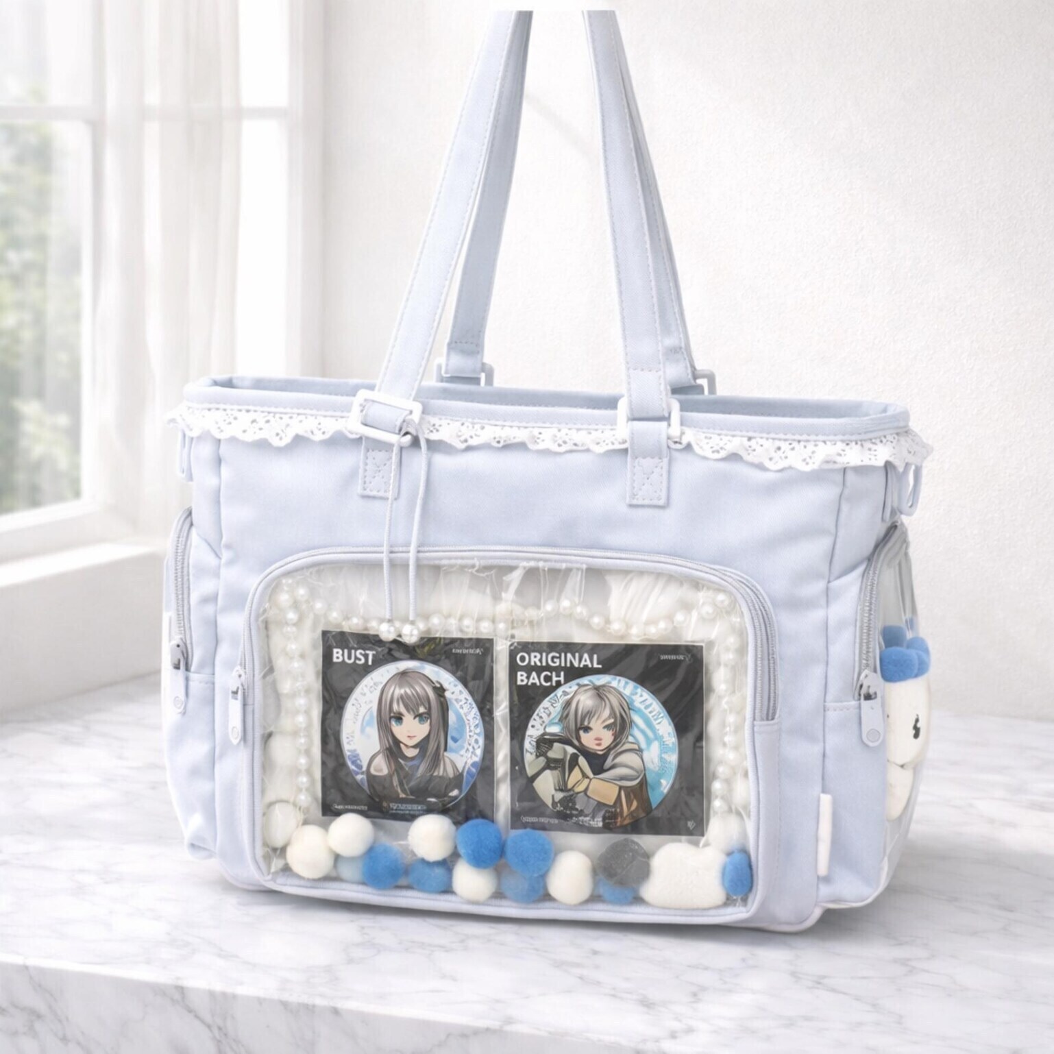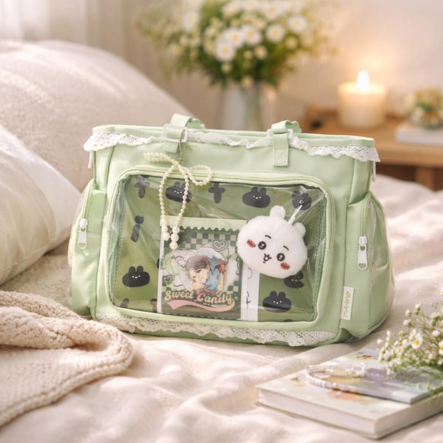 Mint Green Lace Ita Bag – Coquette Transparent Display Tote for Pins, Anime & Convention Fans