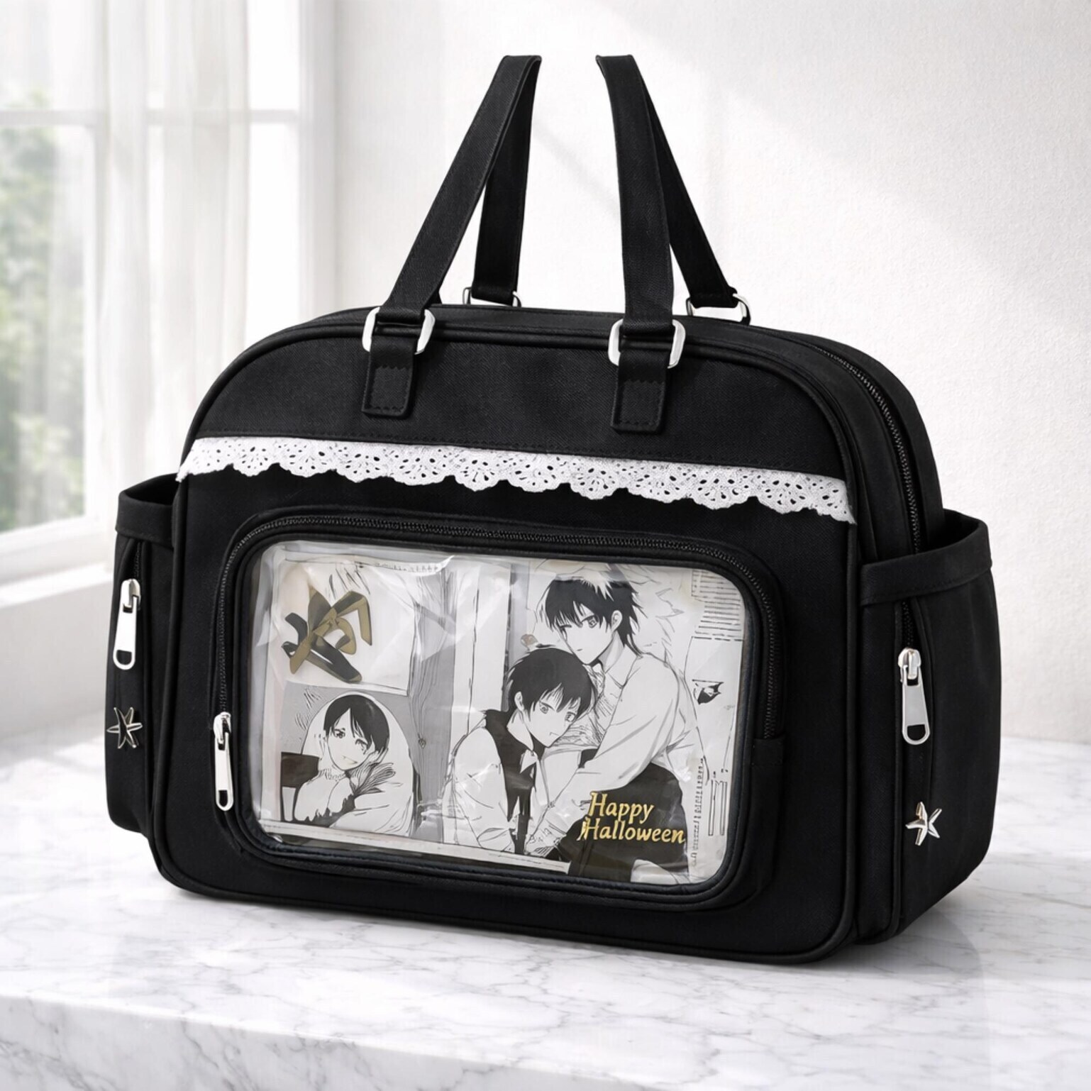 A: This bag is positioned for plushies, dolls, pins, badges, and other small display merch shown through the clear window.