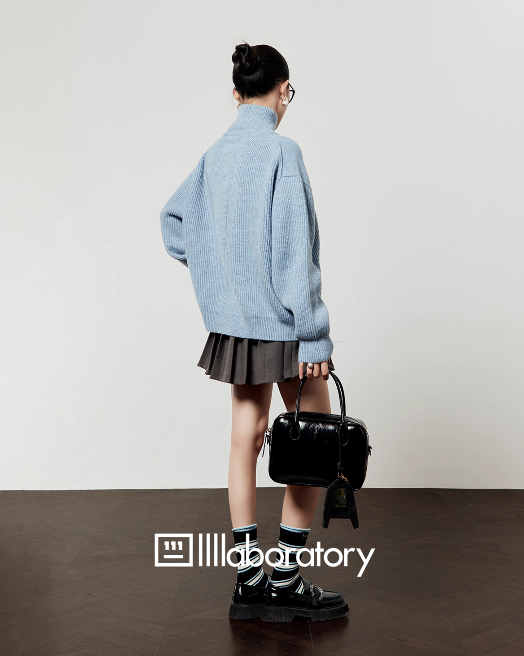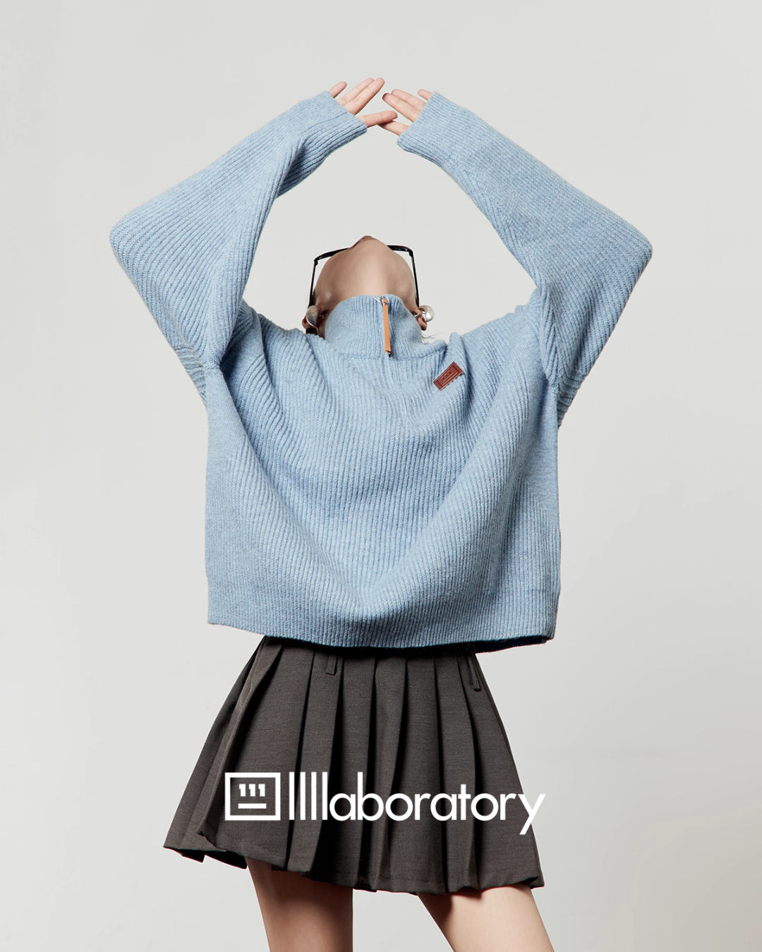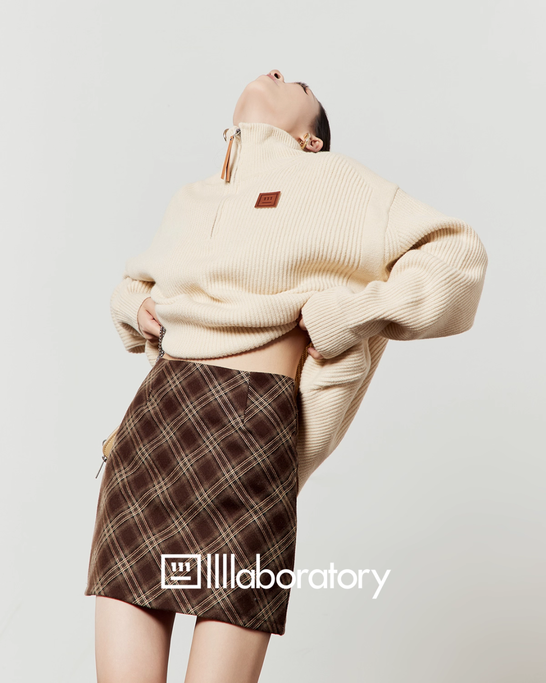 A set-up of a knit top that offers a relaxed fit and a mini skirt.