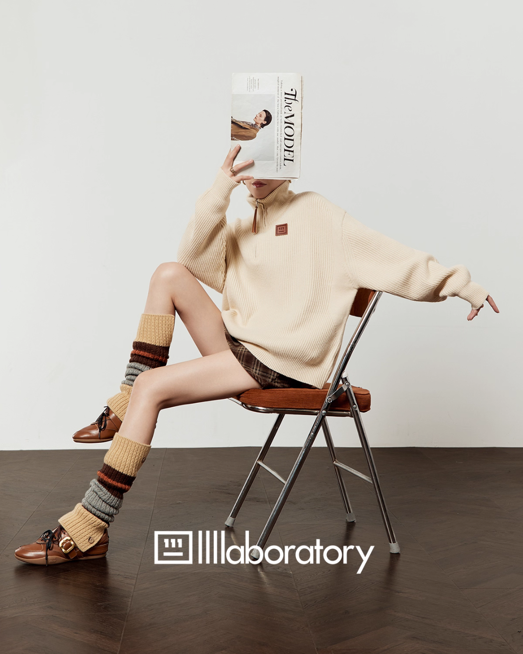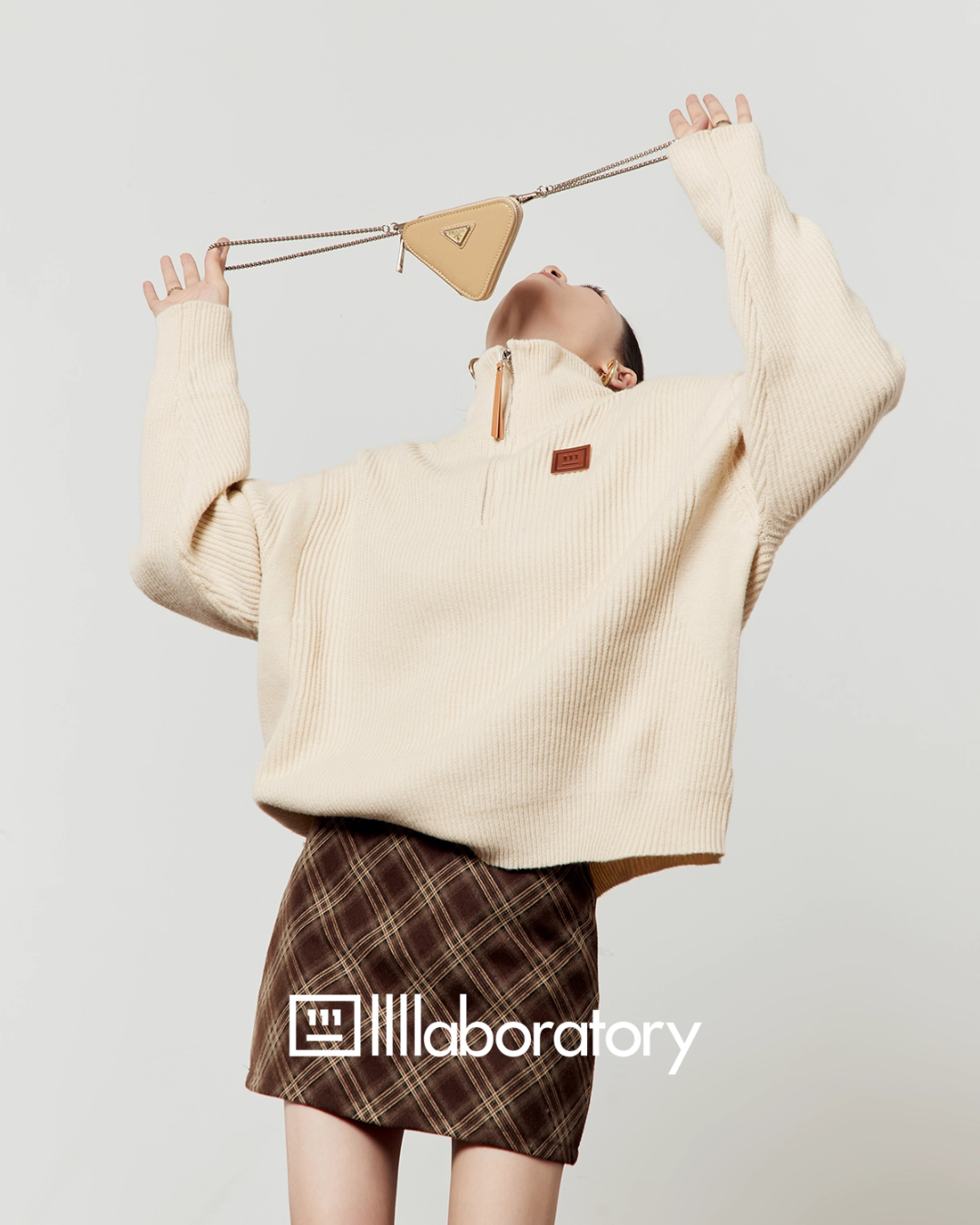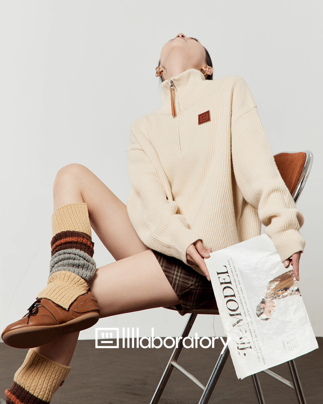 A set-up of a knit top that offers a relaxed fit and a mini skirt.