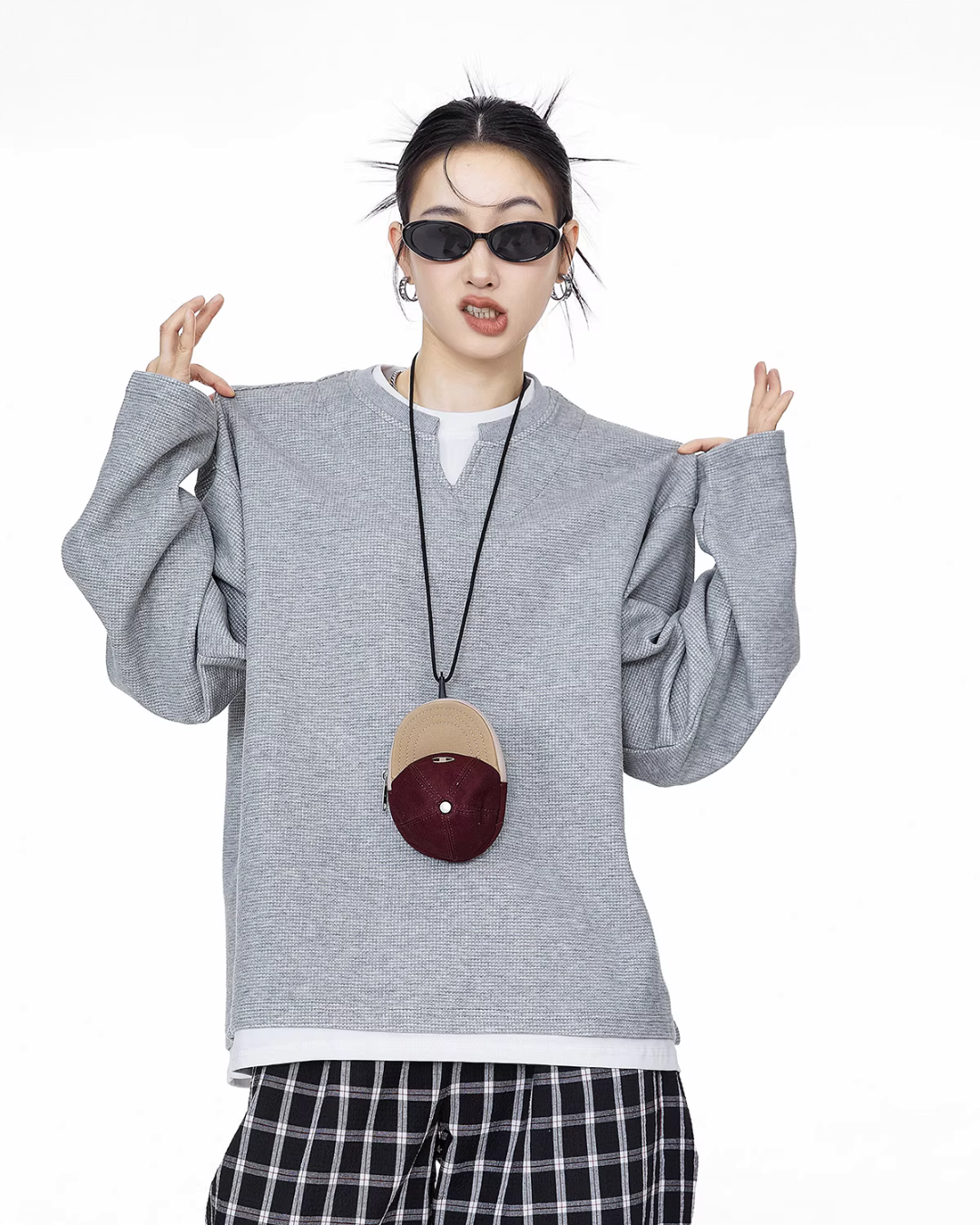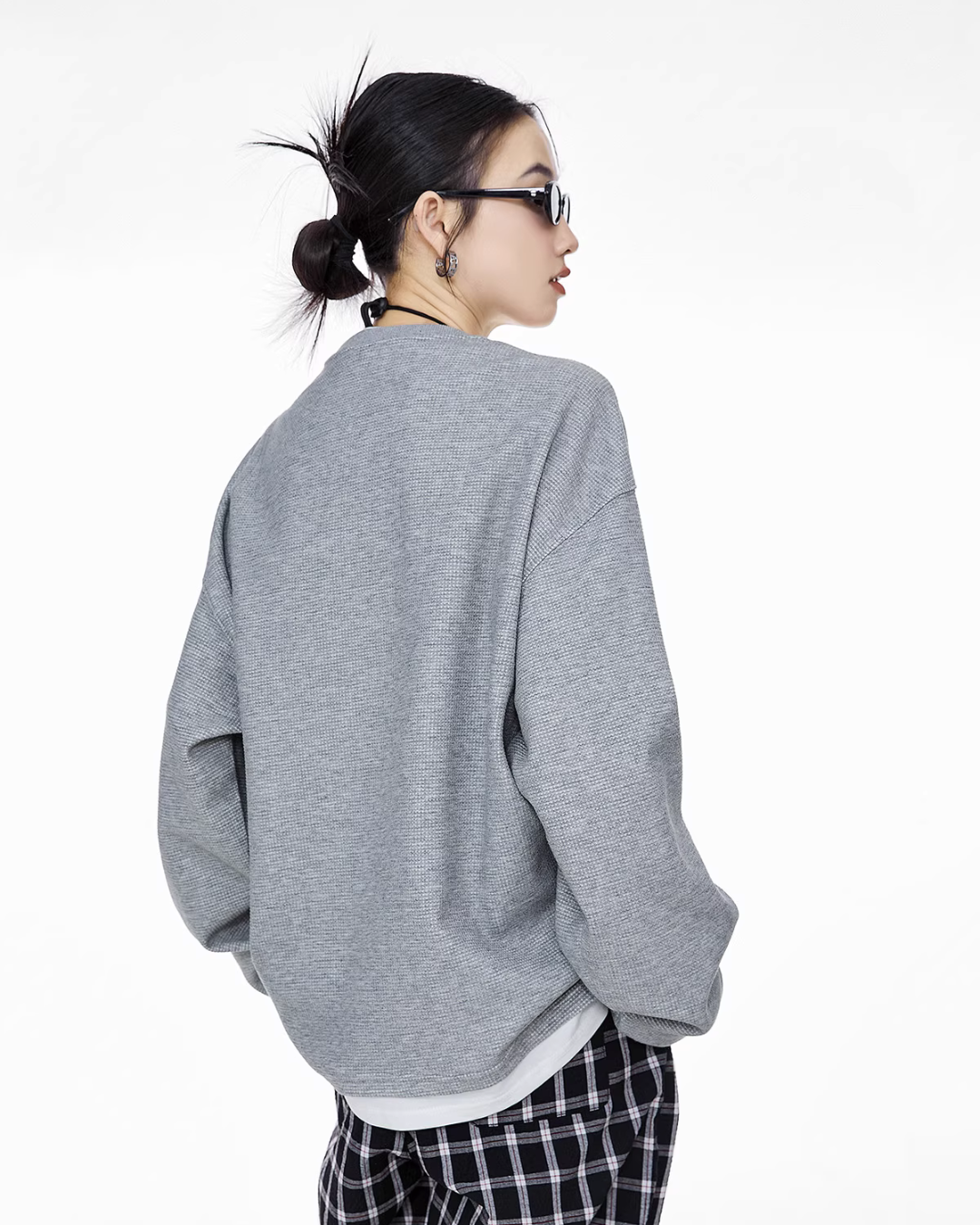 The layered-style long-sleeve top features a color scheme and a henley neck.