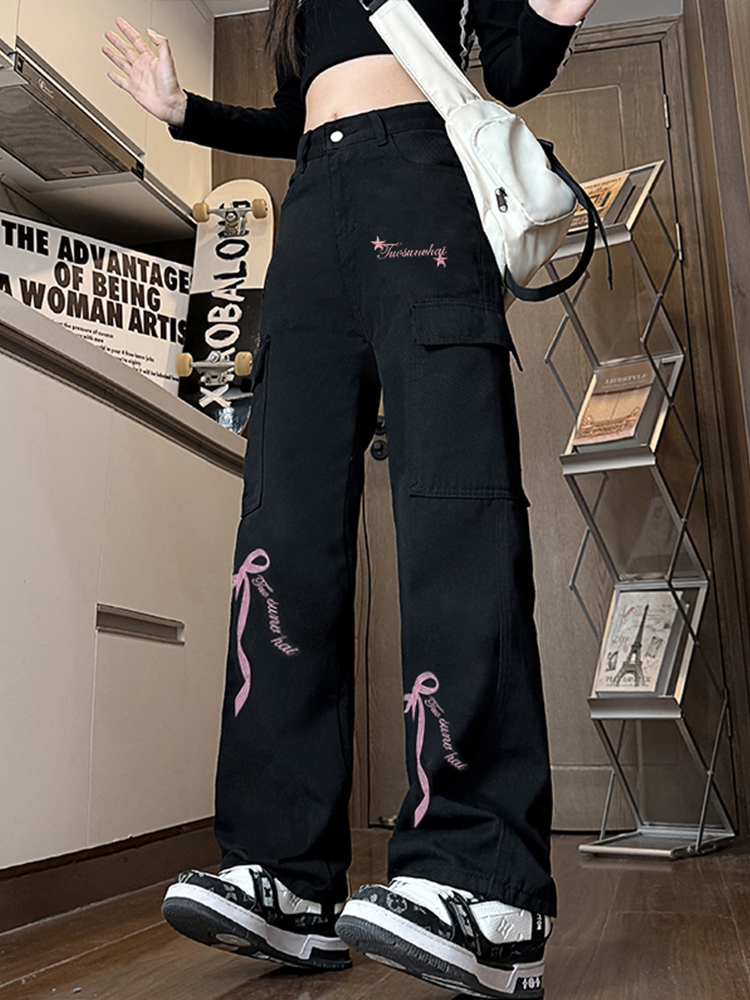 Elevate your wardrobe with our High-Waisted Black Denim Pants for Women, featuring a chic bow print that adds a playful touch to your style. Designed with a slimming straight-leg fit, these wide-leg trousers offer flattering coverage while ensuring all-day comfort, making them perfect for both work and casual outings. Experience the perfect blend of American-style high street fashion and practicality add these versatile pants to your cart today and step out in confidence!