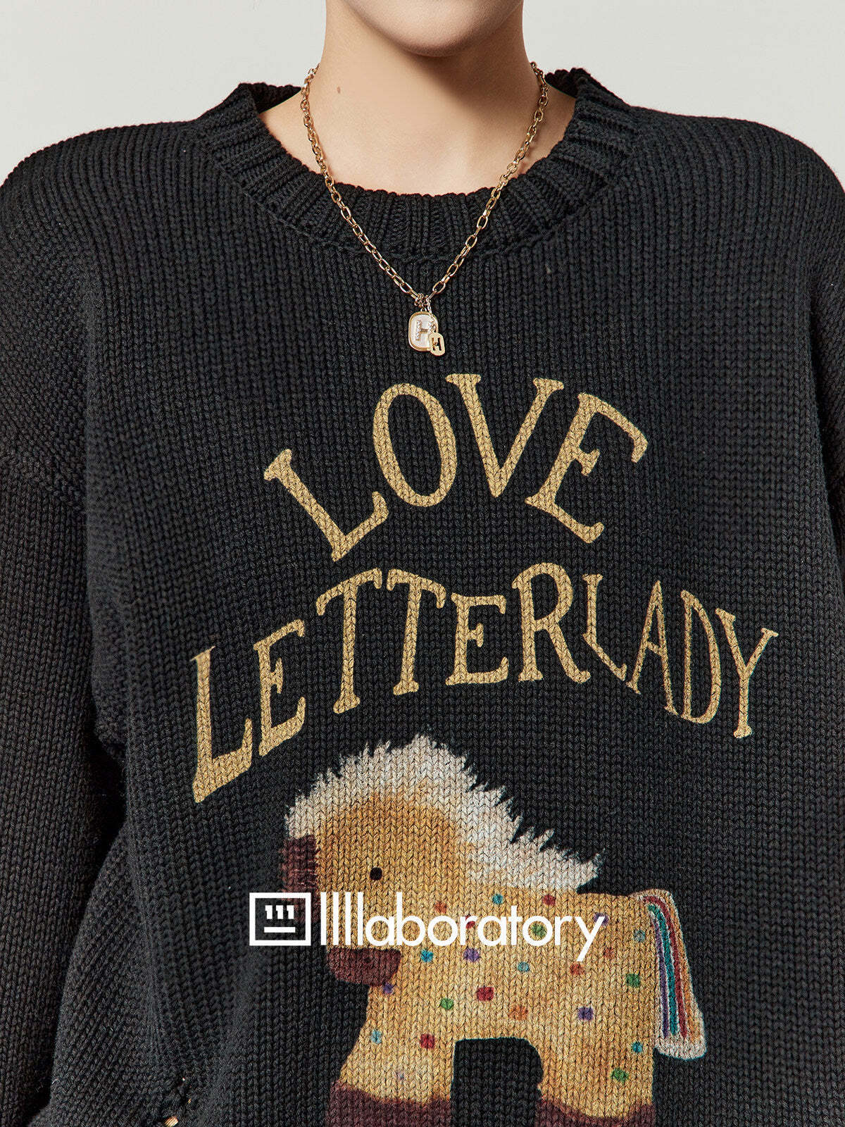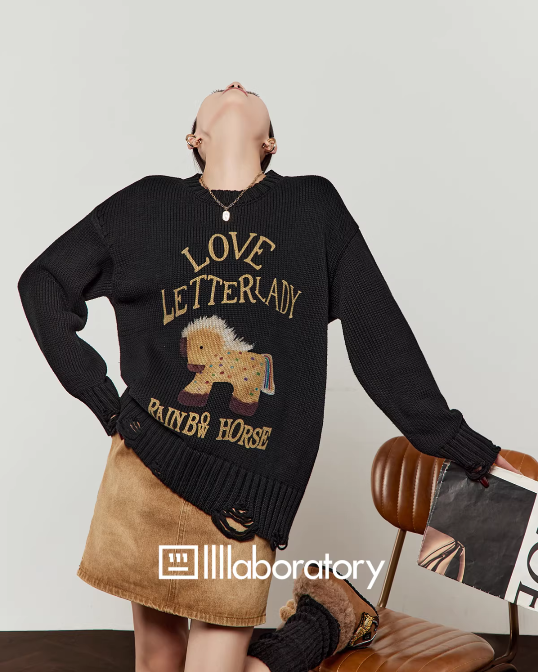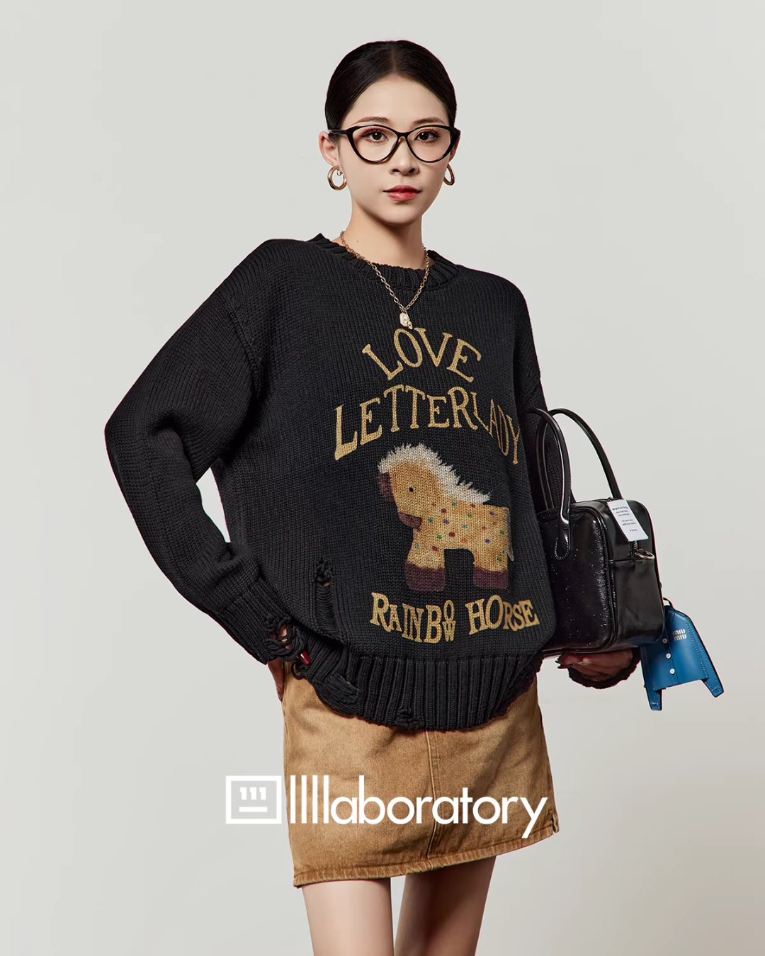 A knit top with a retro touch horse print that stands out, with a strong presence.