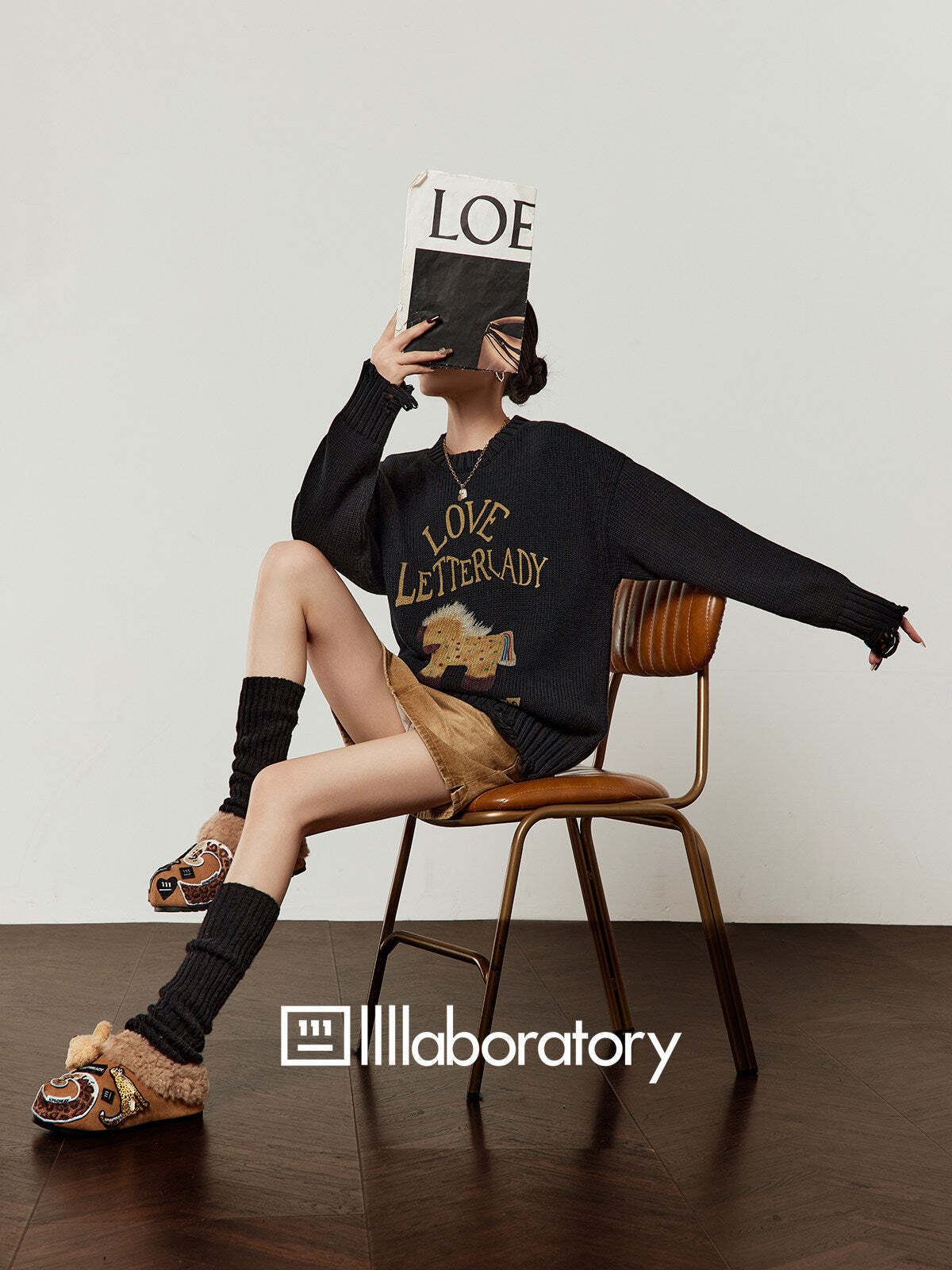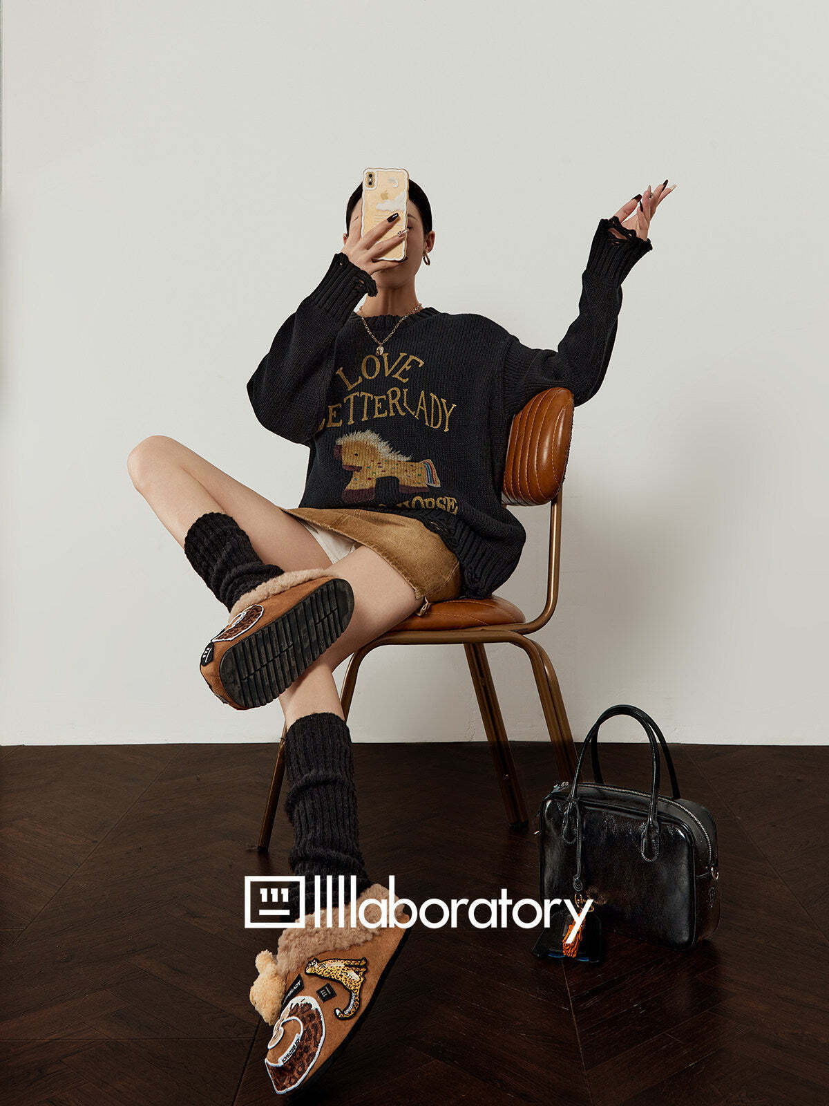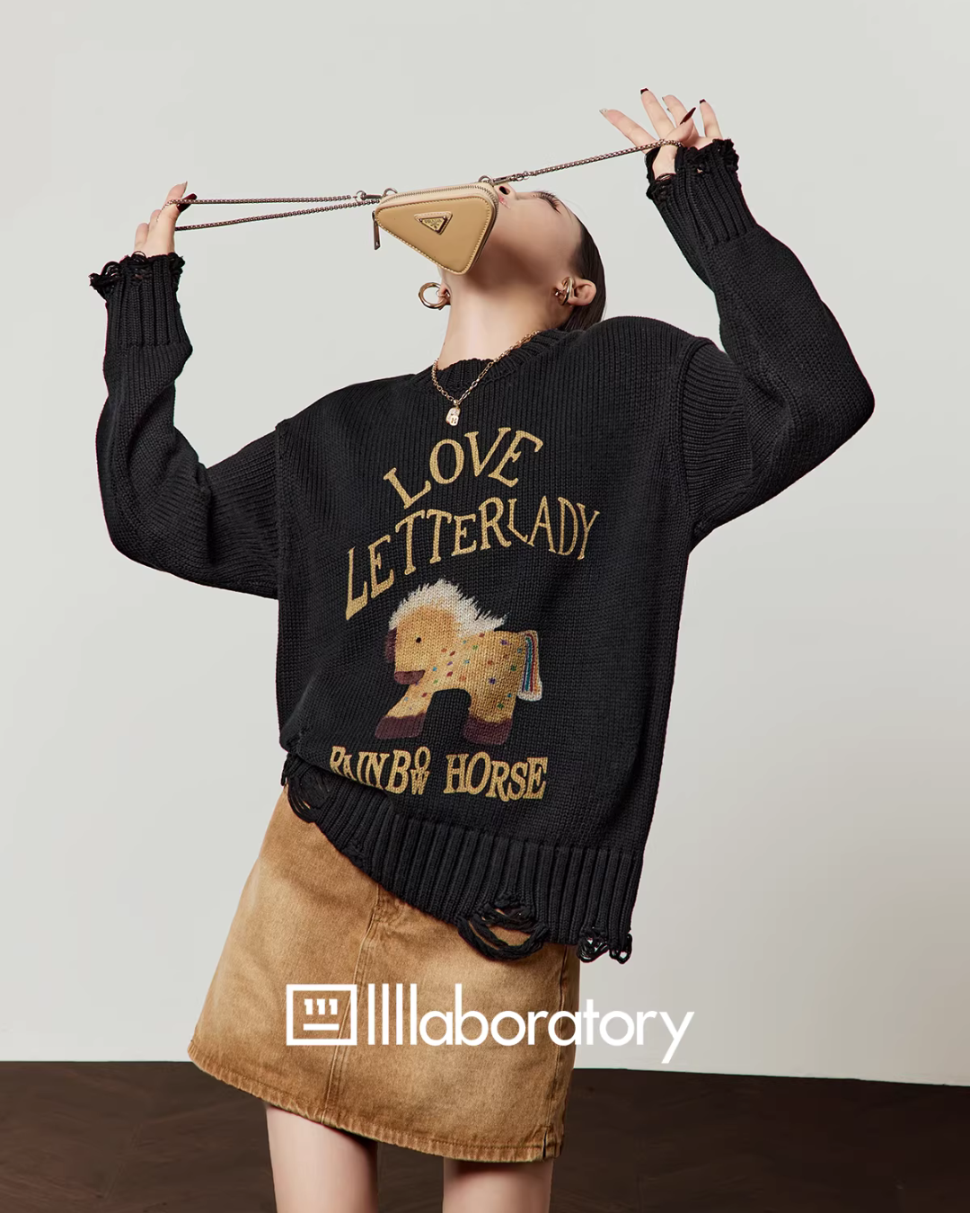 A knit top with a retro touch horse print that stands out, with a strong presence.