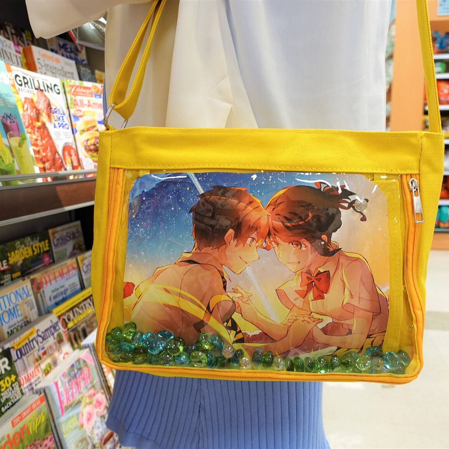 This classic-sized ita crossbody bag is made of lightweight, water-resistant canvas, making it comfortable and practical for everyday use. Designed with a clear display window, it’s perfect for showcasing pins, photos, stickers, charms, or small collectibles while keeping your essentials organized.
