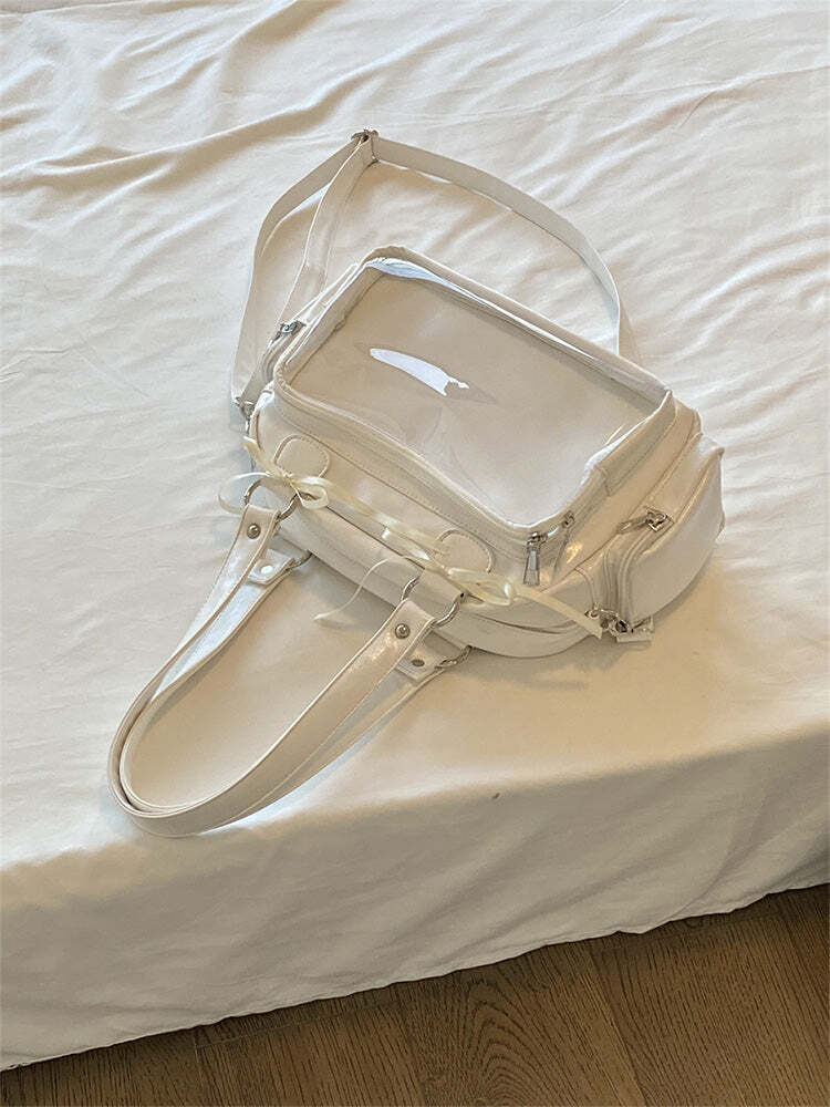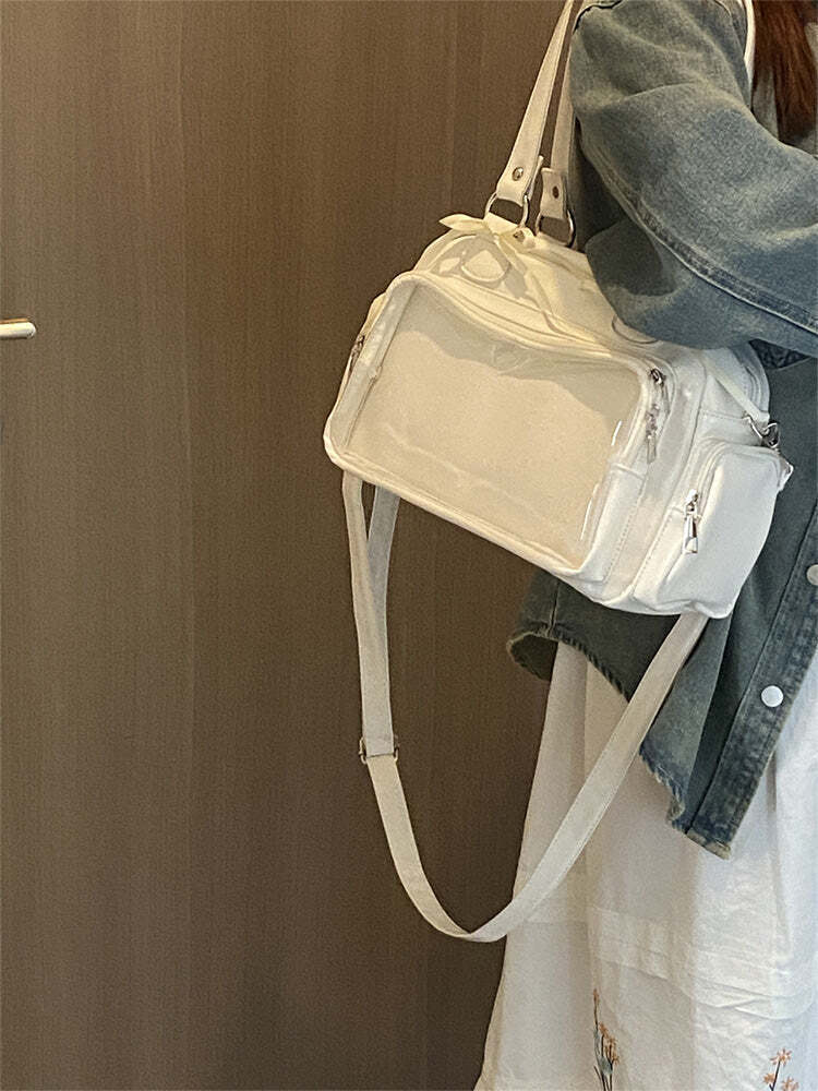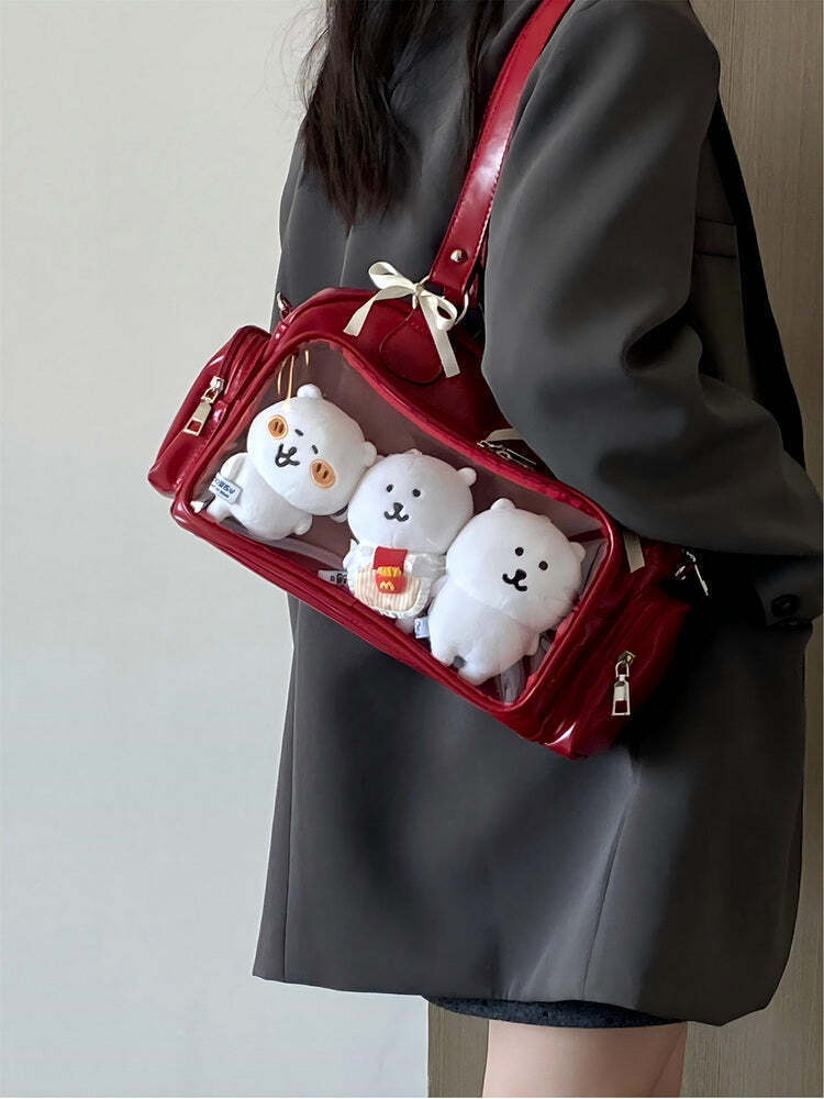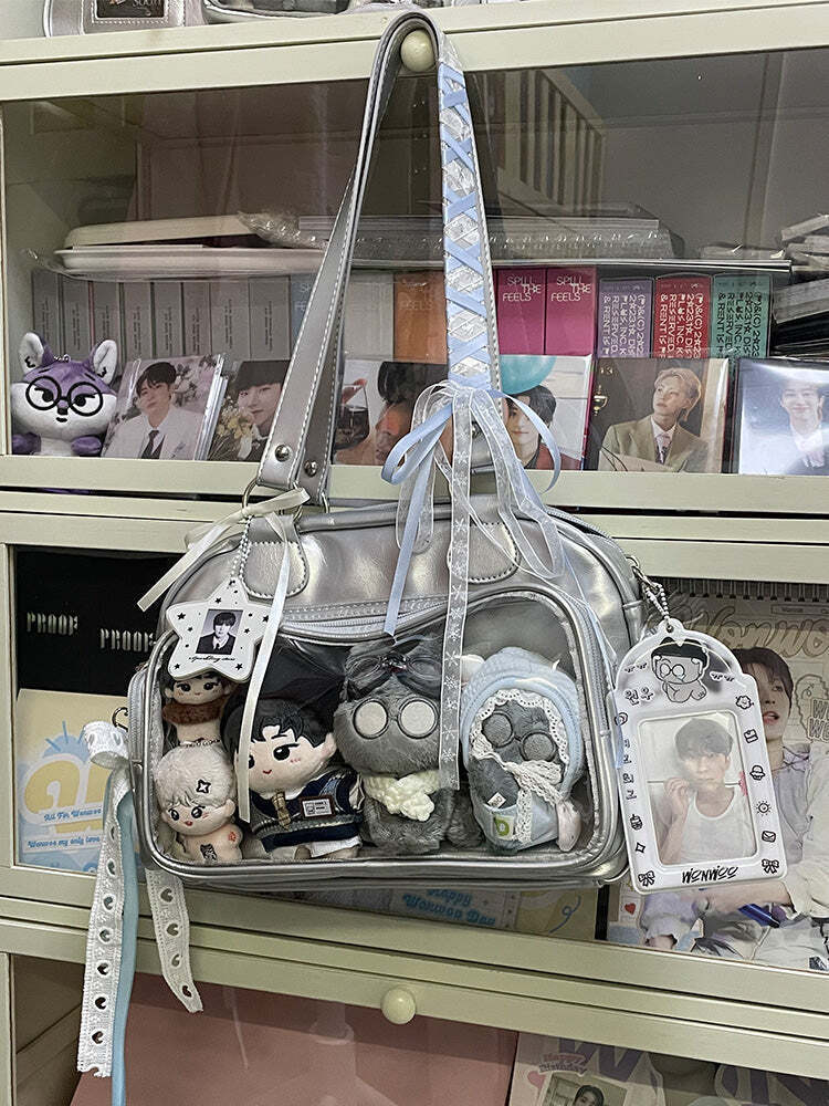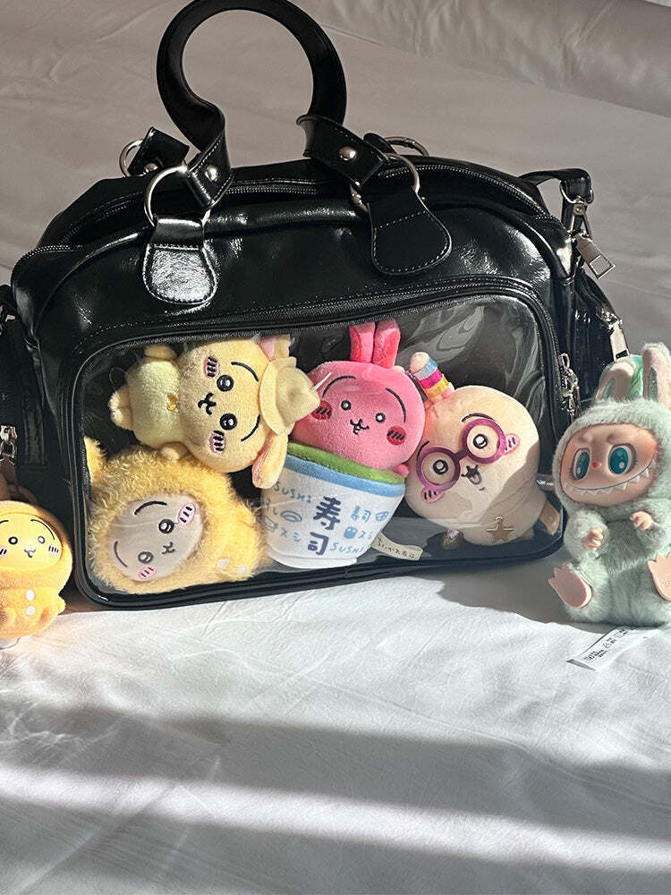 Ita Bag with Clear Window for Plushies and Pins is designed to display plushies, dolls, pins, and badges while keeping everyday essentials organized.