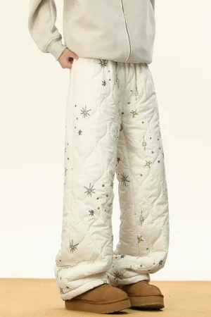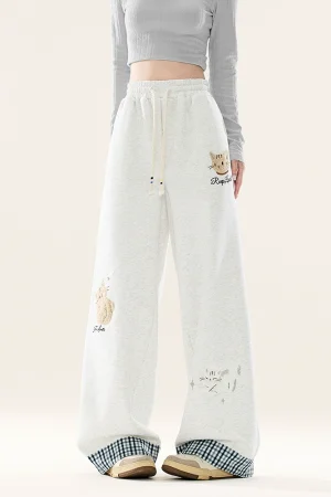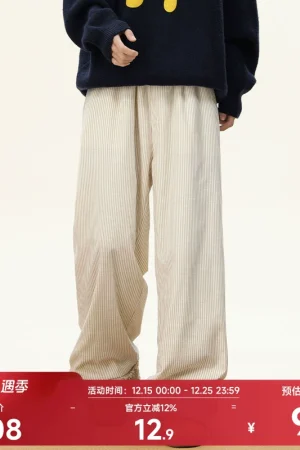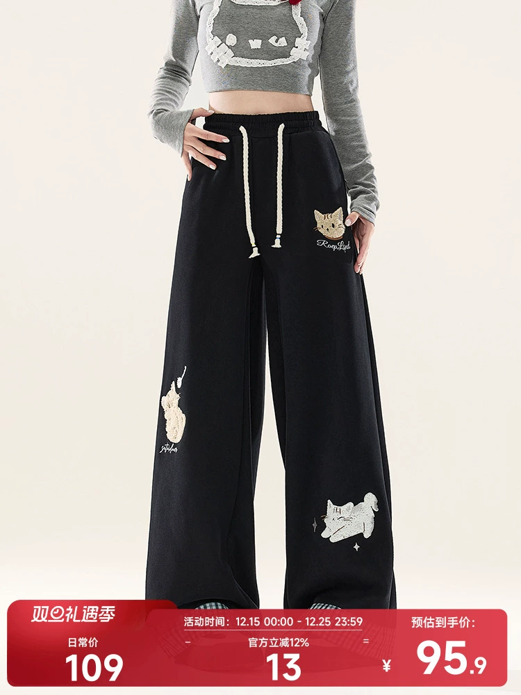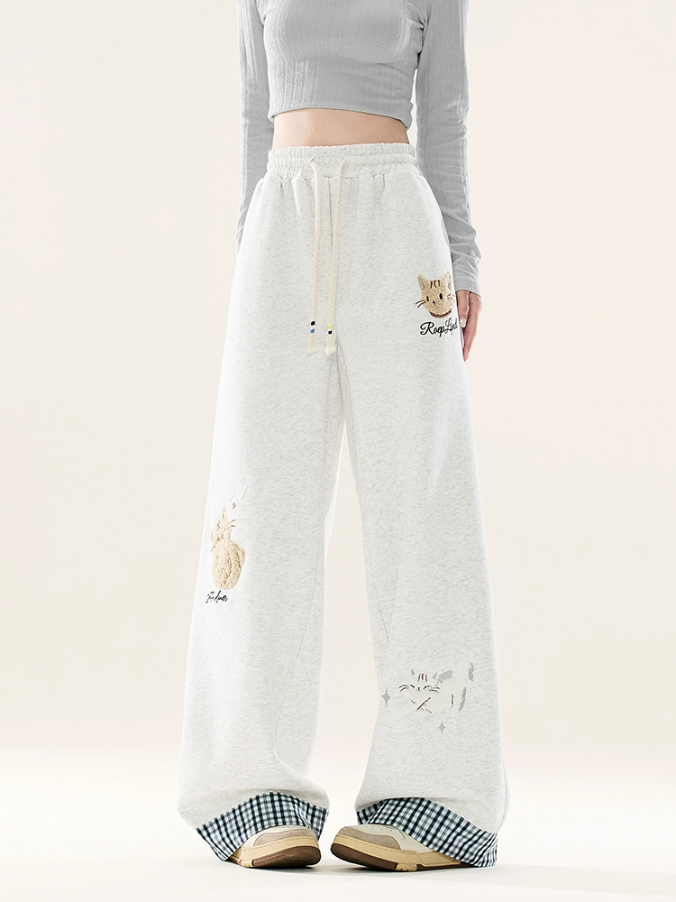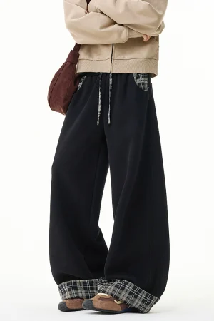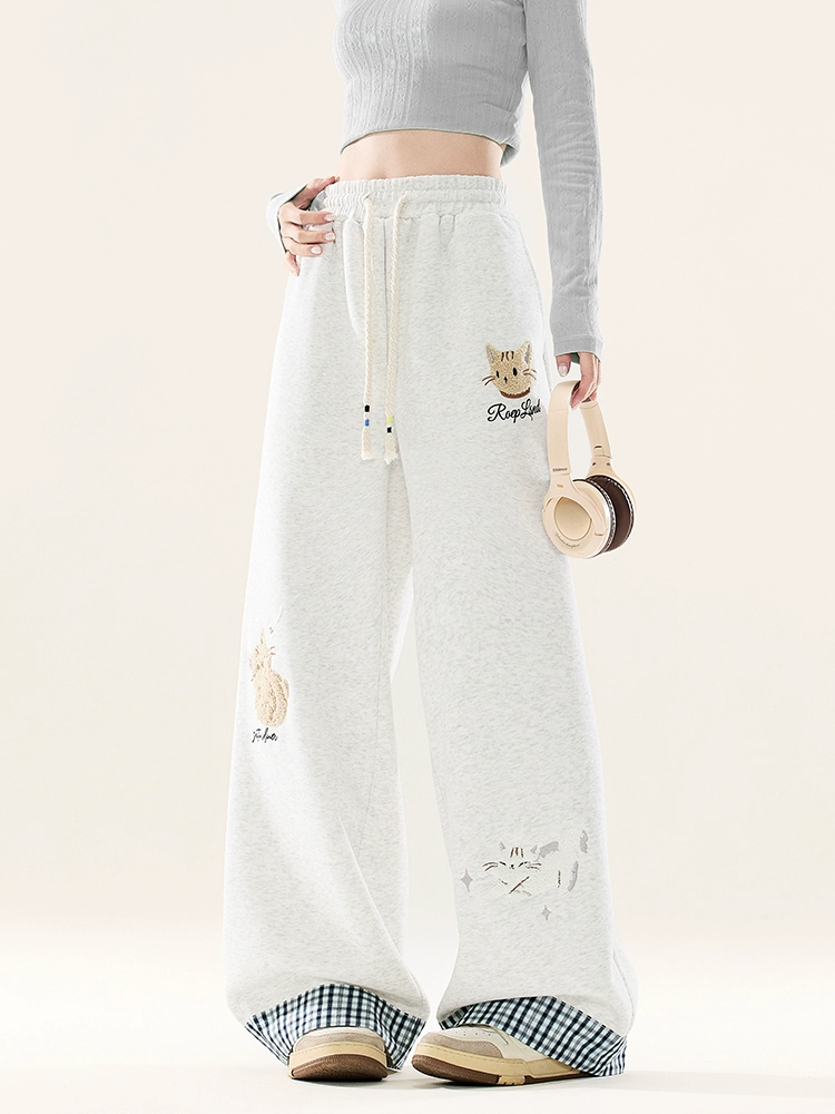 Japanese plush cat flocked plaid curling casual pants for women, high-waisted, loose and drapey, floor-length wide-leg sports pants