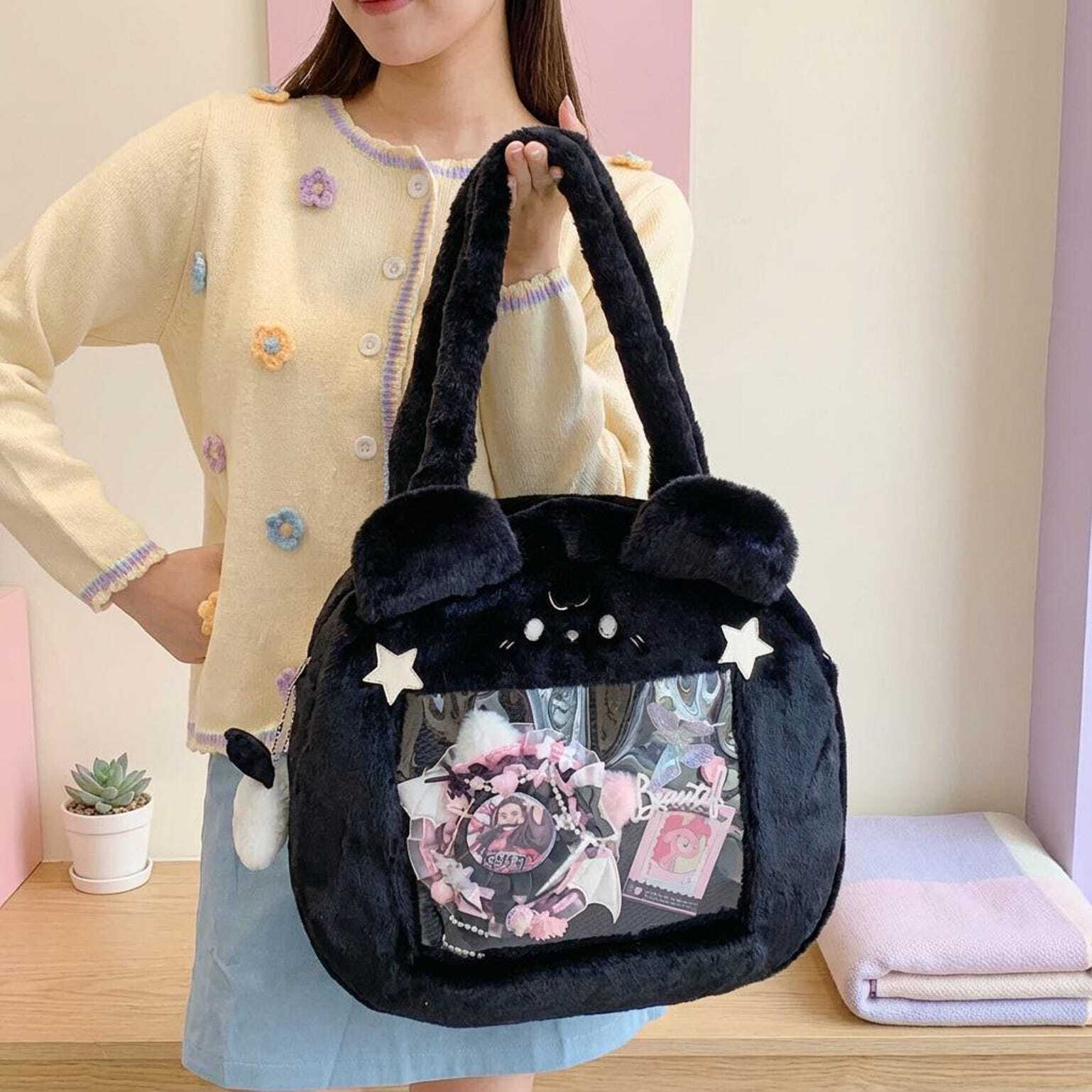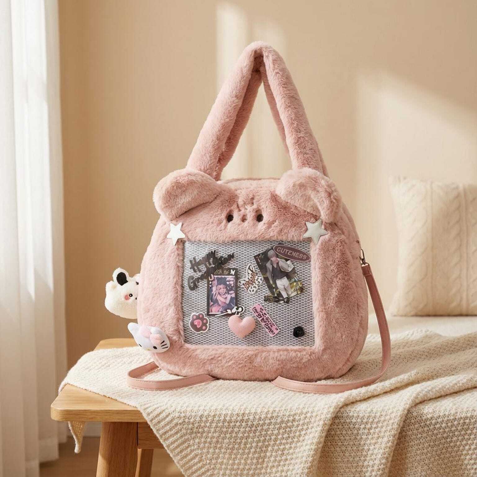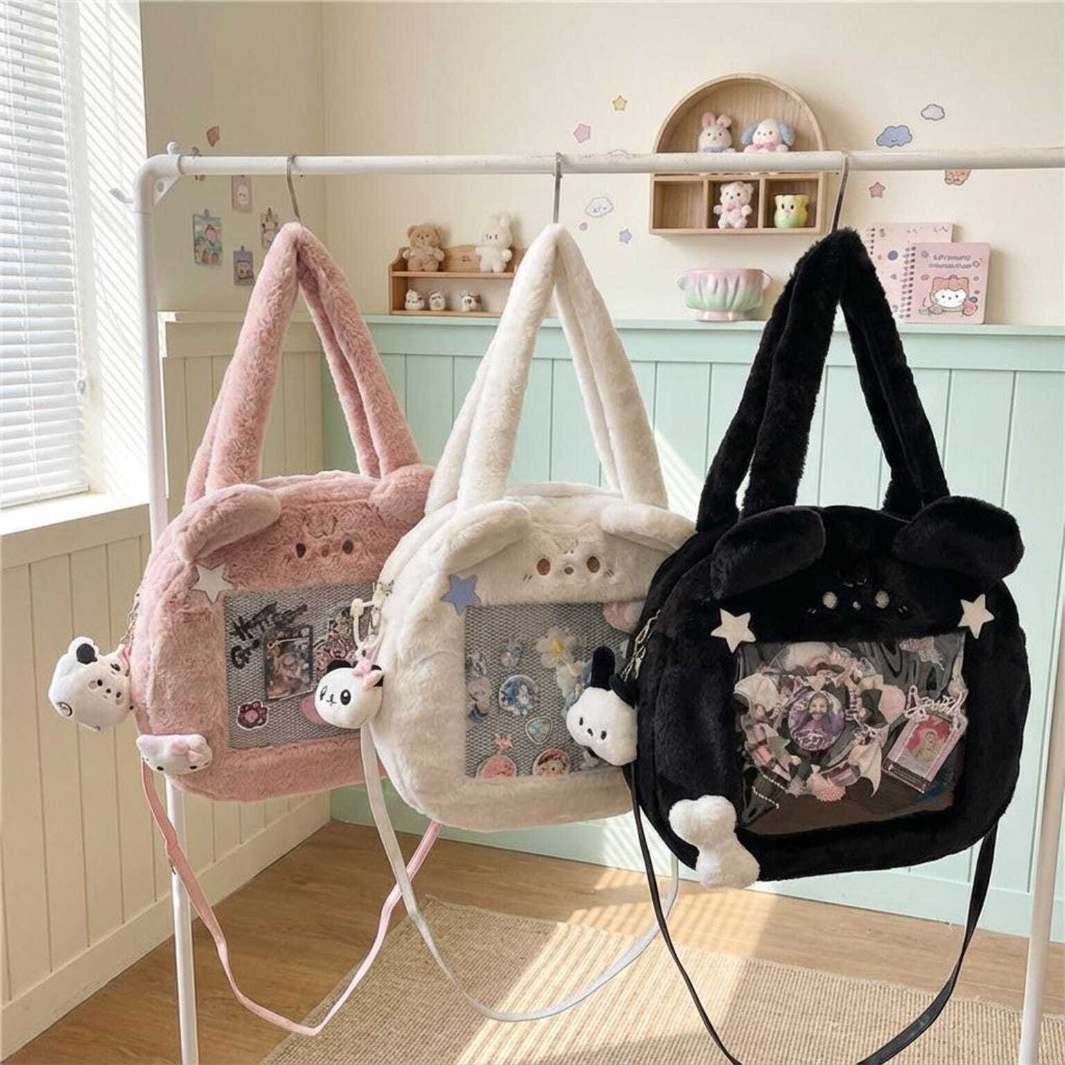 Kawaii Bunny Ita Shoulder Bag for Plushies and Pins is designed to display plushies, dolls, pins, and badges while keeping everyday essentials organized.