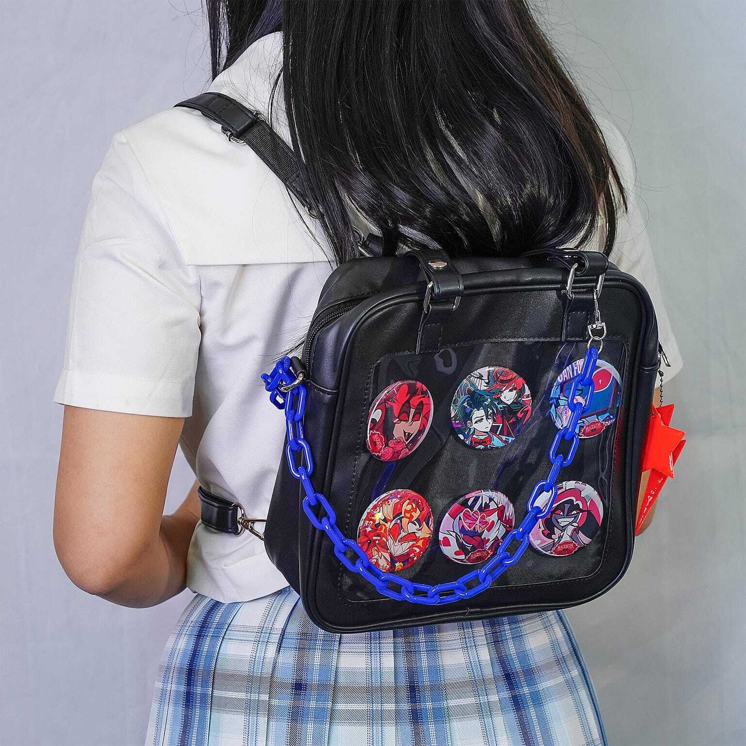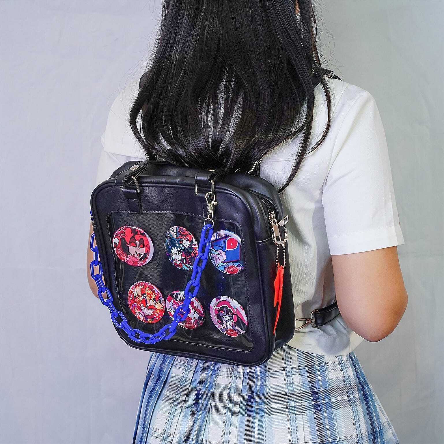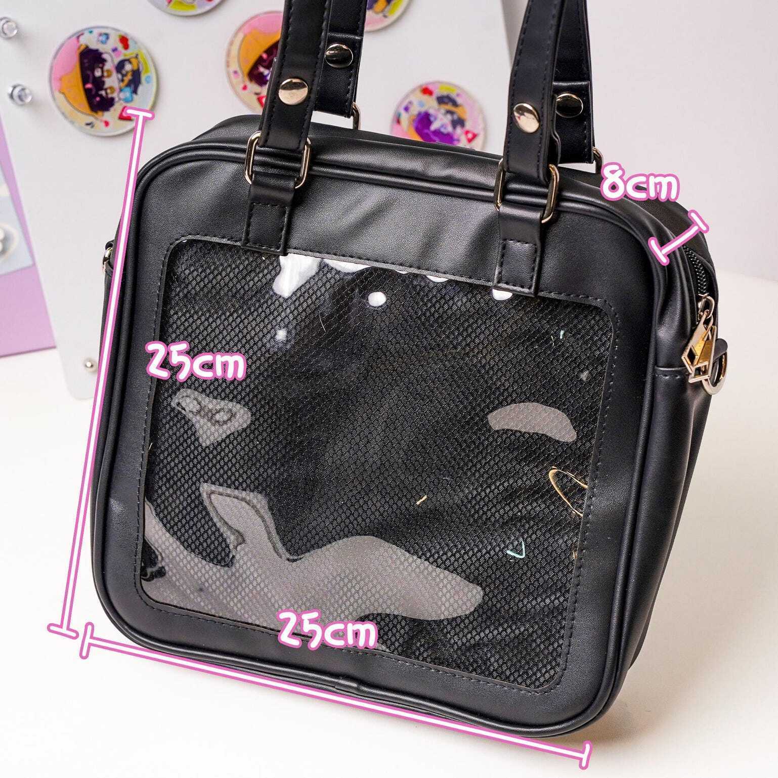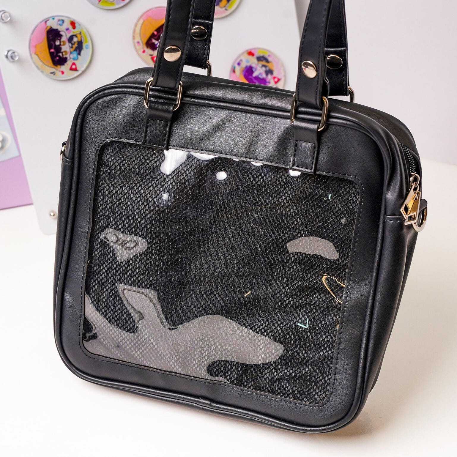 Kawaii Convertible Ita Bag with Clear Window for Plushies and Pins is designed to display plushies, dolls, pins, and badges while keeping everyday essentials organized.