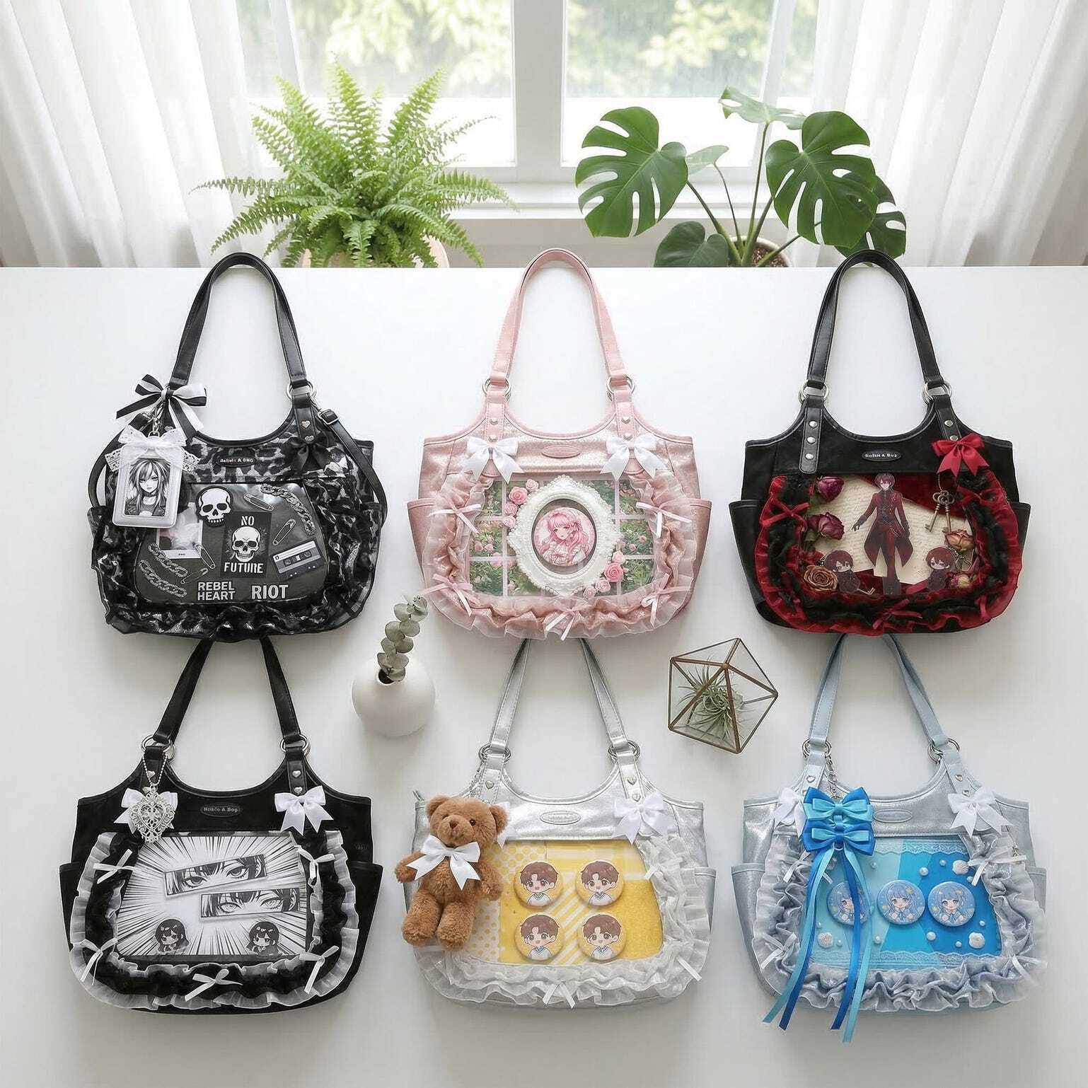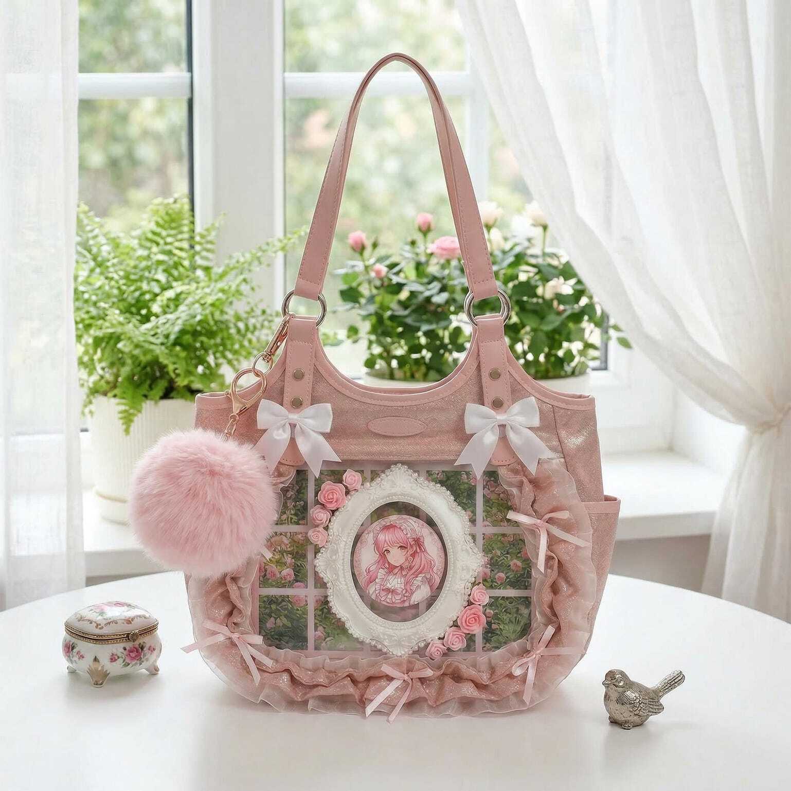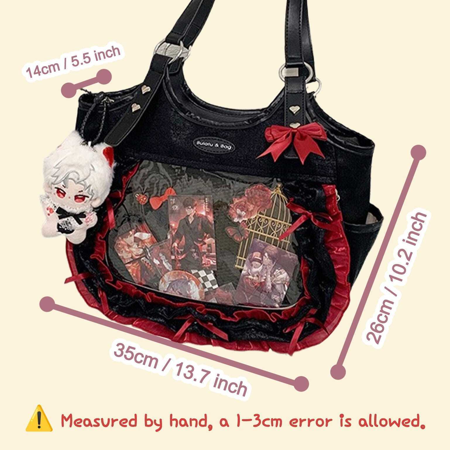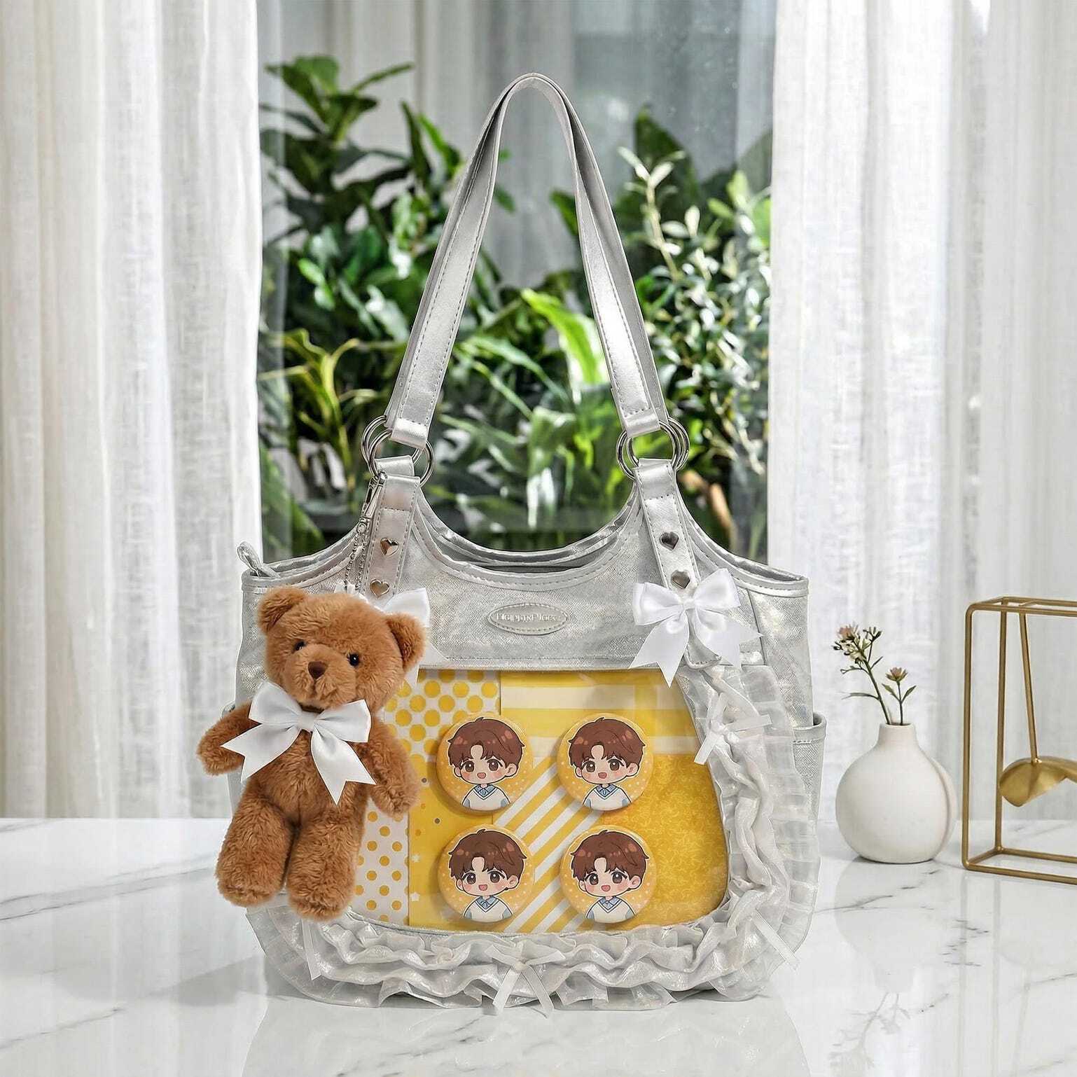 Kawaii Heart Ita Shoulder Bag with Clear Window for Pin Display combines everyday carry with a clear display area for pins, badges, charms, or character merch.