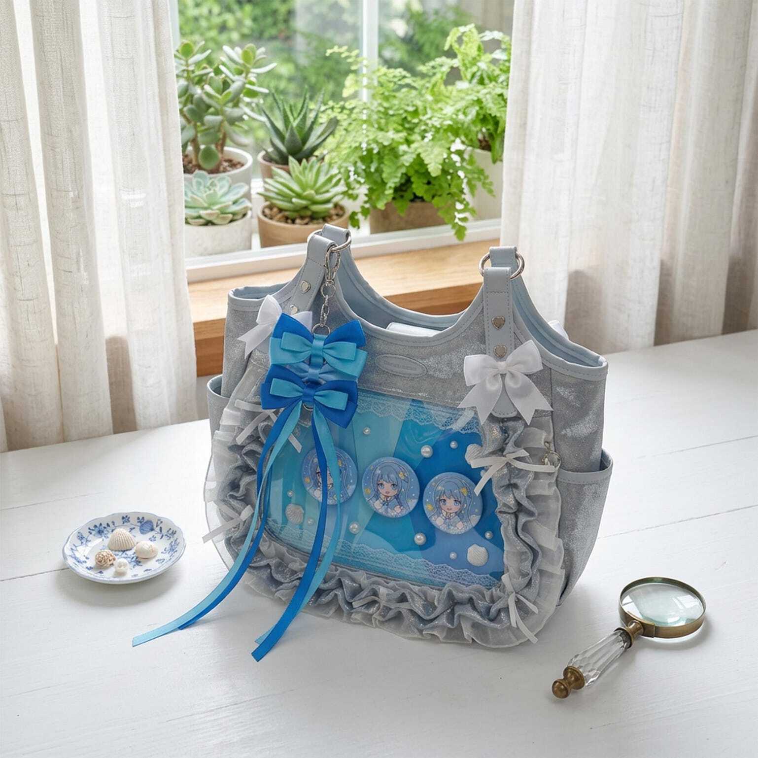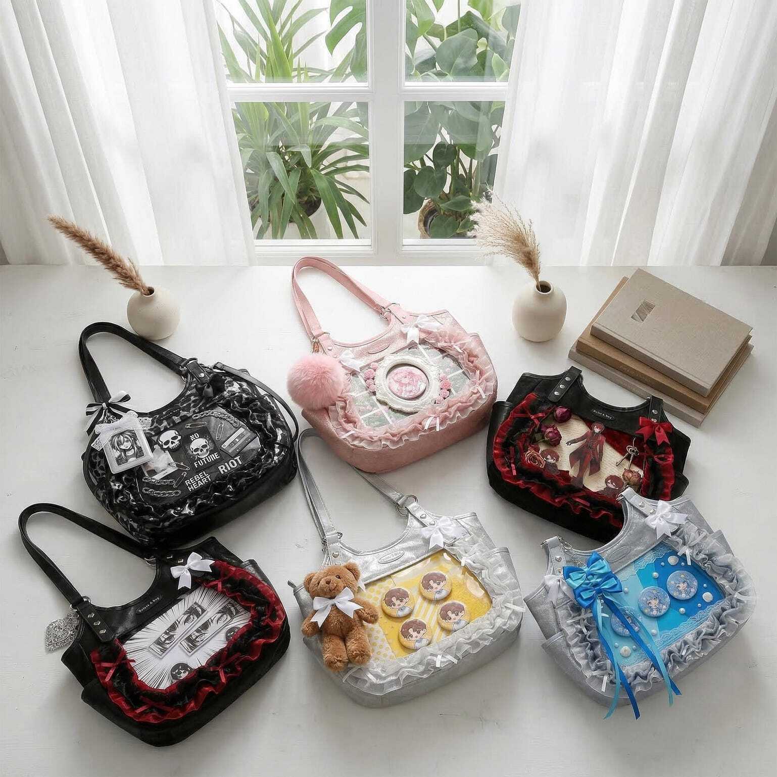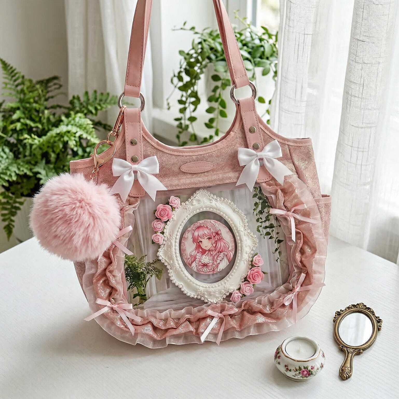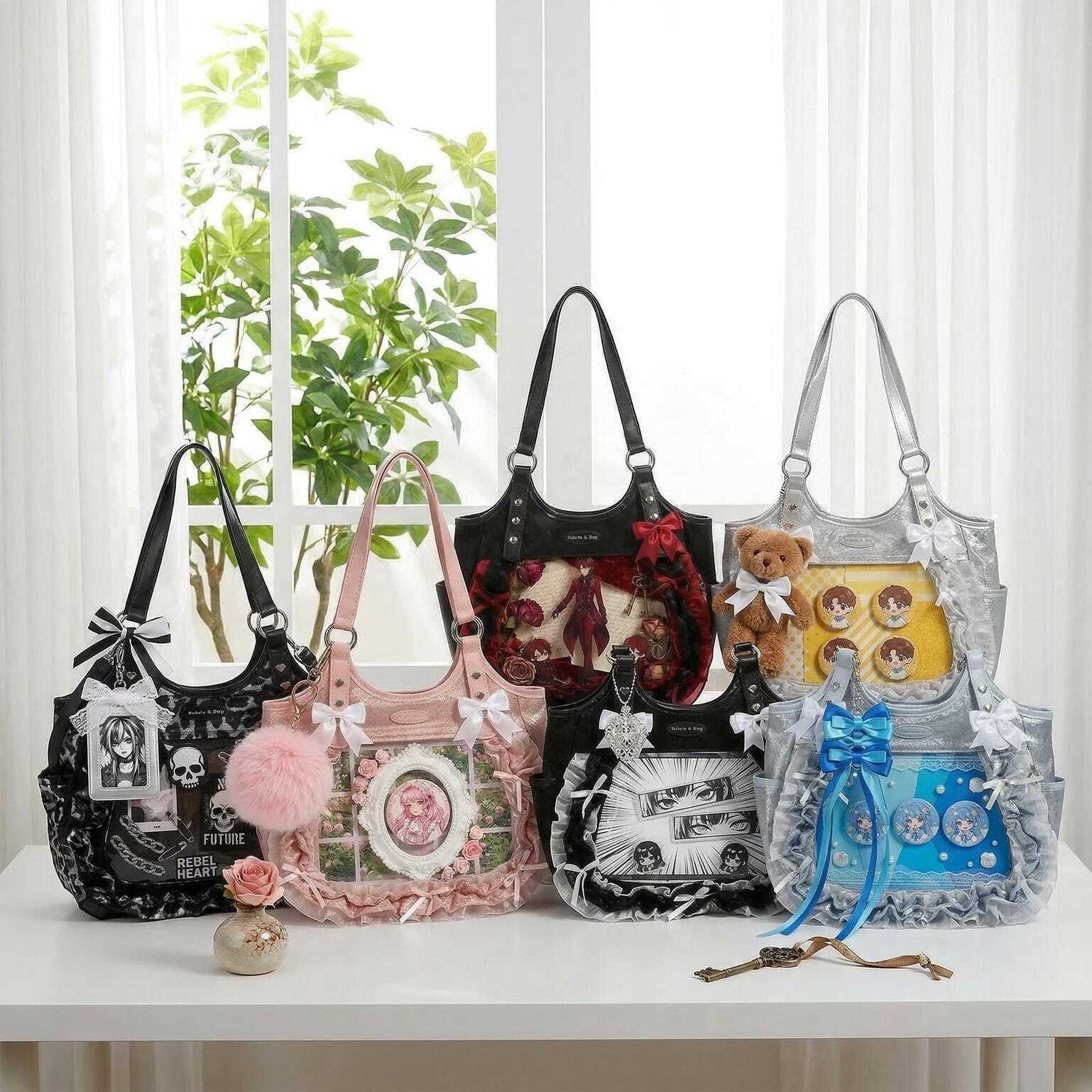 Kawaii Heart Ita Shoulder Bag with Clear Window for Pin Display combines everyday carry with a clear display area for pins, badges, charms, or character merch.