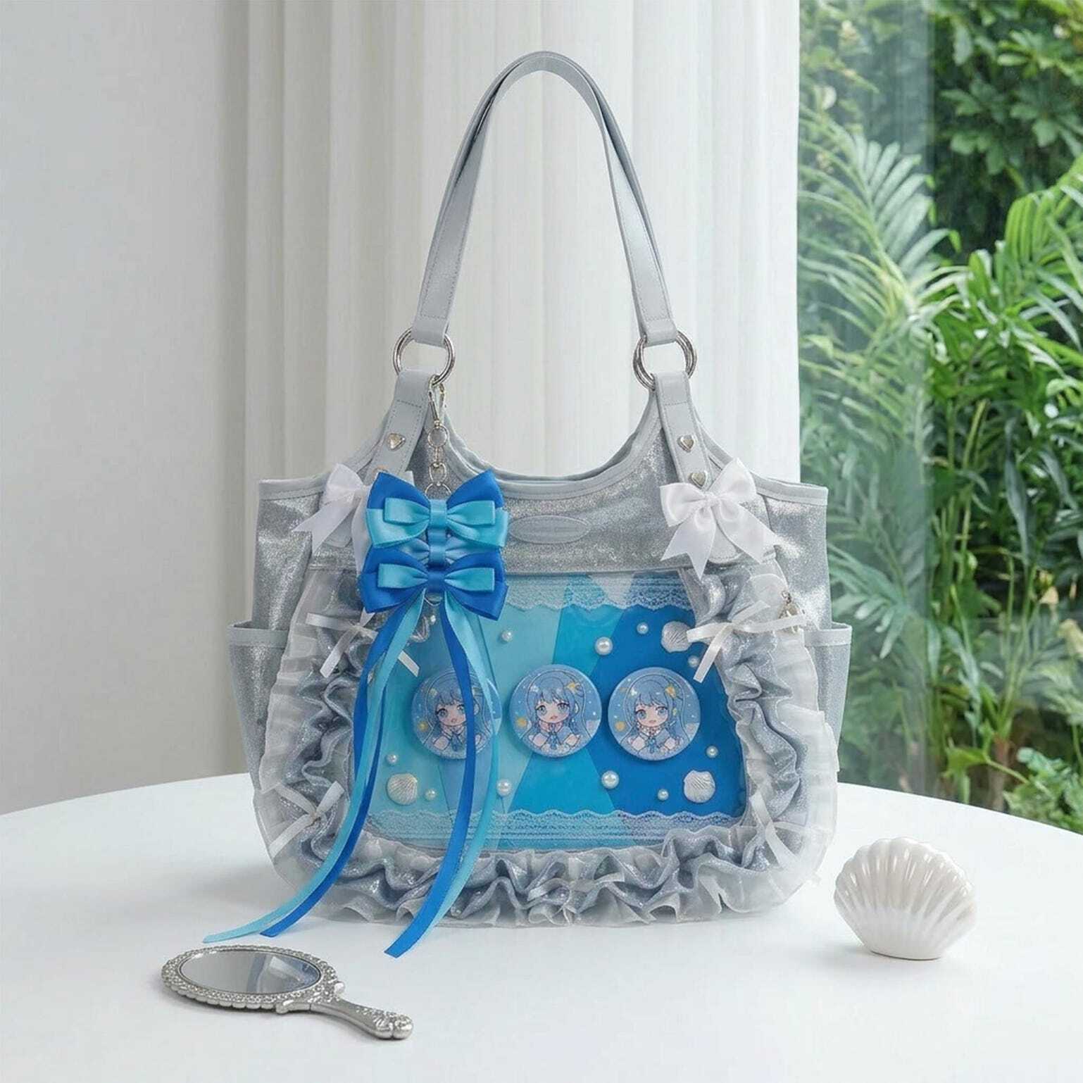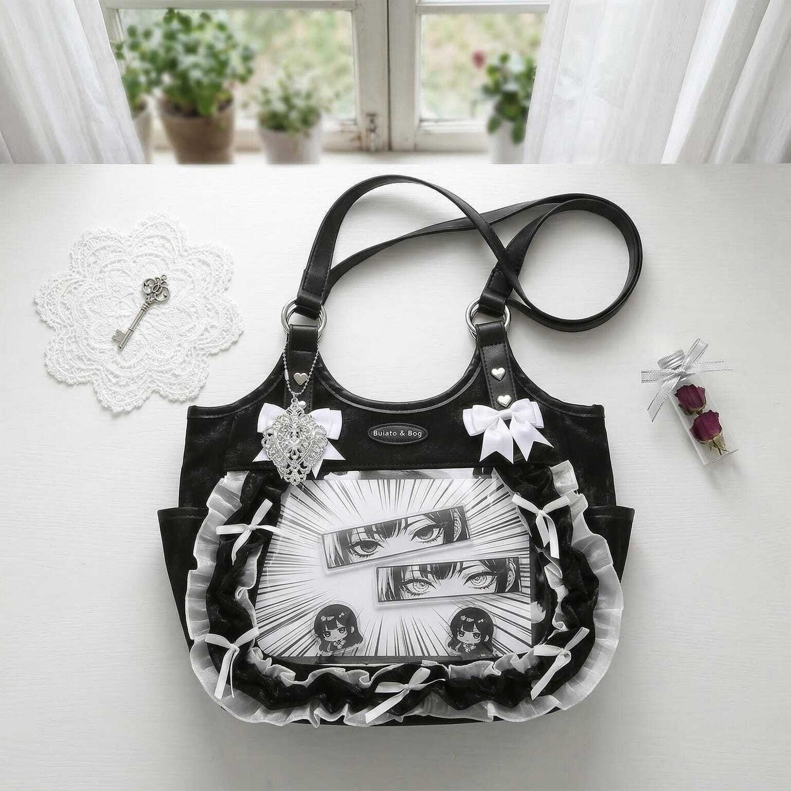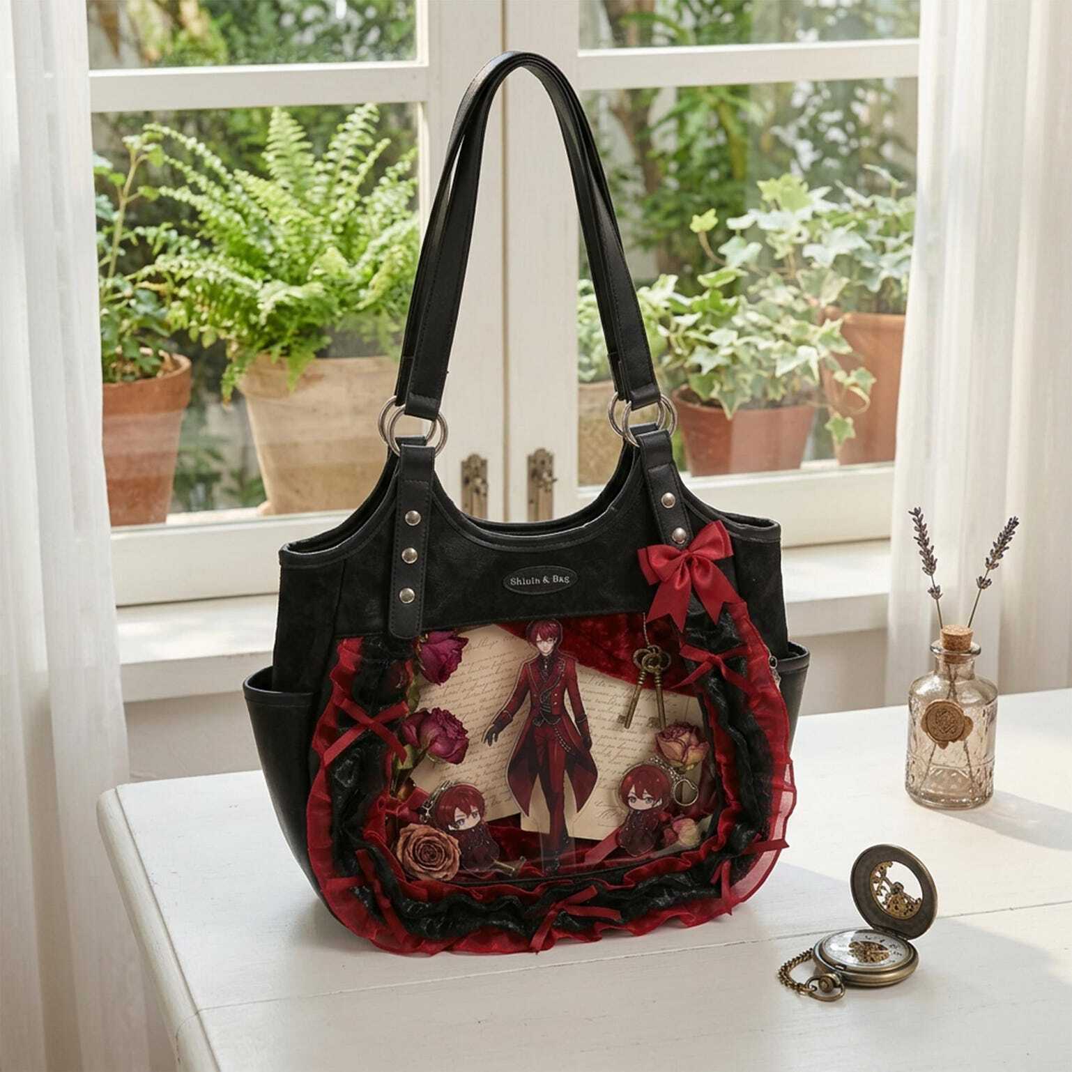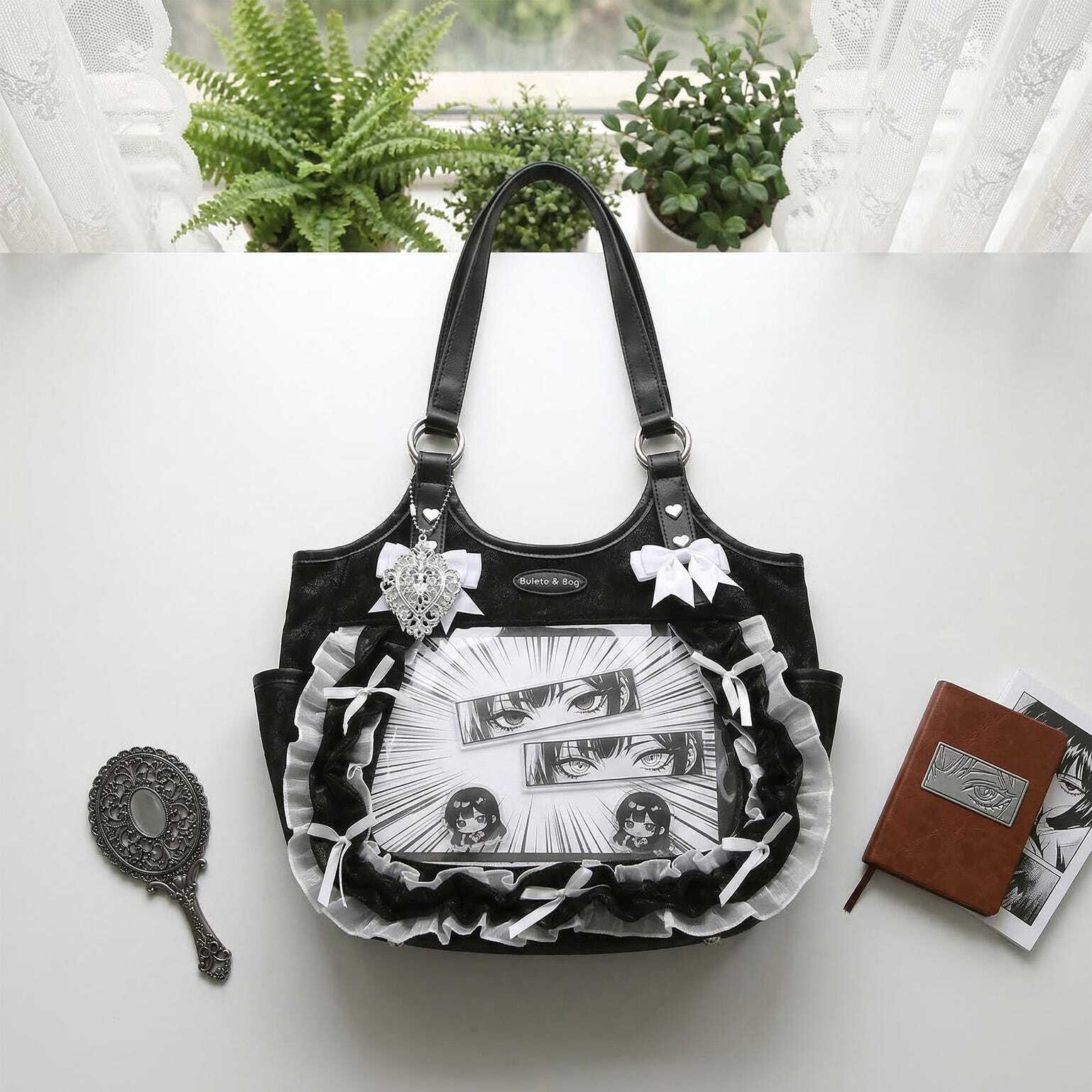 Kawaii Heart Ita Shoulder Bag with Clear Window for Pin Display combines everyday carry with a clear display area for pins, badges, charms, or character merch.
