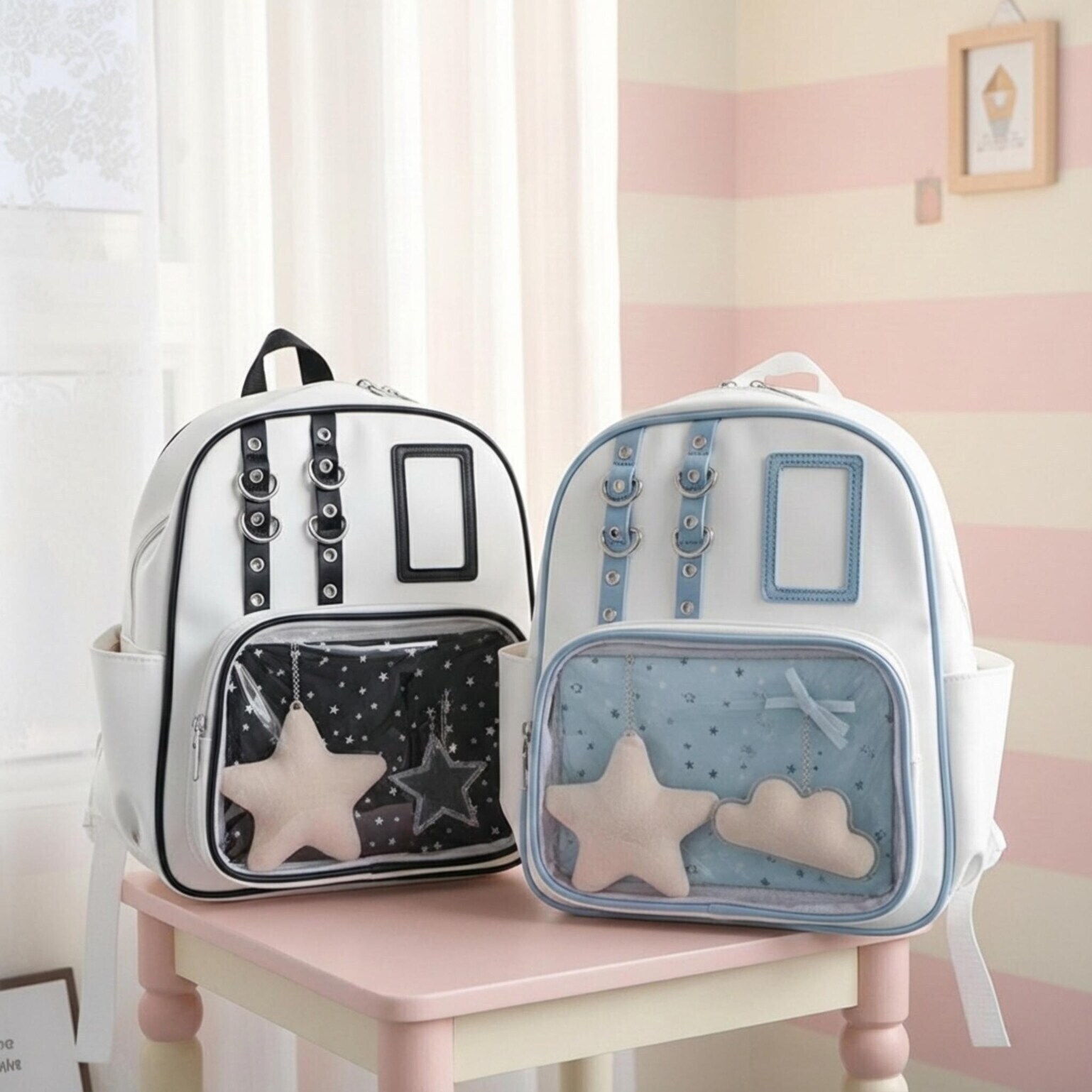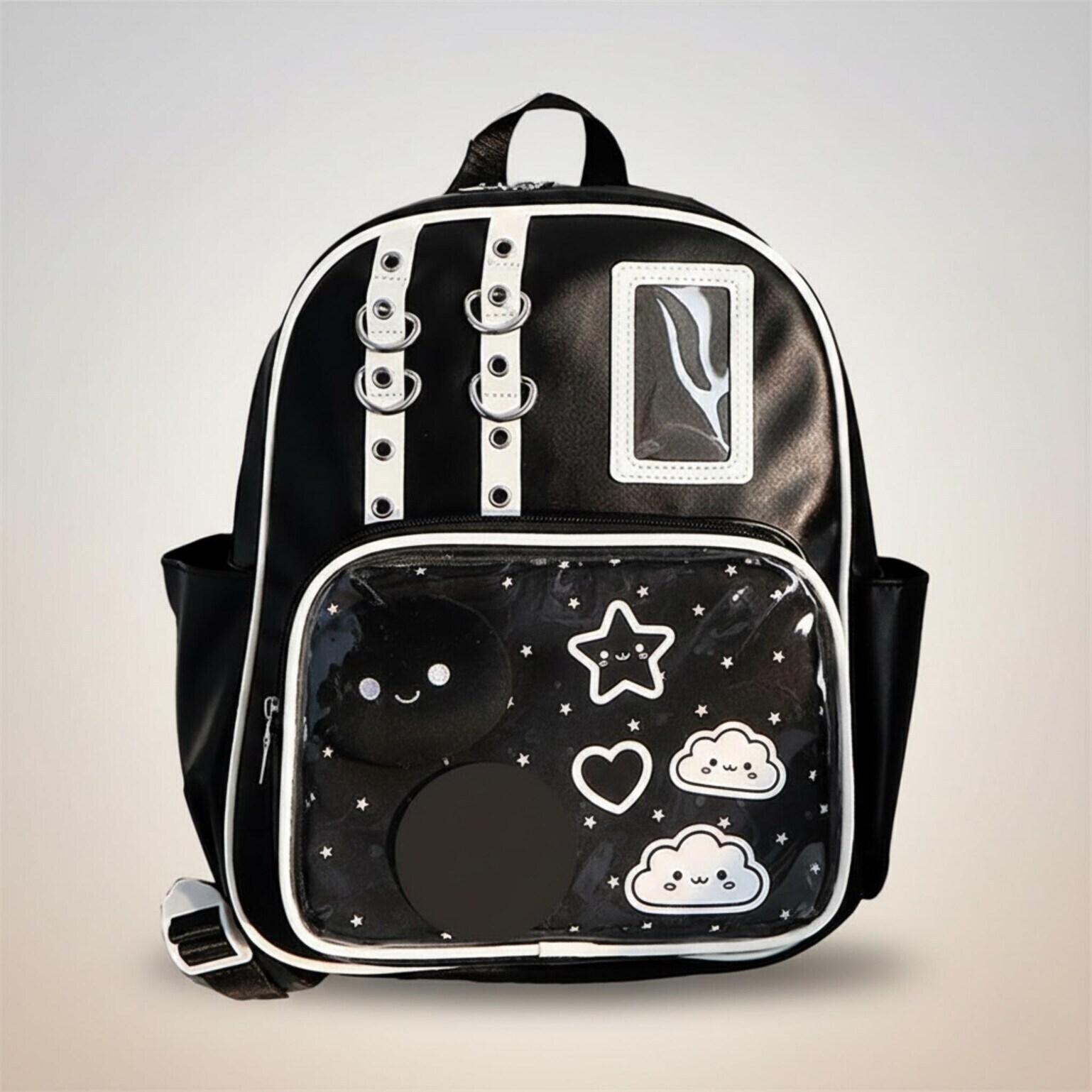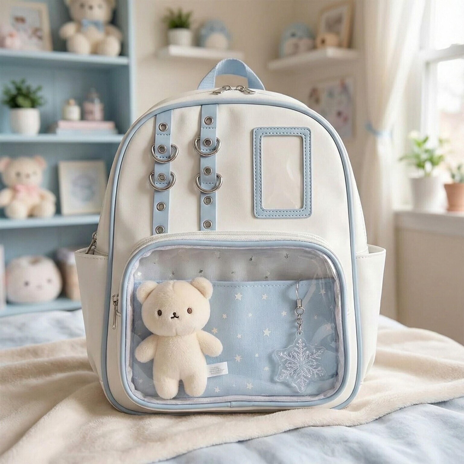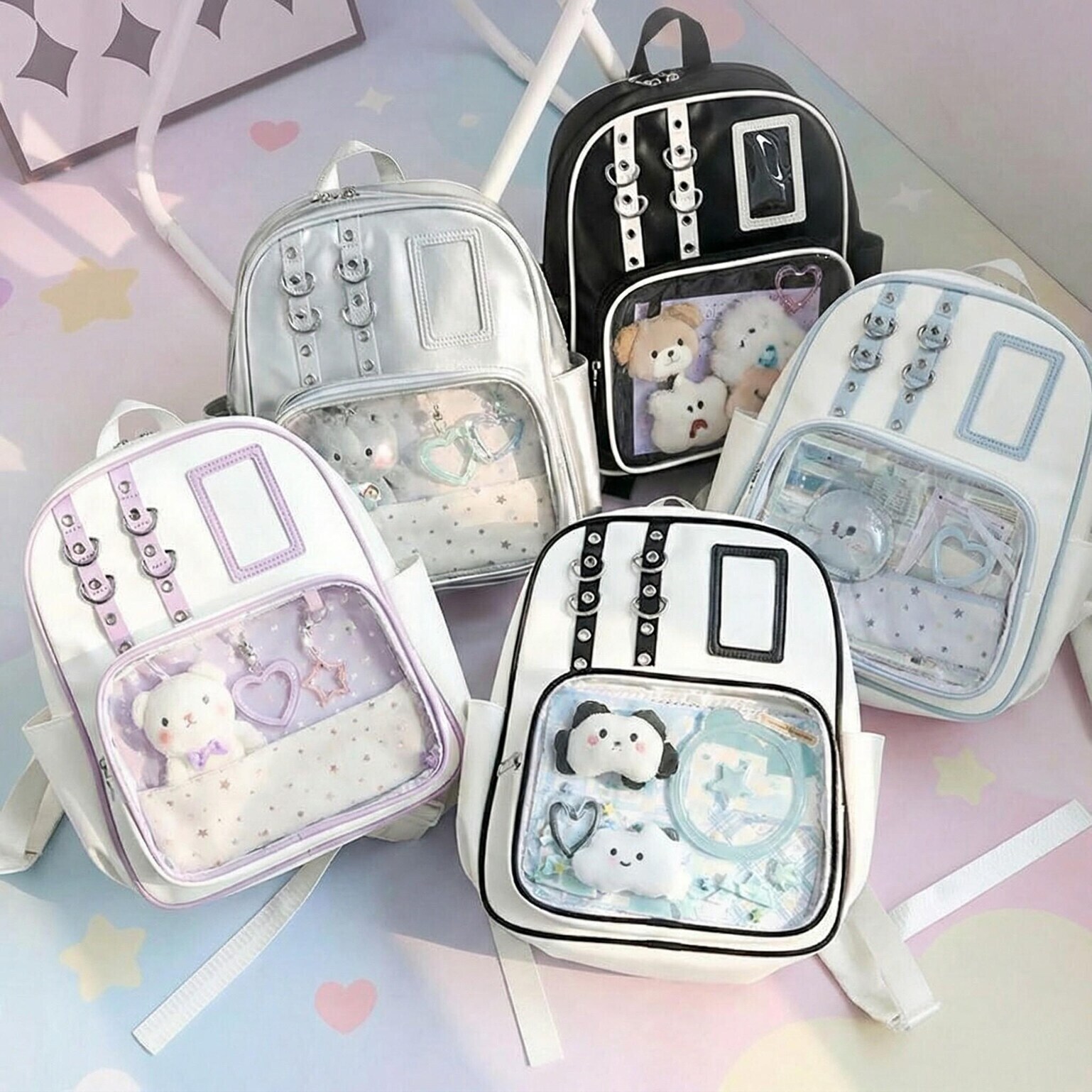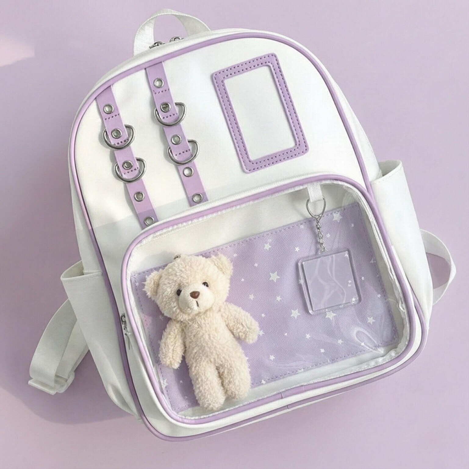Cute kawaii ita backpack with clear display pocket designed for pins, badges, photos, and charms