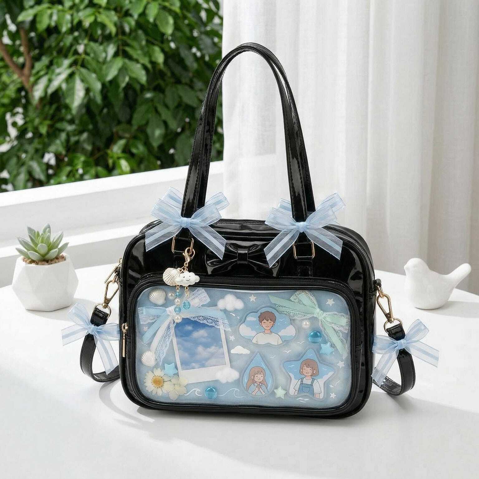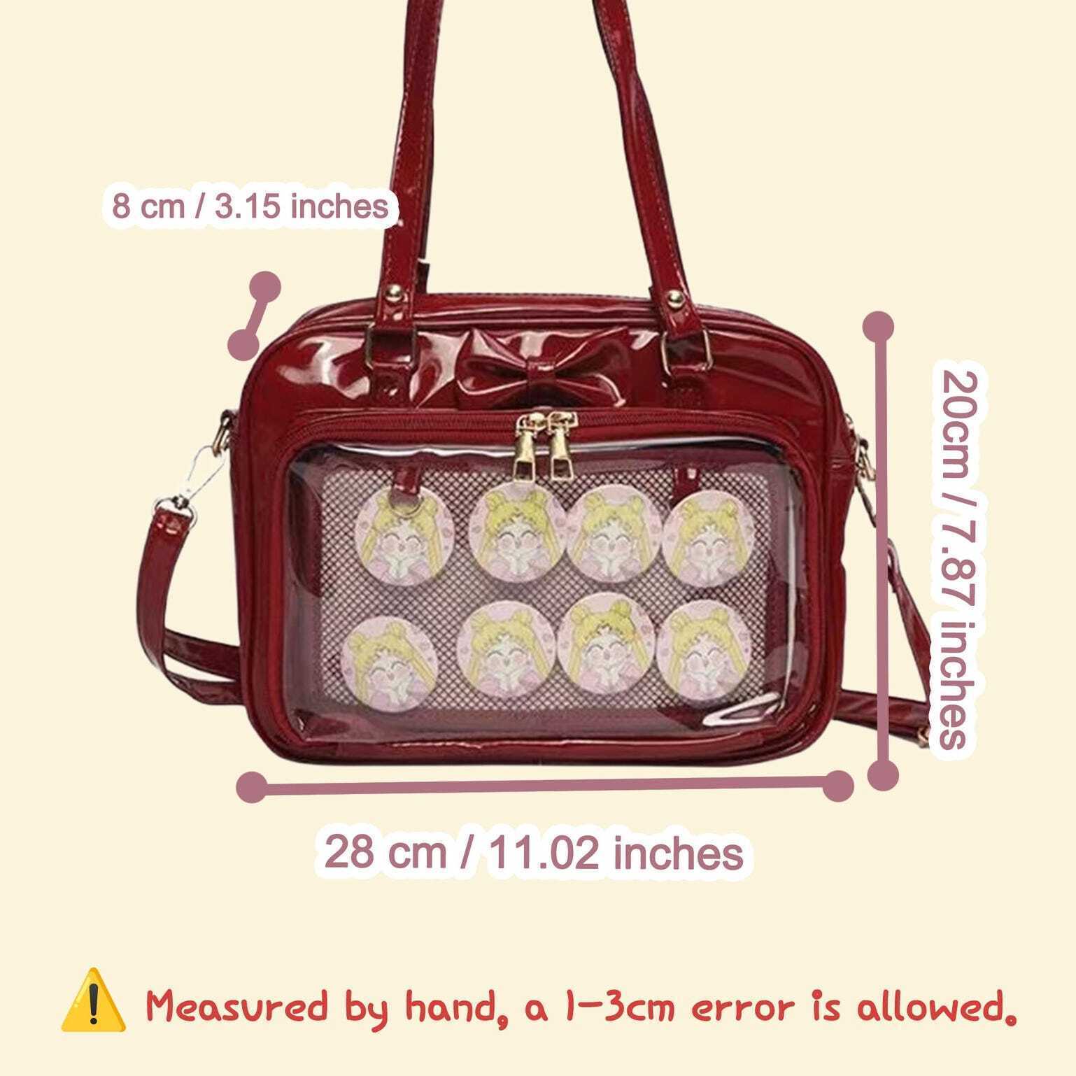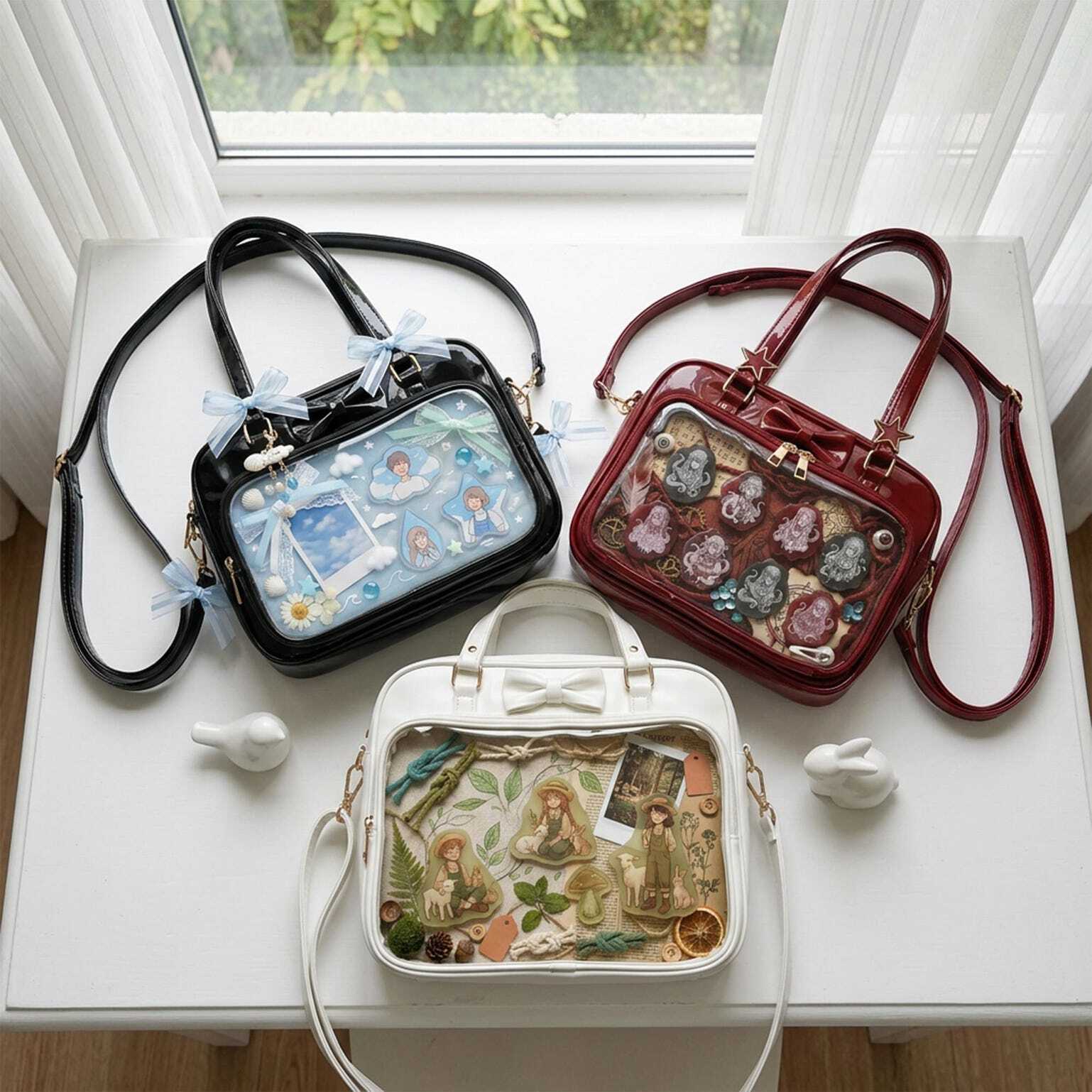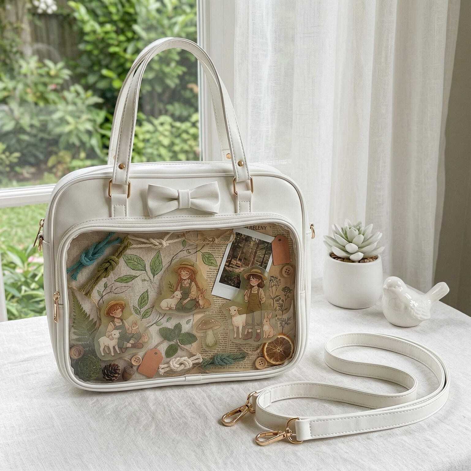 Kawaii Ita Shoulder Bag with Clear Window for Pin Display combines everyday carry with a clear display area for pins, badges, charms, or character merch.