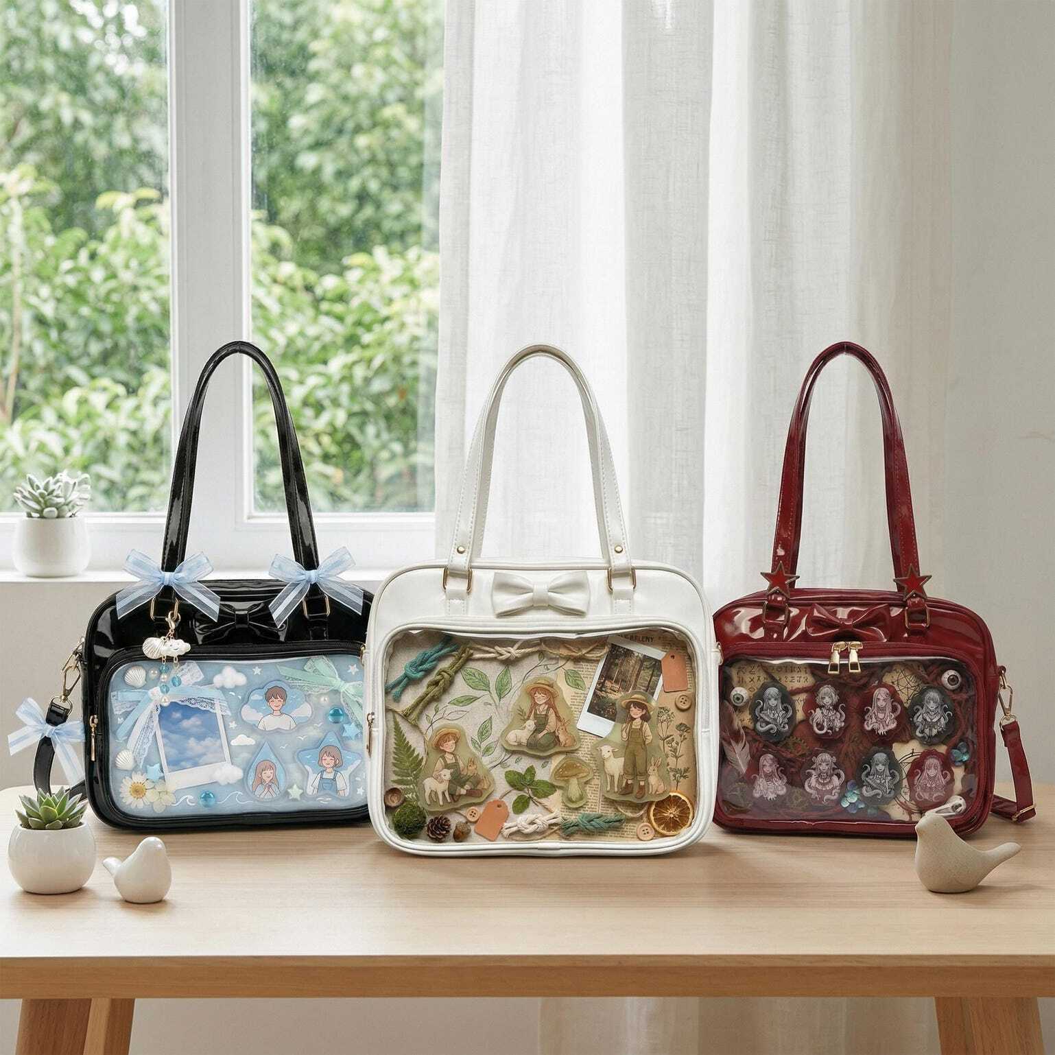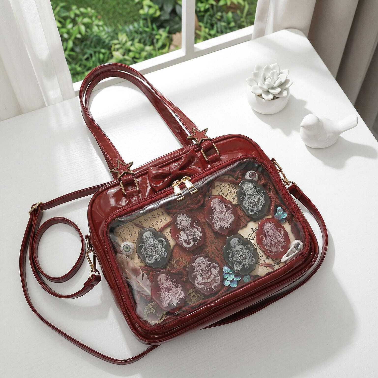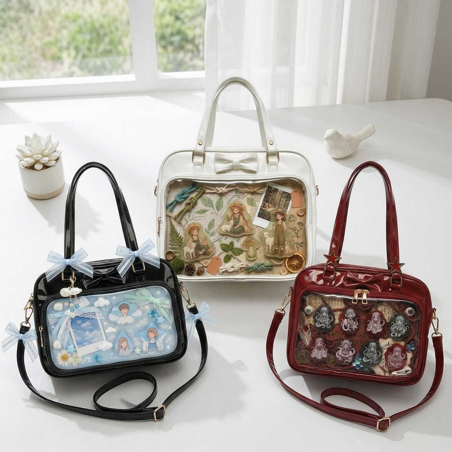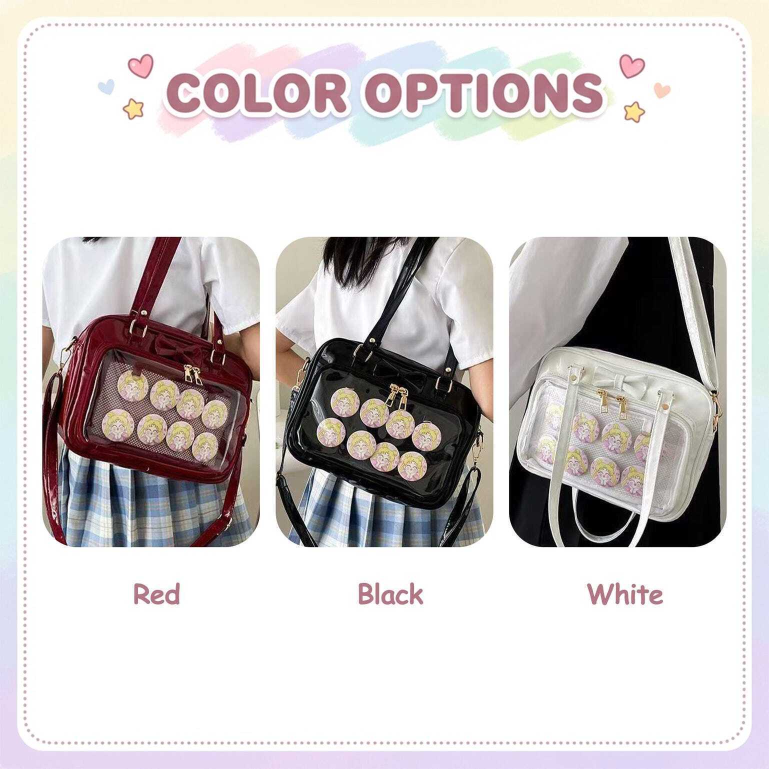 Kawaii Ita Shoulder Bag with Clear Window for Pin Display combines everyday carry with a clear display area for pins, badges, charms, or character merch.