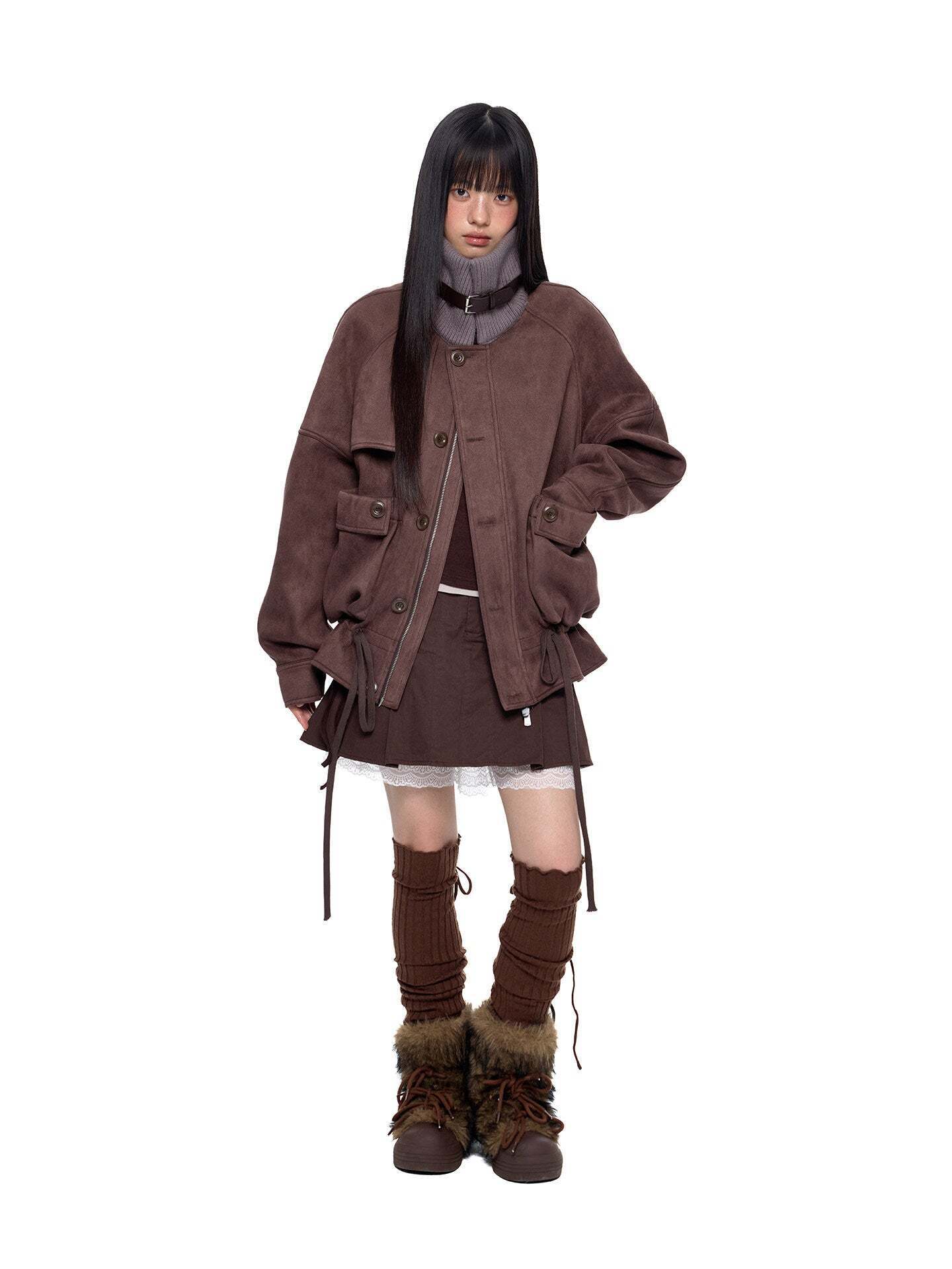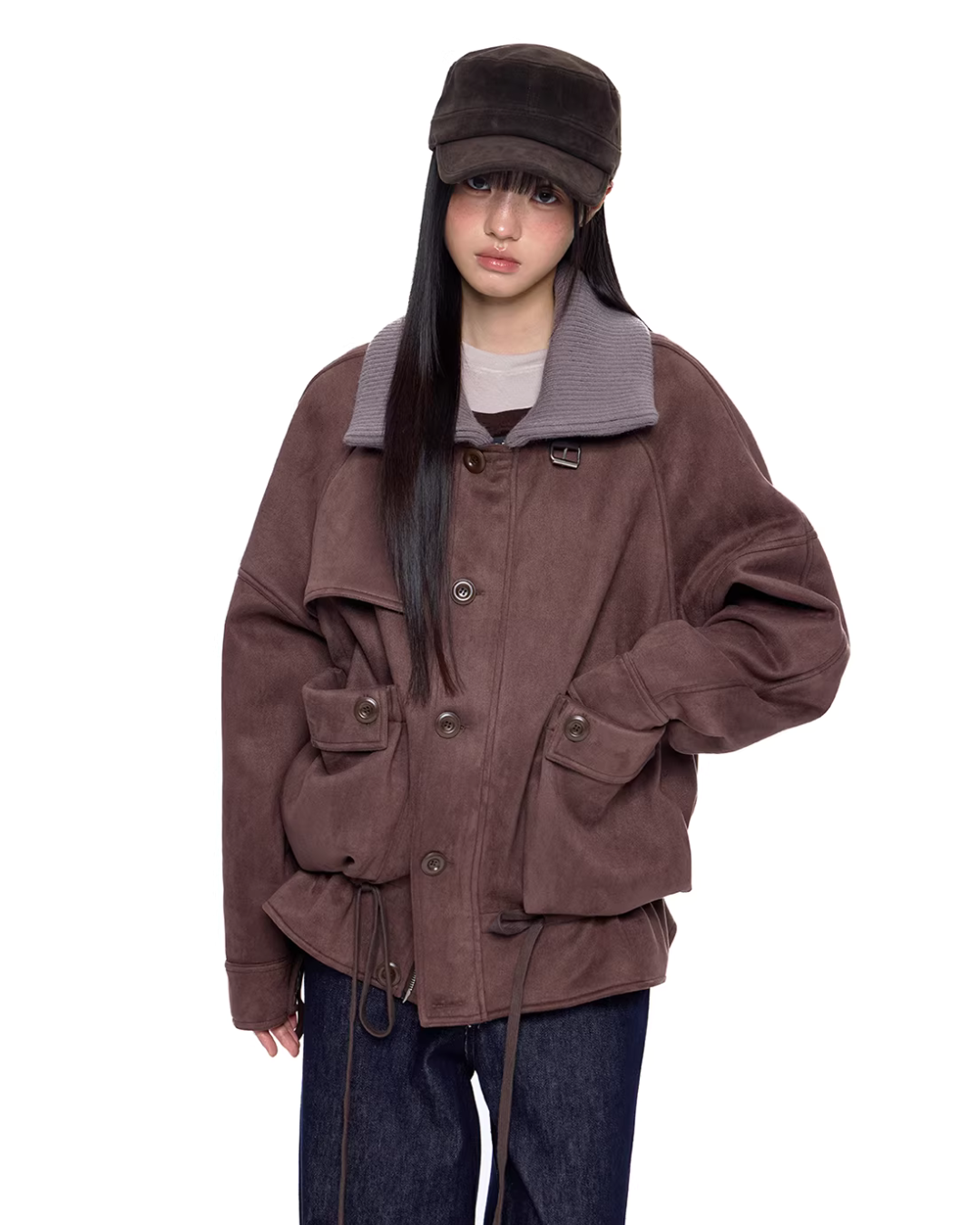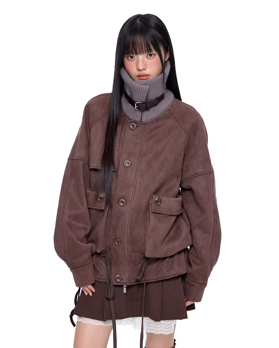 A jacket made of smooth suede-like material with a vintage feel.
