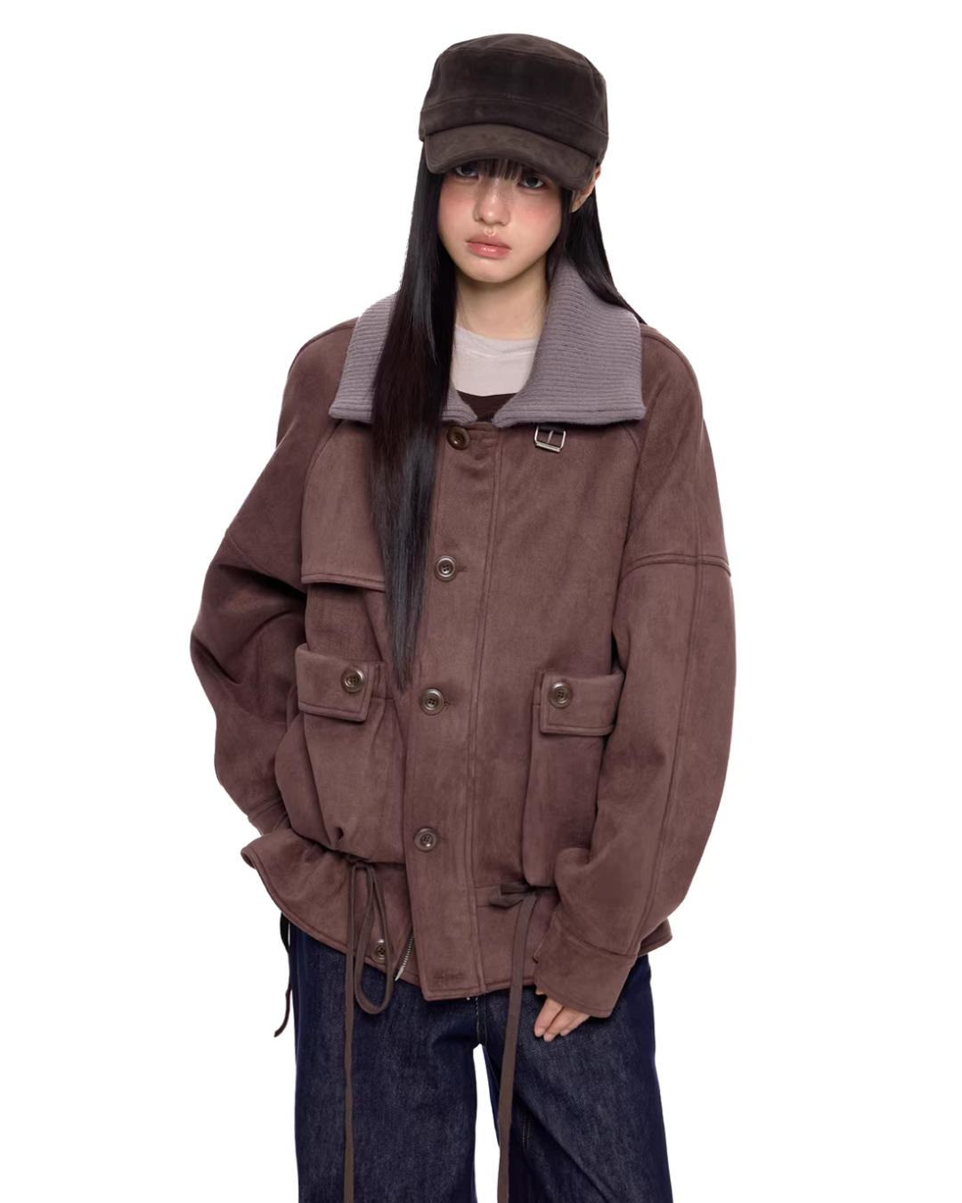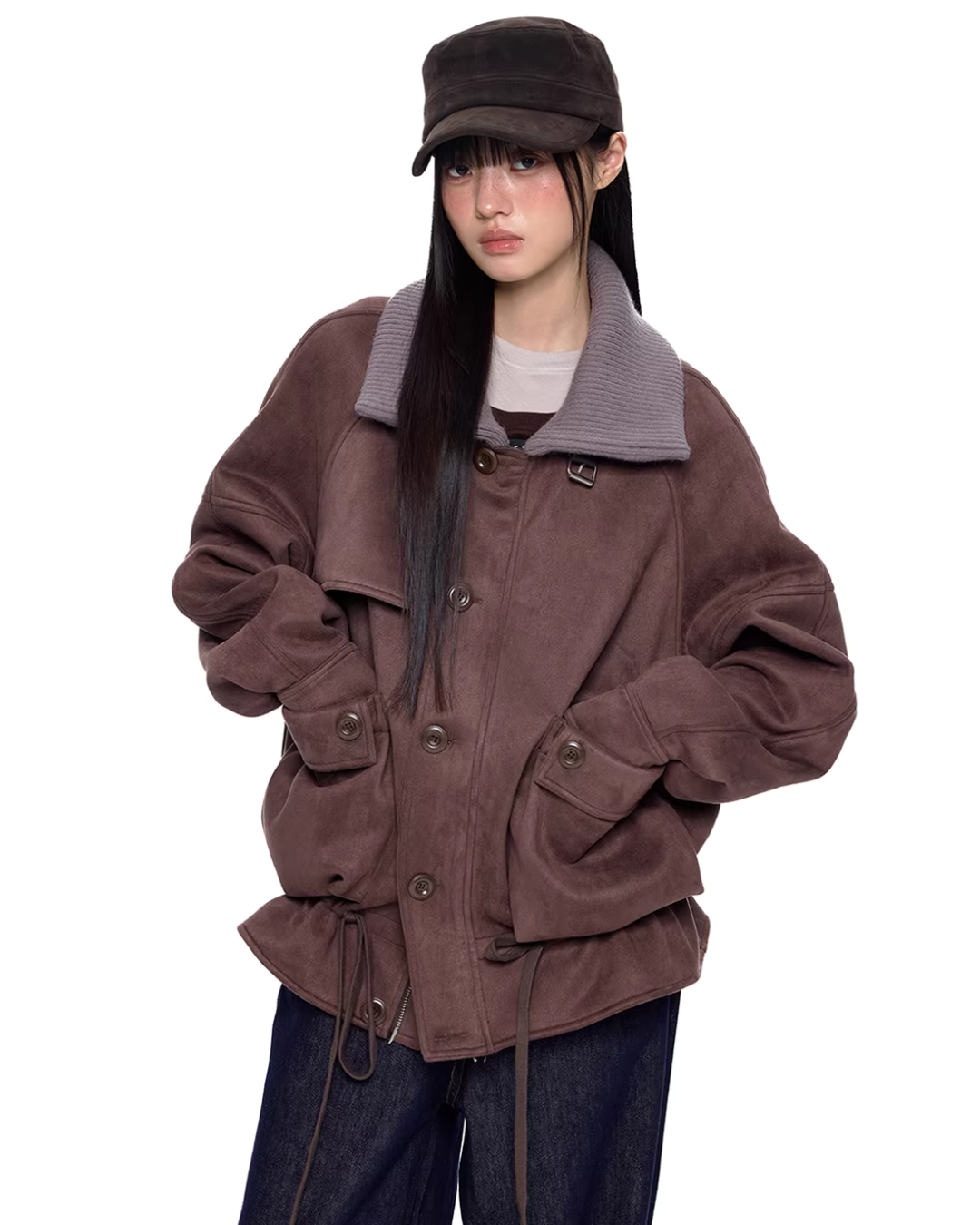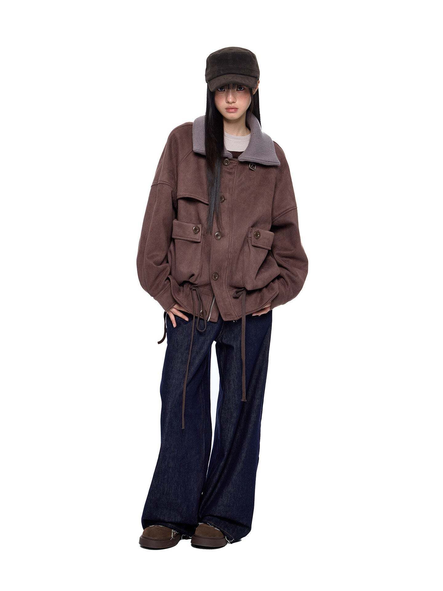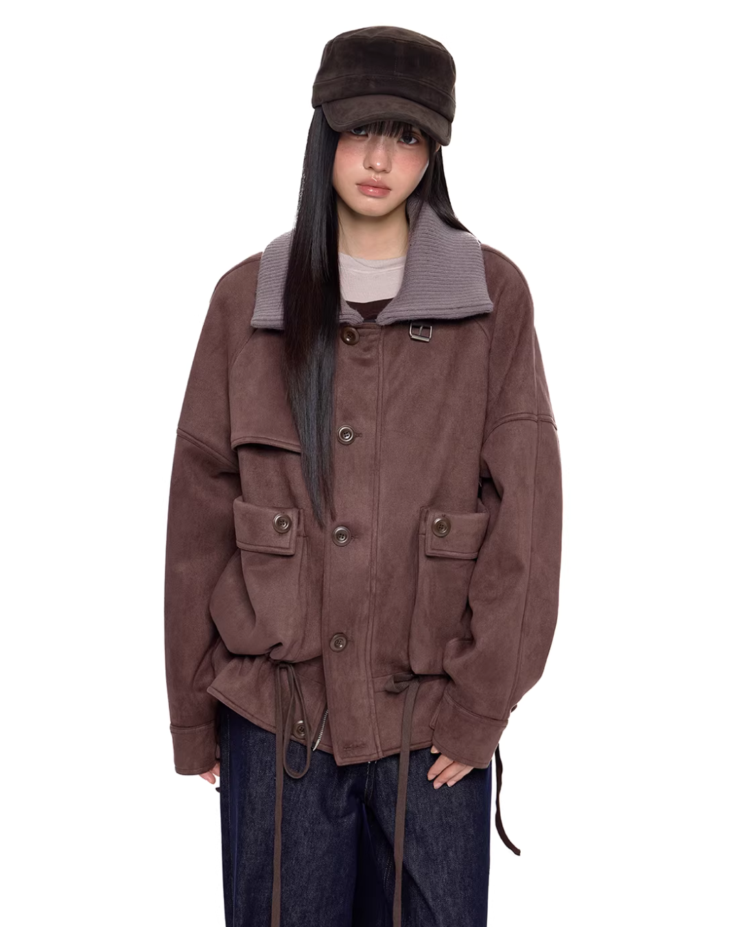 A jacket made of smooth suede-like material with a vintage feel.