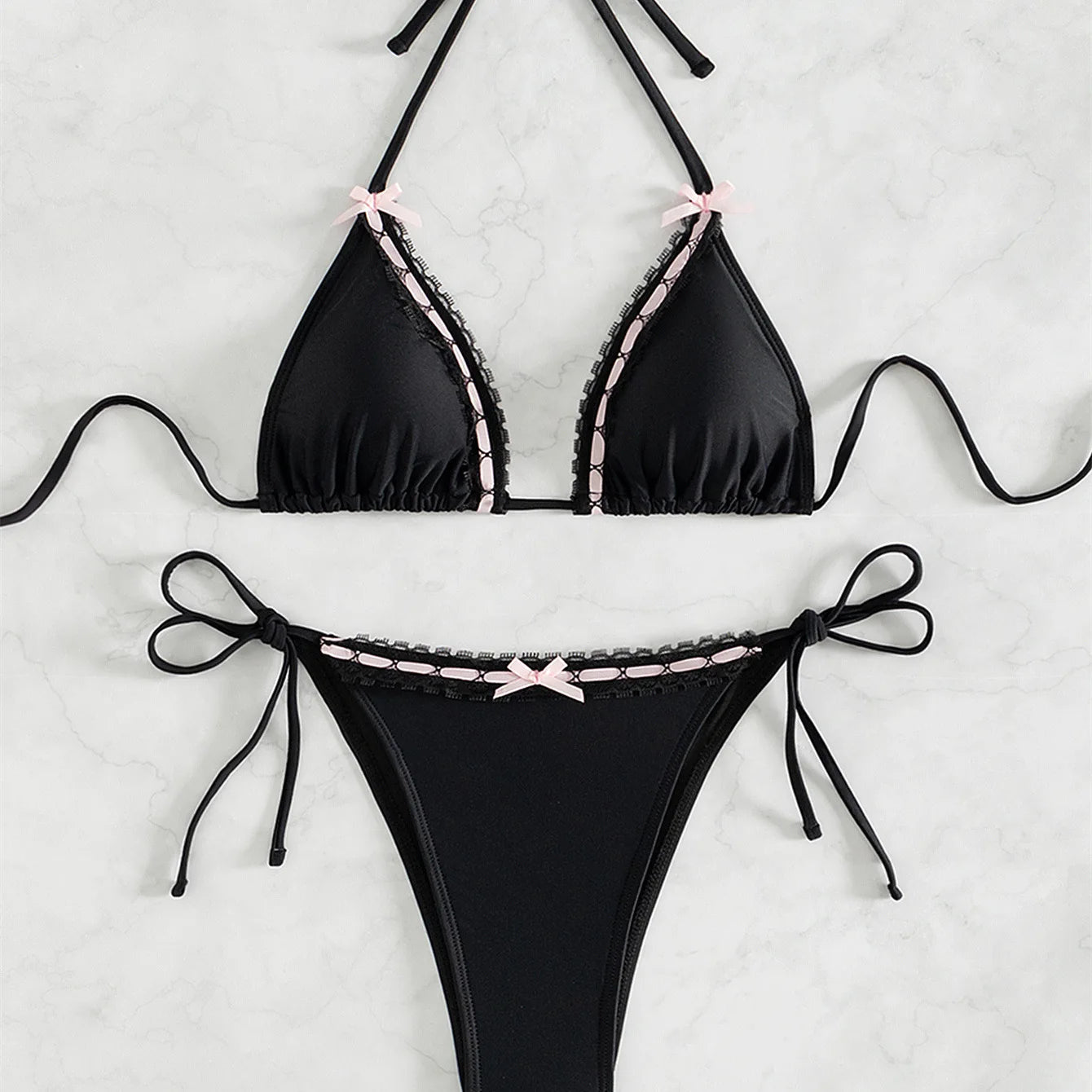 The Lace Bow Bikini Set is designed as a two piece swim set featuring a classic triangle bikini top finished with delicate lace trim and small bow accents. The halter neck and back ties allow an adjustable fit while keeping the silhouette minimal and feminine. The matching bikini bottom includes tie side straps and a coordinating bow detail that highlights the waistline. Crafted from stretch swim fabric, this bikini set offers comfort and flexibility for beachwear, vacation styling, and poolside looks.